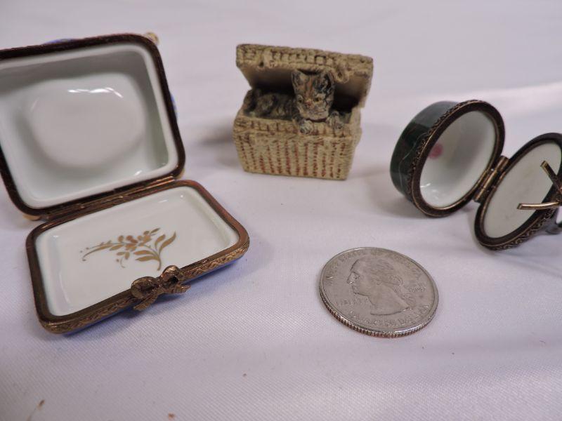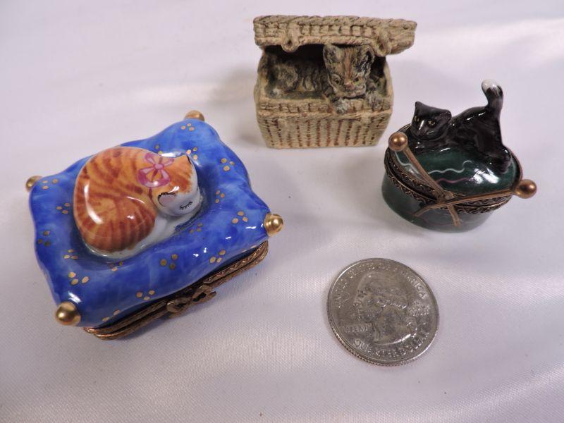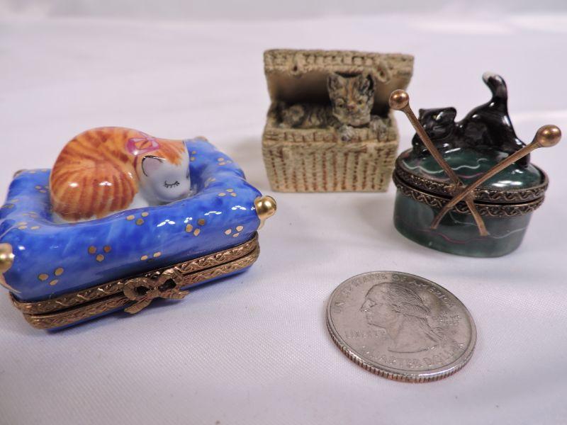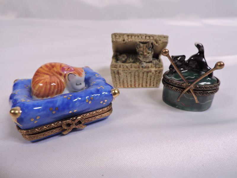 Three small china cat boxes. **Please read Terms and Conditions before placing a bid. Pick up is Sunday, November 24 from 9am to 3pm or Tuesday, November 26 from 4pm-7pm in Mantua, NJ. All sales are final. All sales are as is, where is. Please review all photos. Any props included in photos are not included in listing. All measurements are approximate.
