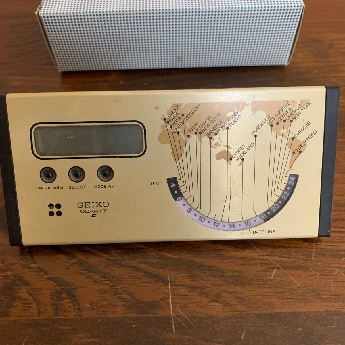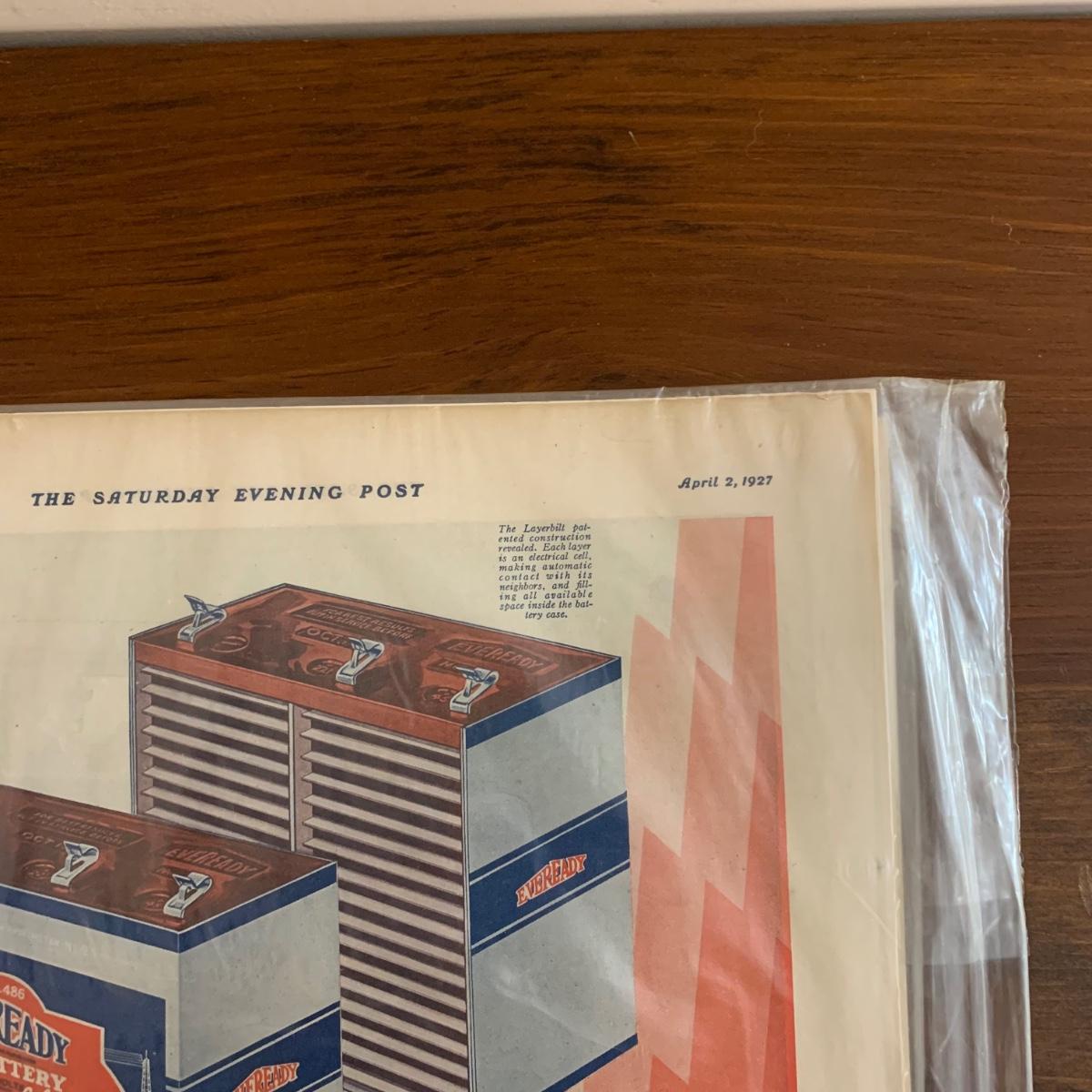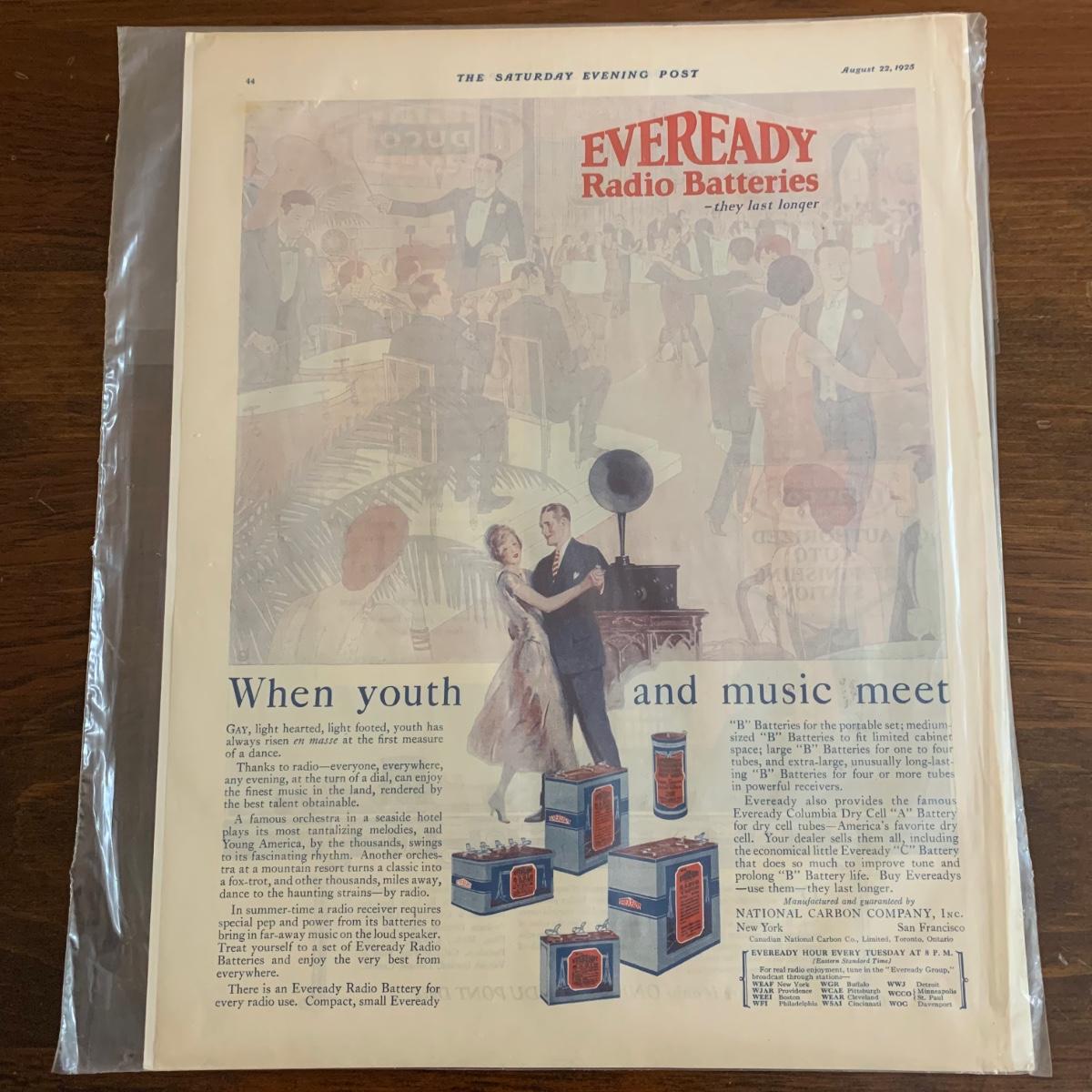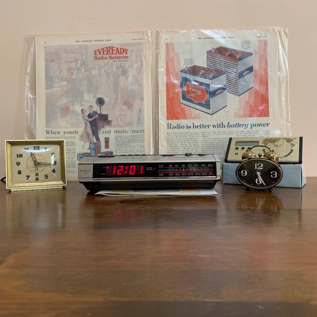 Four clocks and two prints/ads. This collection includes a Realistic brand Chronomatic-252 electronic clock radio, a Linden Blackforest wind up clock, a General Electric analog clock (electric), and Seiko Quartz clock, as well as two Eveready newspaper ads/prints in plastic sheet covers. Seiko Quartz clock will require a new battery, all other clocks are fully functioning. Eveready Radio Battery ads are from August 22, 1925 and April 2, 1927. They measure, 11”L x 14”W. All items appear to be in good condition. Please see photos for details.