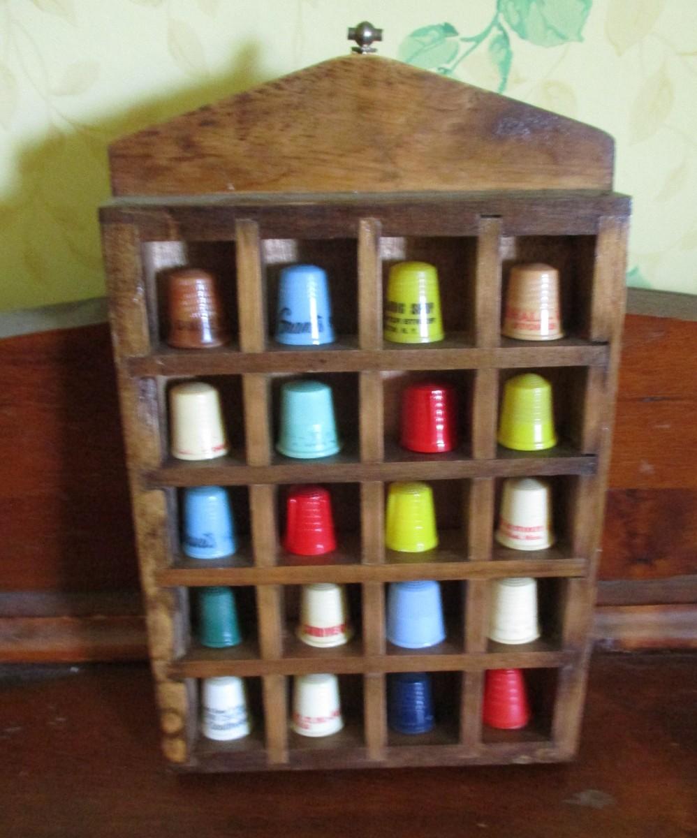 Collection of Vintage Colorful Souvenir Thimbles on Wood Display