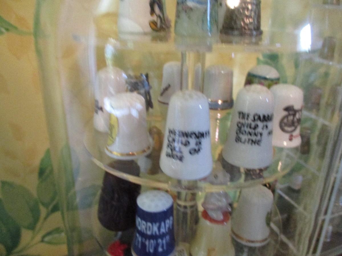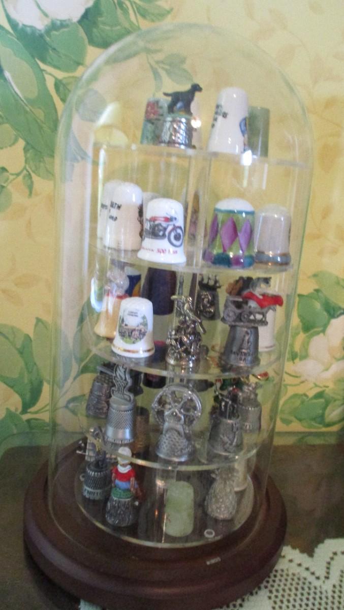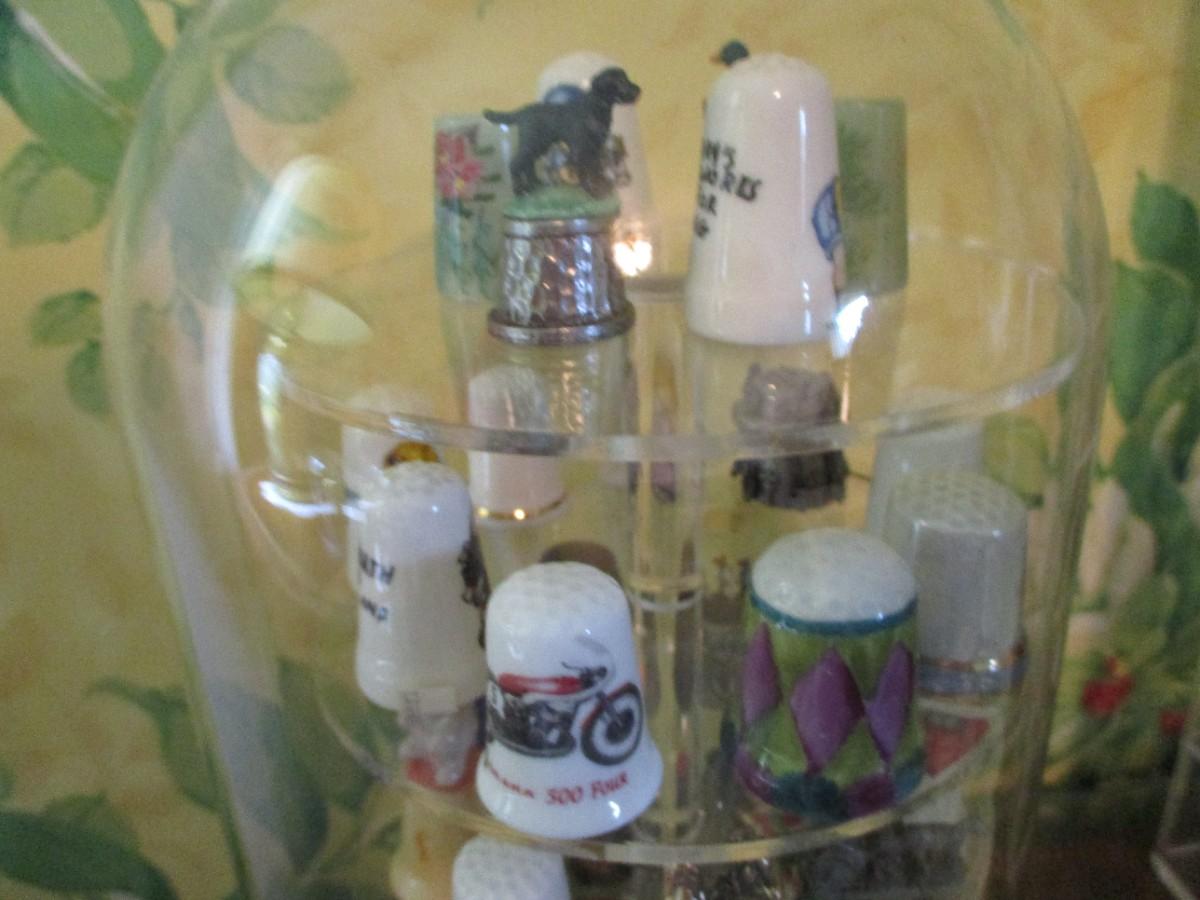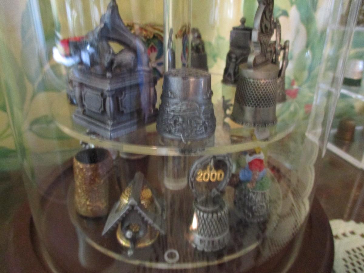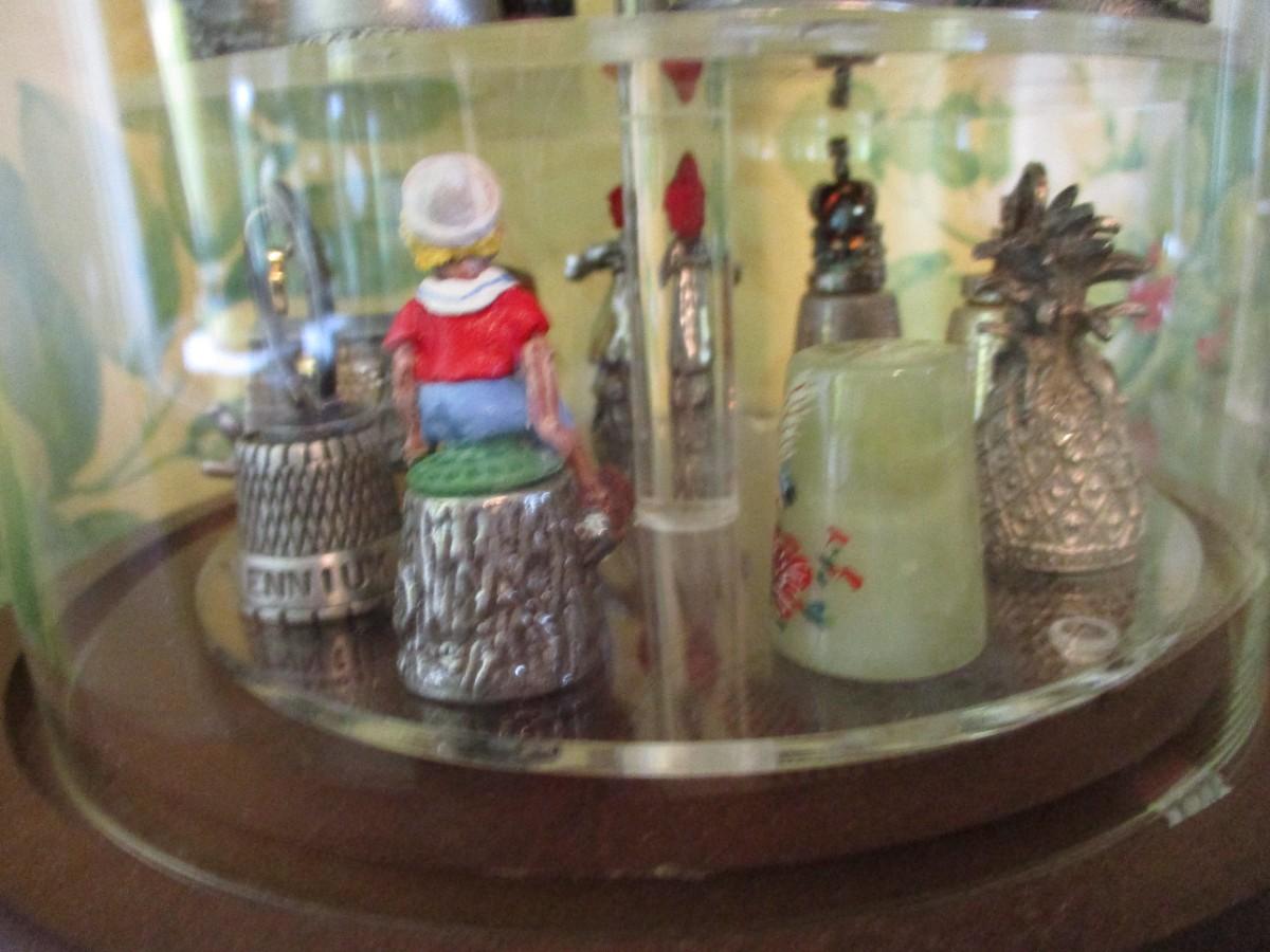 Collection of Vintage Commemorative and Figural Thimbles in Glass Dome Display