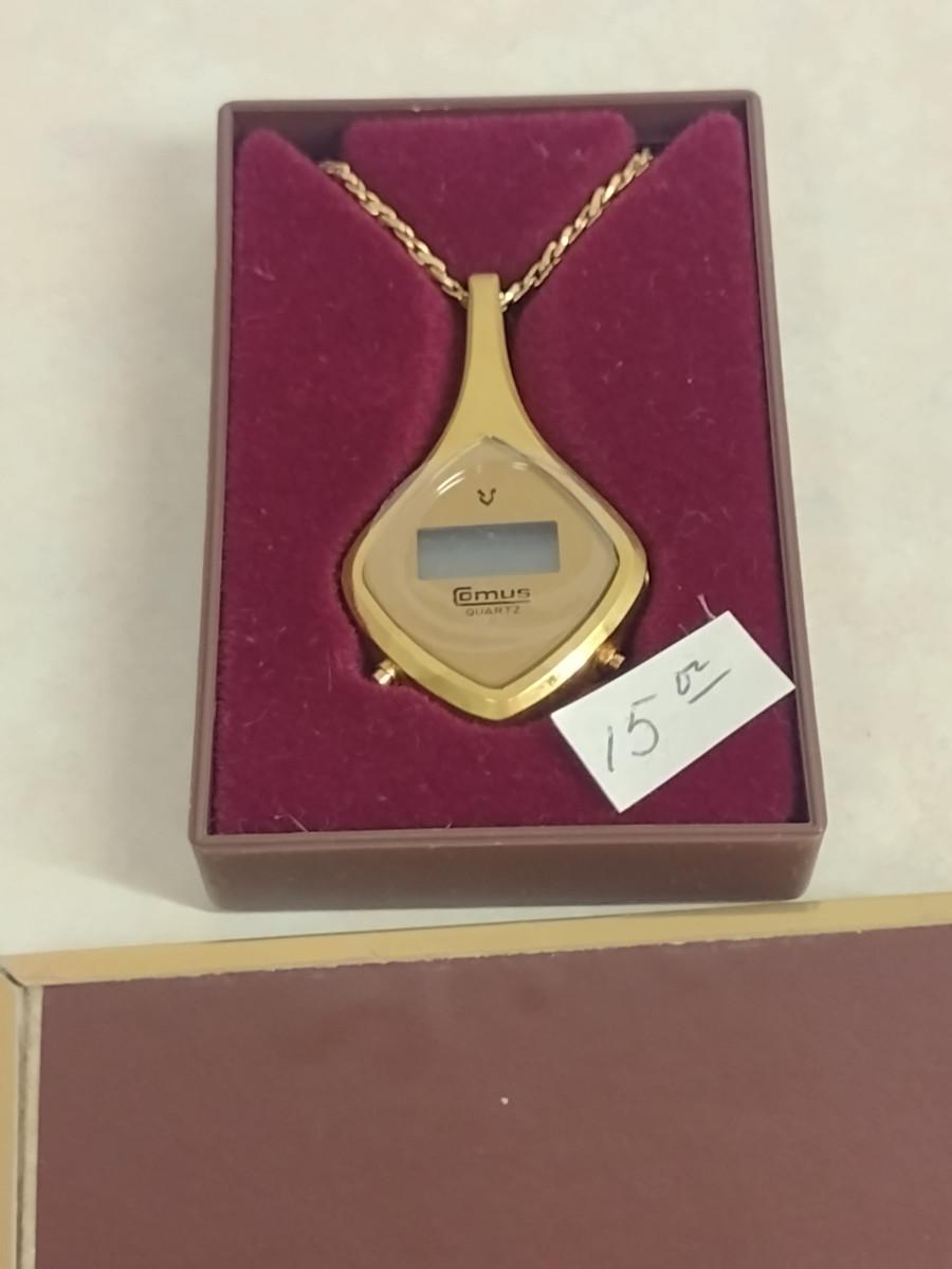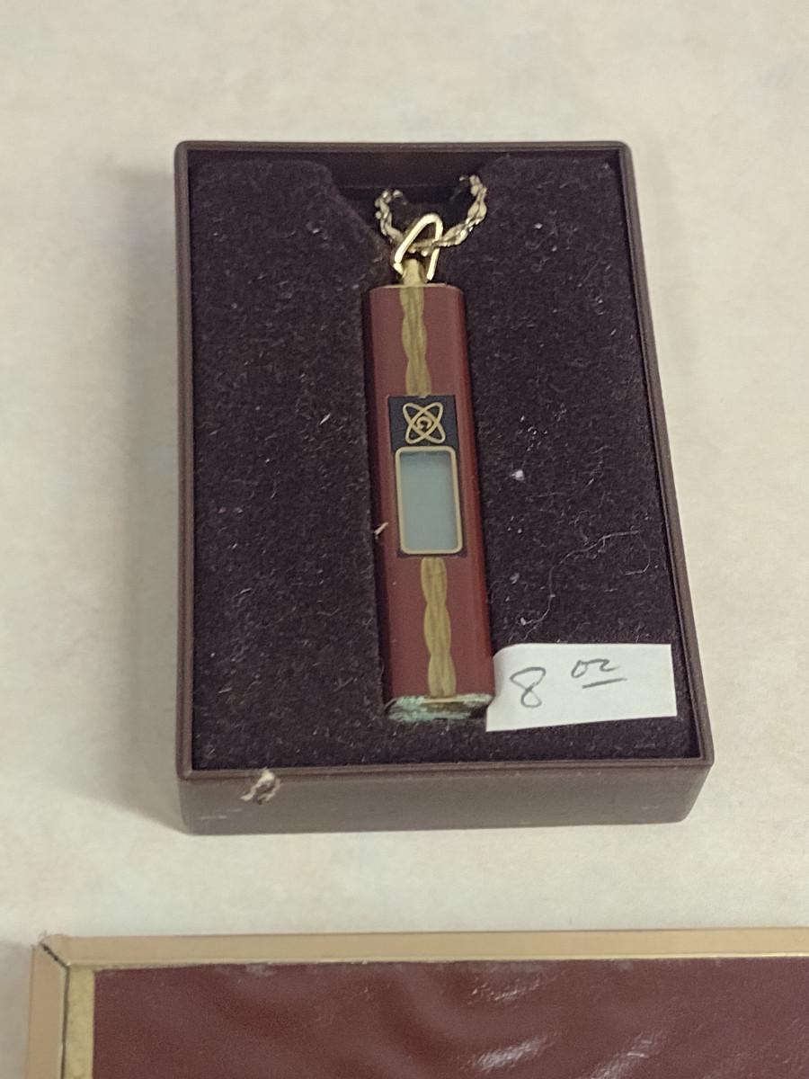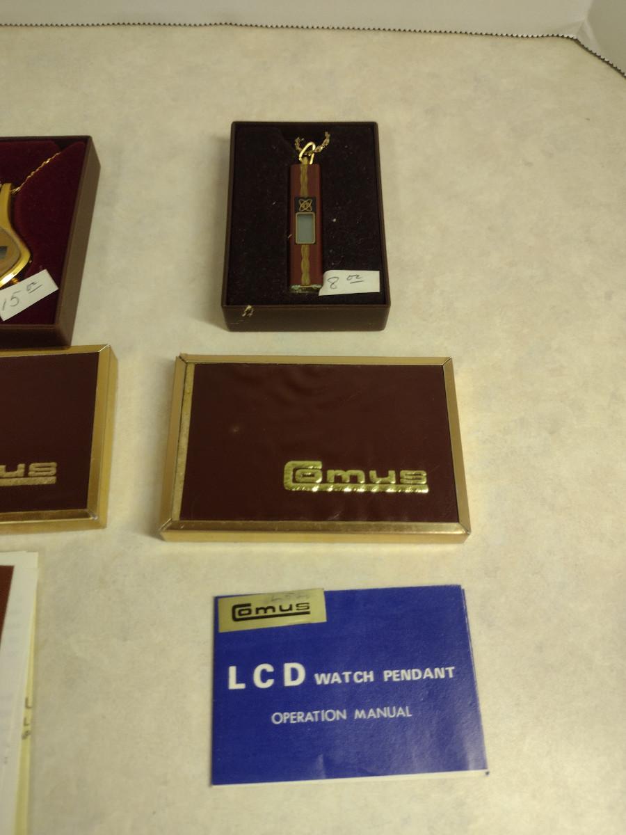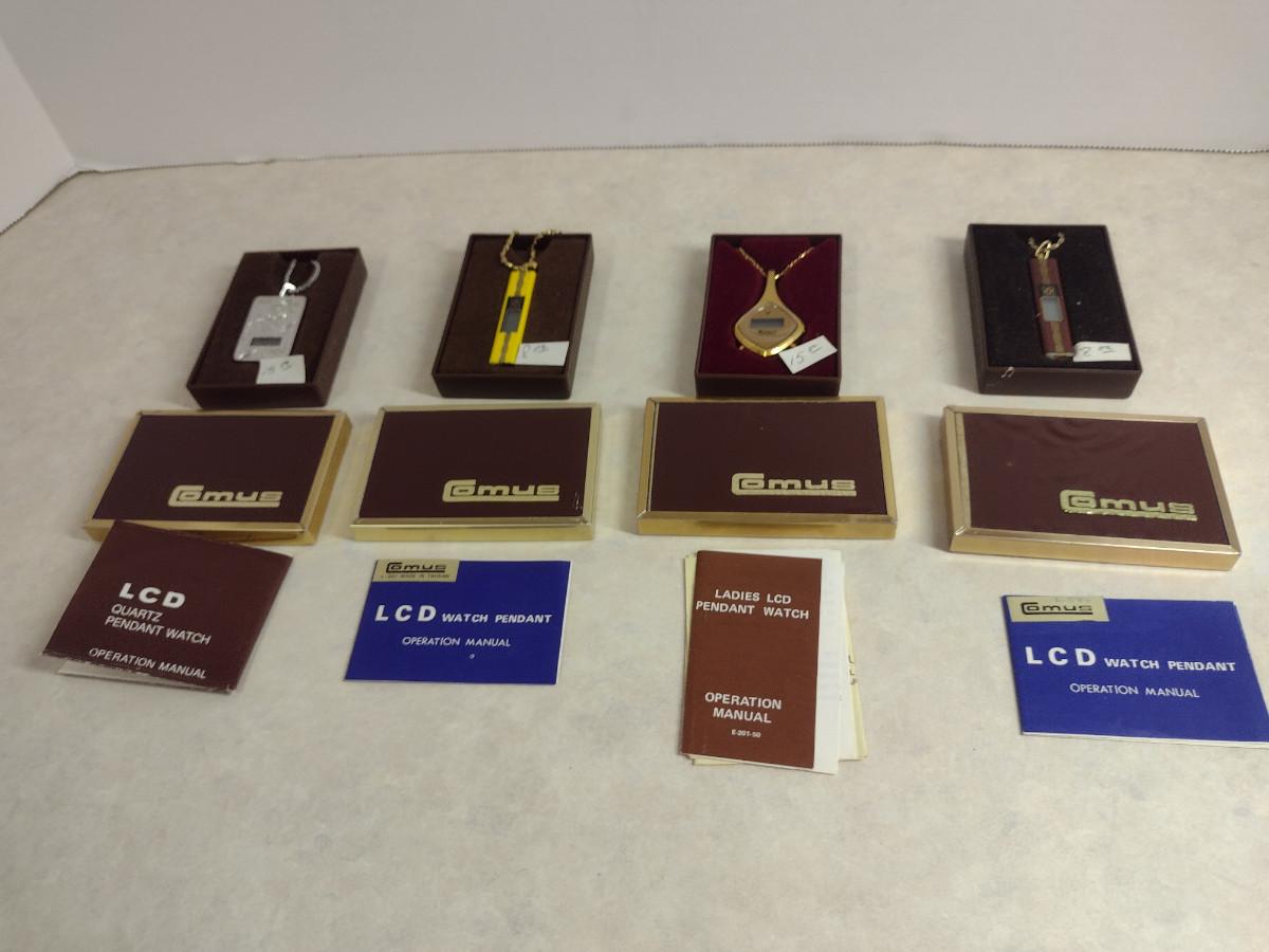 Collection of Vintage Comus Necklace Clock Pendants- Four Pieces (#14). Items are new in box, but are not functioning. Possibly need batteries because of age.