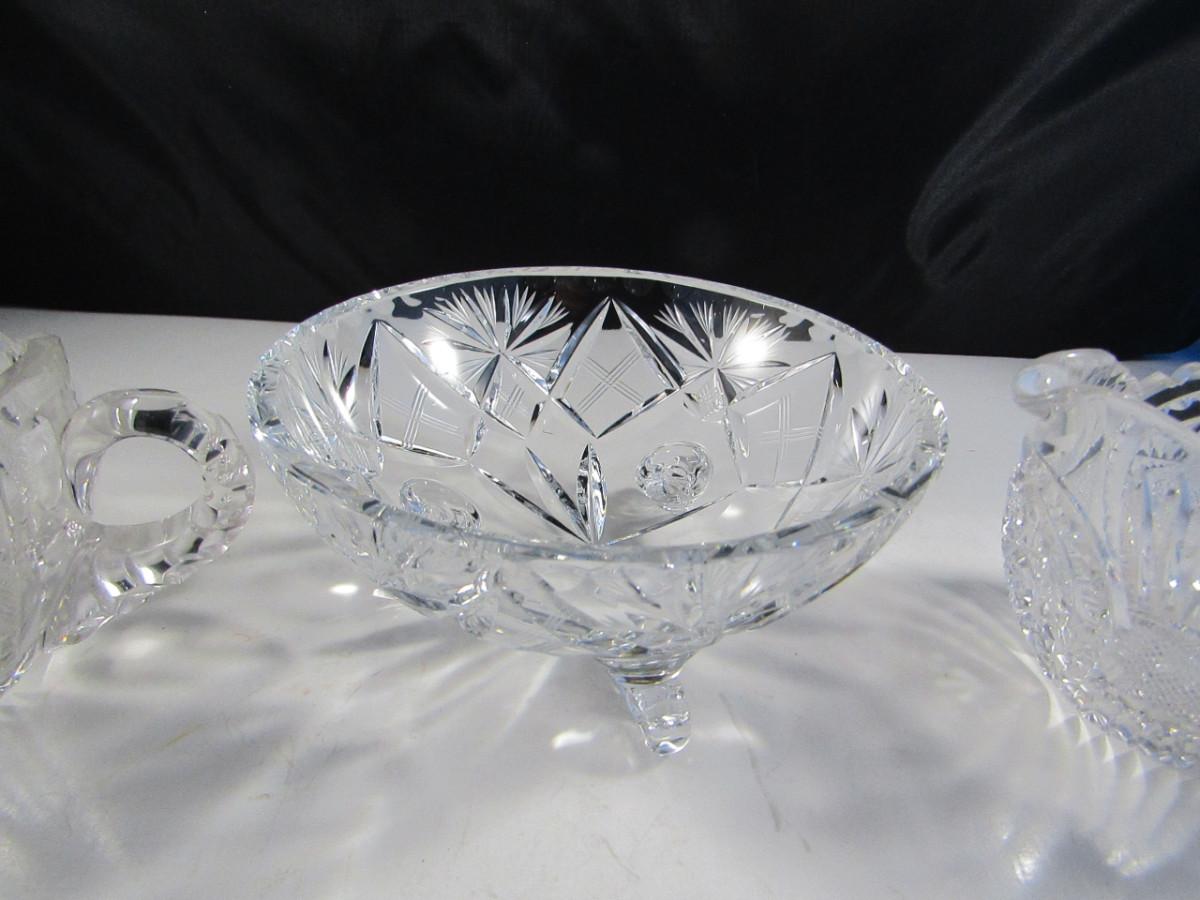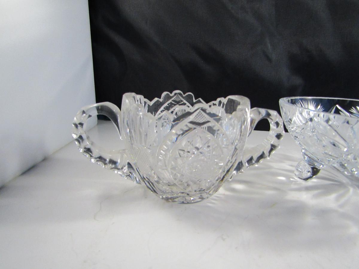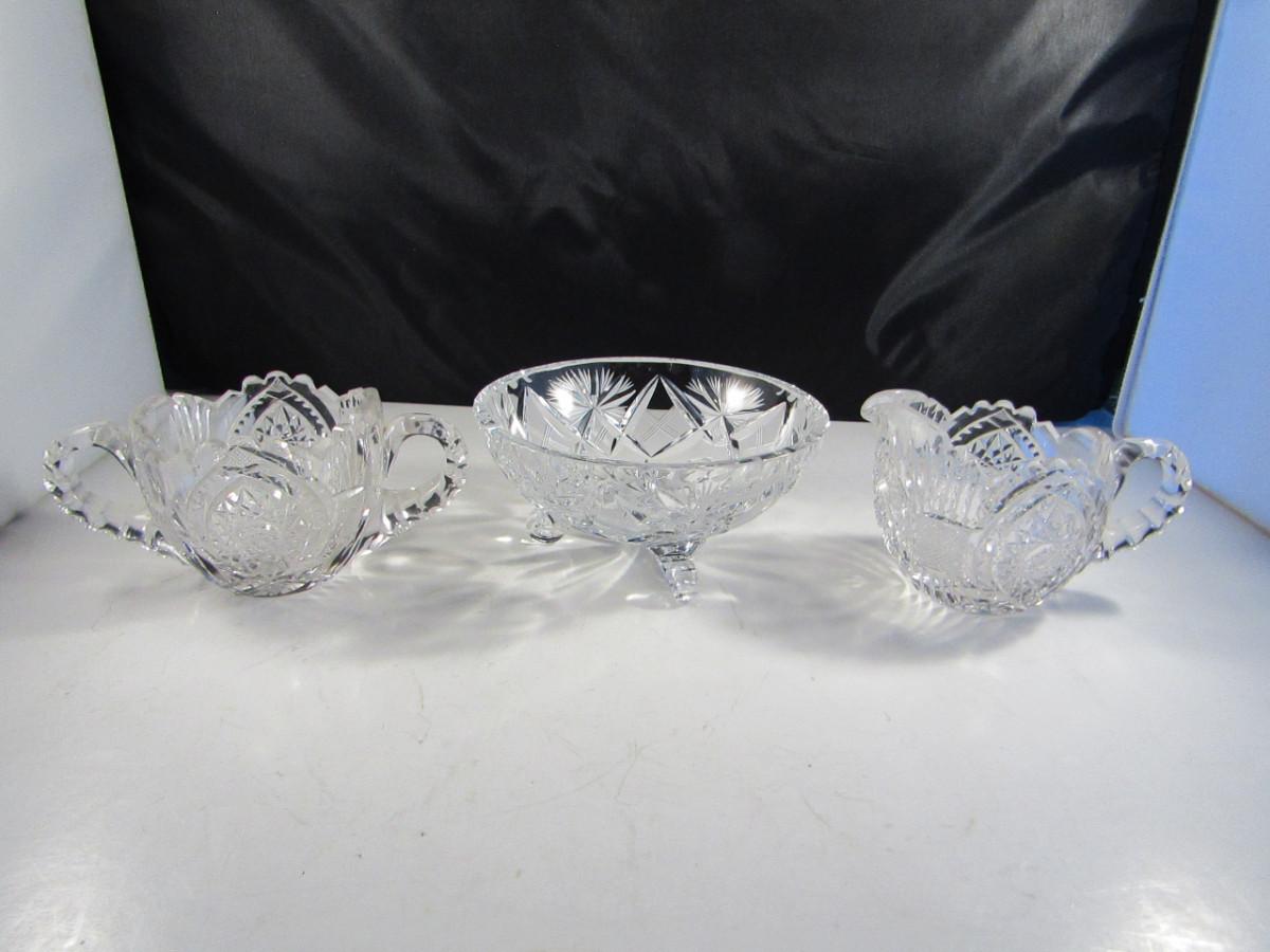Collection of Vintage Cut Crystal Serveware. Creamer, sugar bowl. and additional footed bowl. Items may have some chipping.