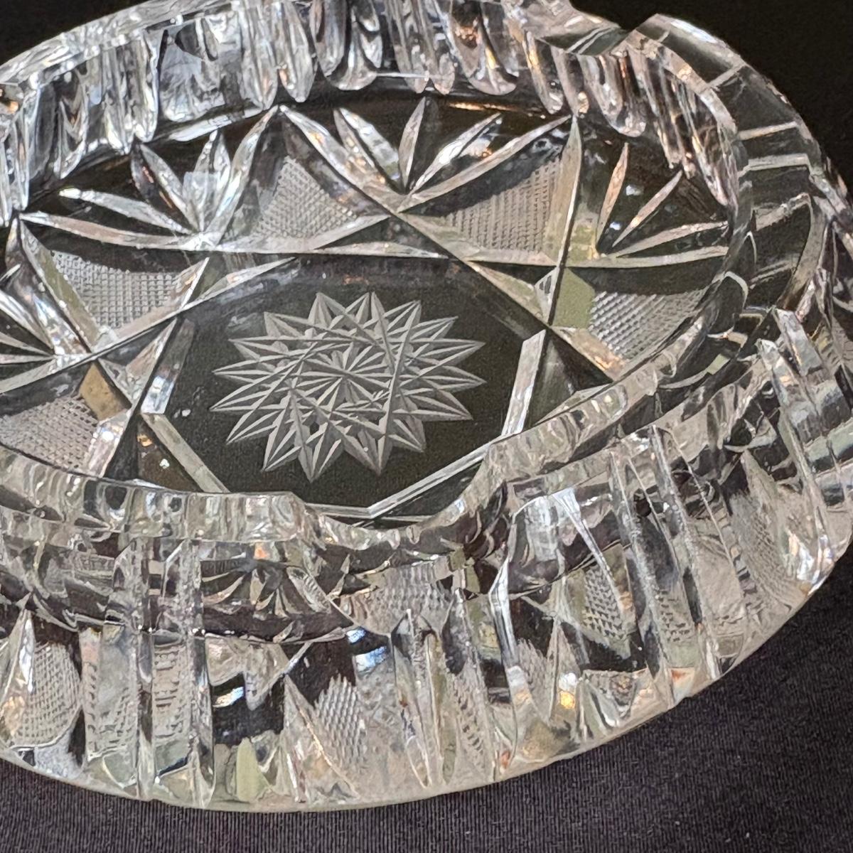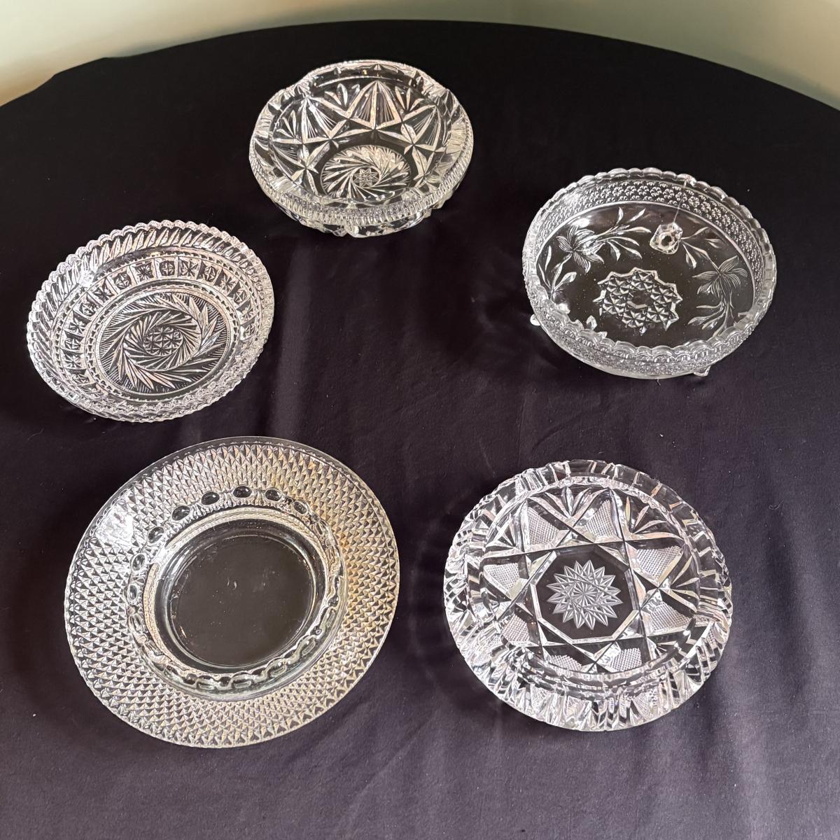 A collection of five vintage cut glass ashtrays of varying styles and sizes. The approximate measurements of the largest one is the sure snuff style ashtray at 6.5"D x 1"H.