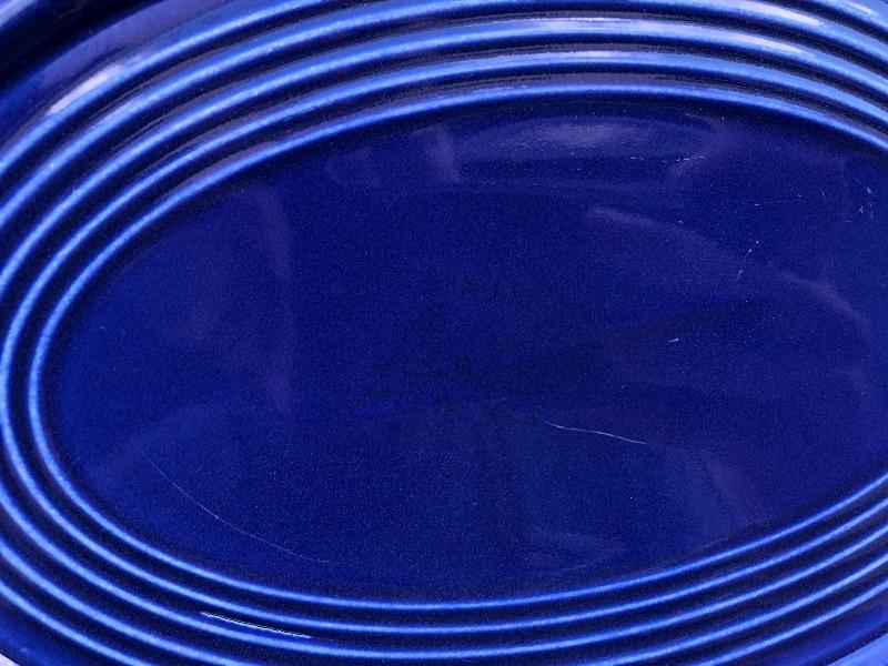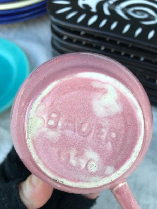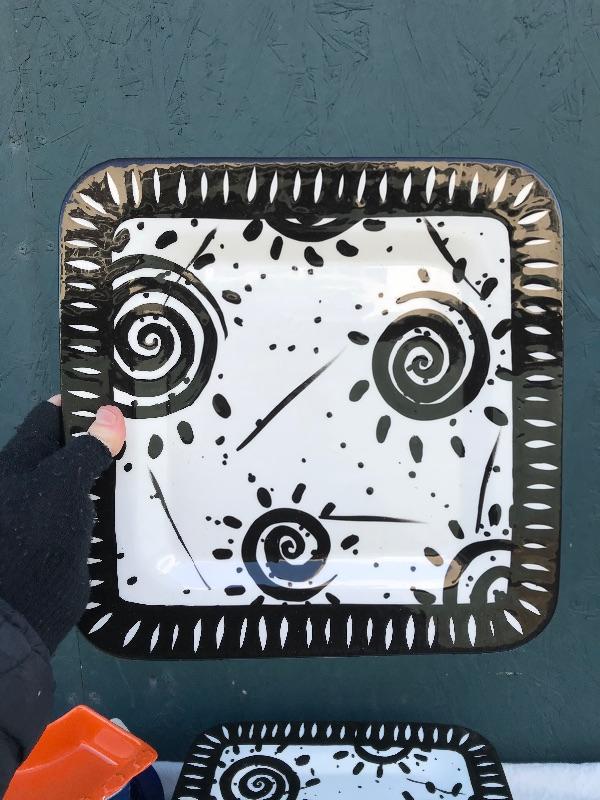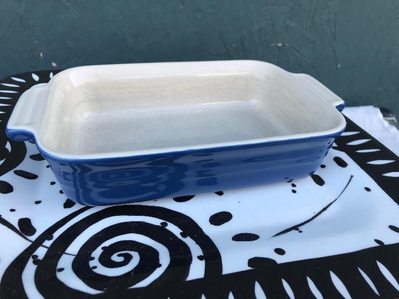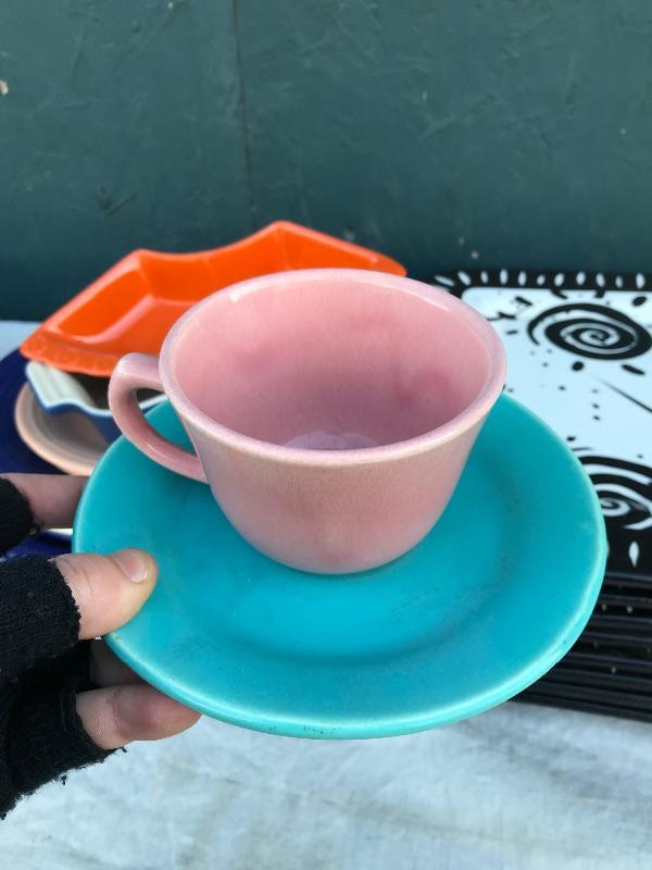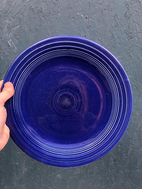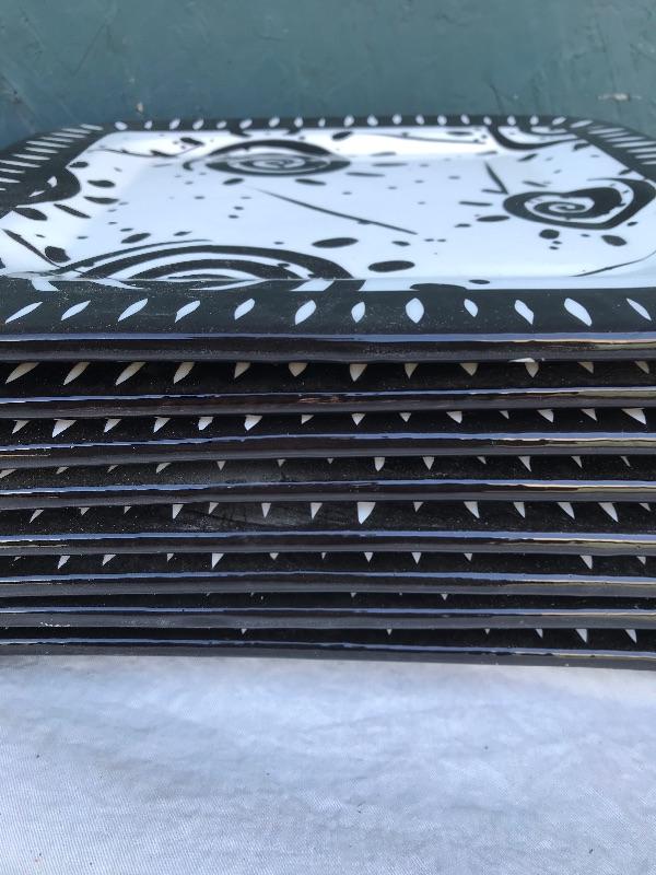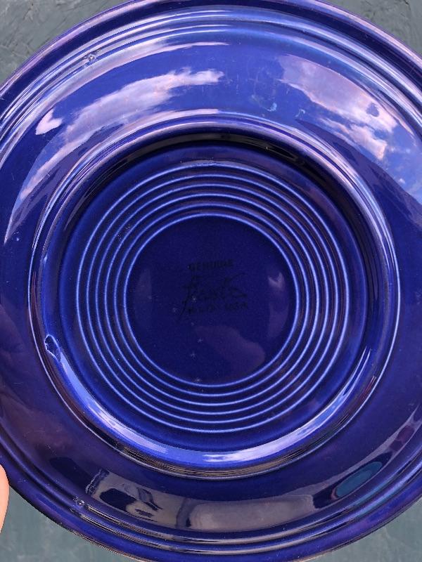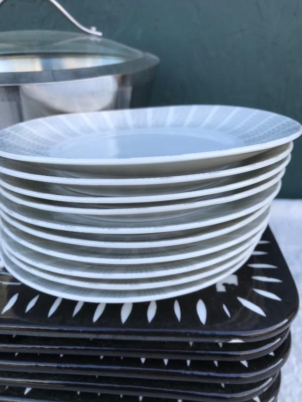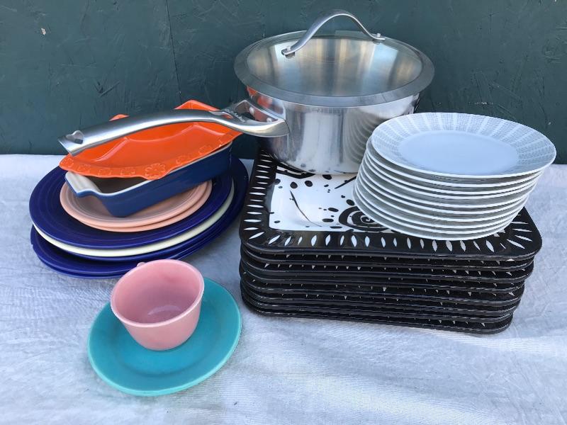 Included is a set of 8 B&W M. Motto Pottery square dinner plates, 10 dessert plates, two blue Fiesta serving platters, two dinner plates, and two salad plates, One Le Creuset casserole dish, one Bauer tea cup and saucer, one large saucepan, and one vintage blender.