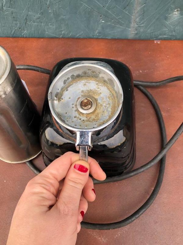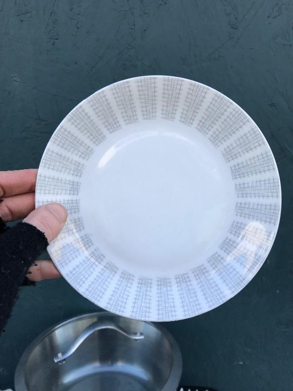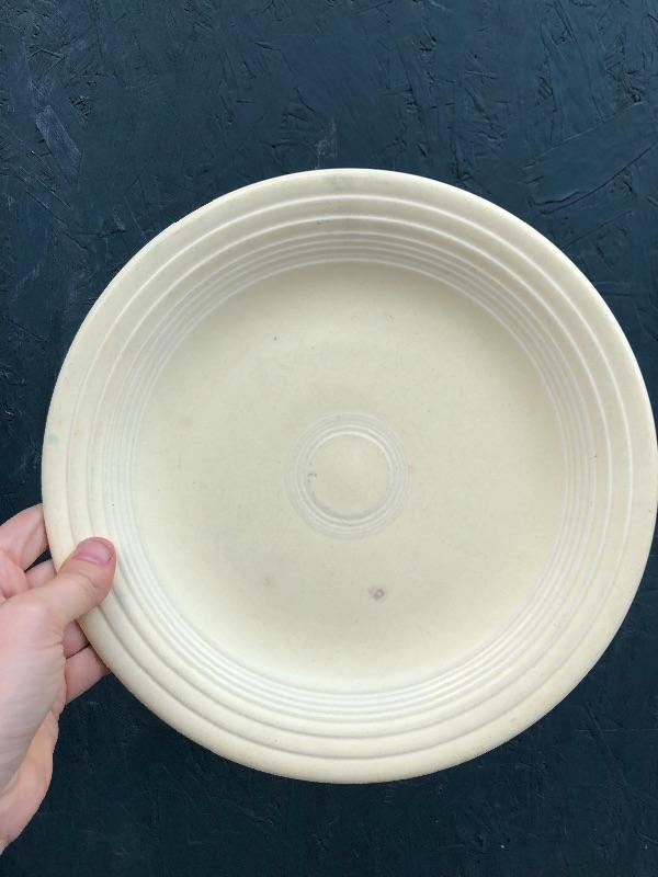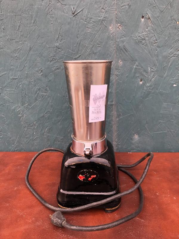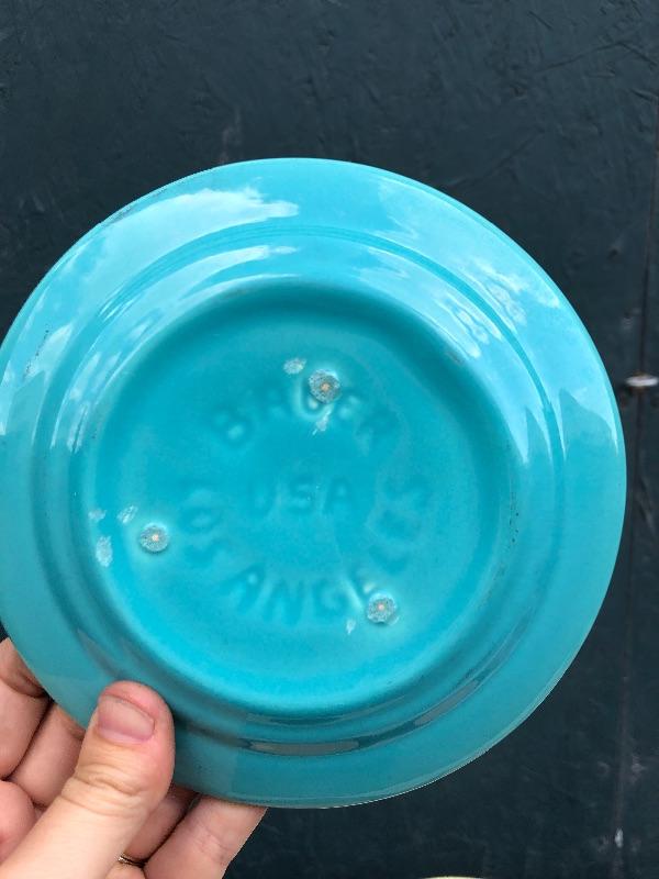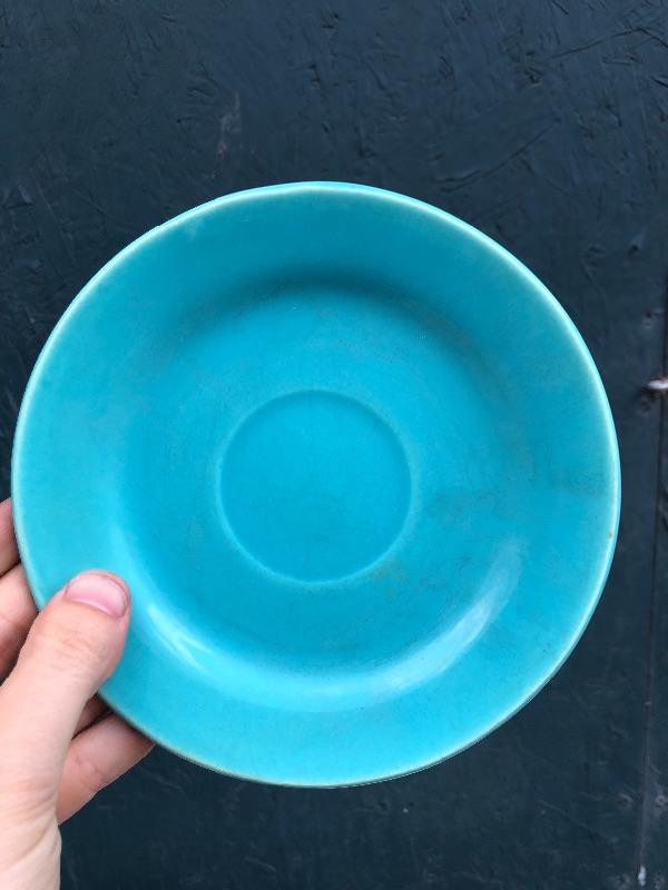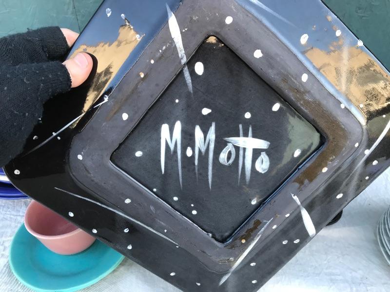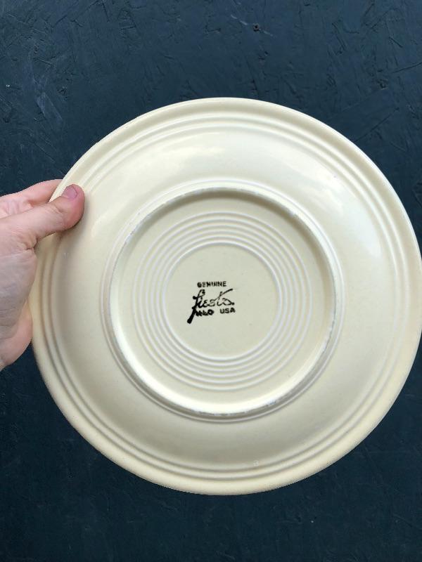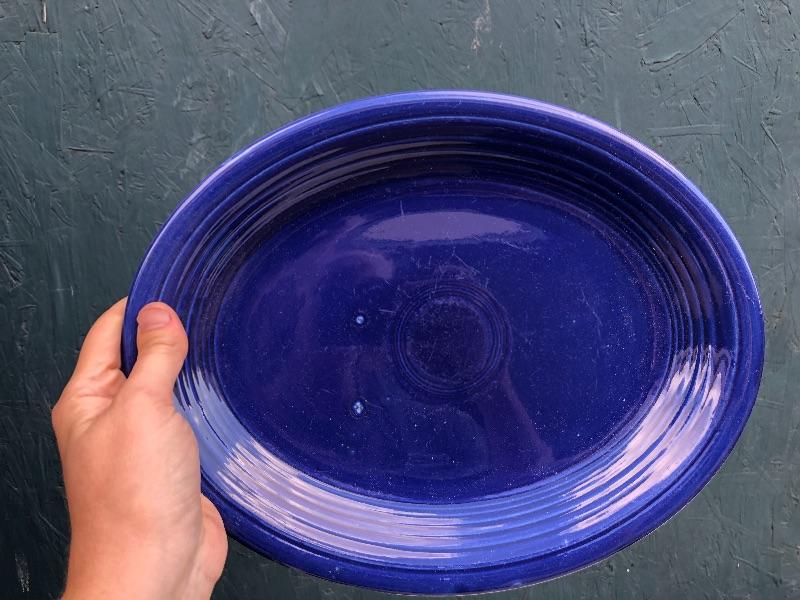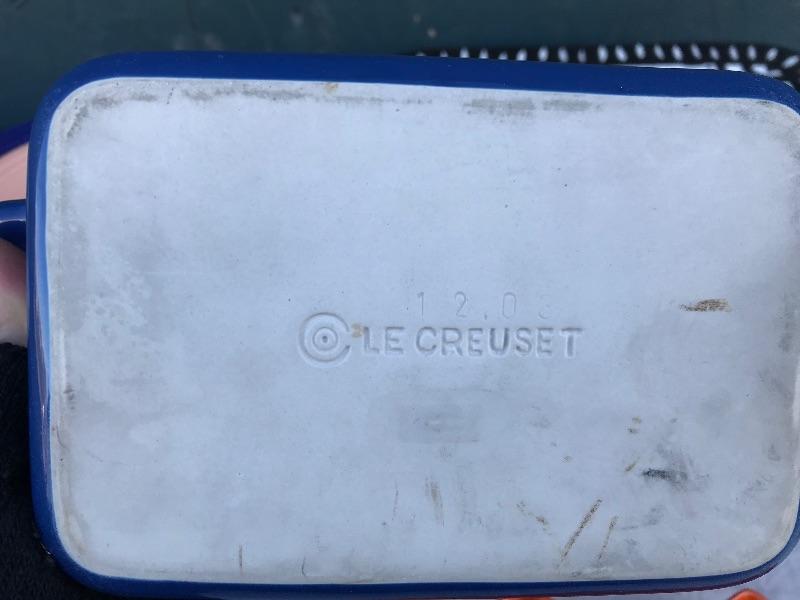 Included is a set of 8 B&W M. Motto Pottery square dinner plates, 10 dessert plates, two blue Fiesta serving platters, two dinner plates, and two salad plates, One Le Creuset casserole dish, one Bauer tea cup and saucer, one large saucepan, and one vintage blender.