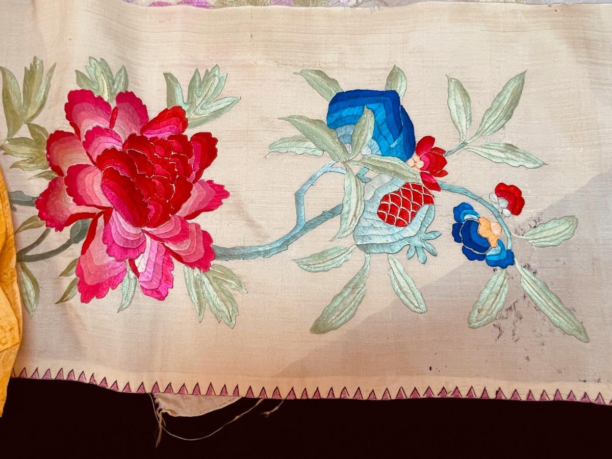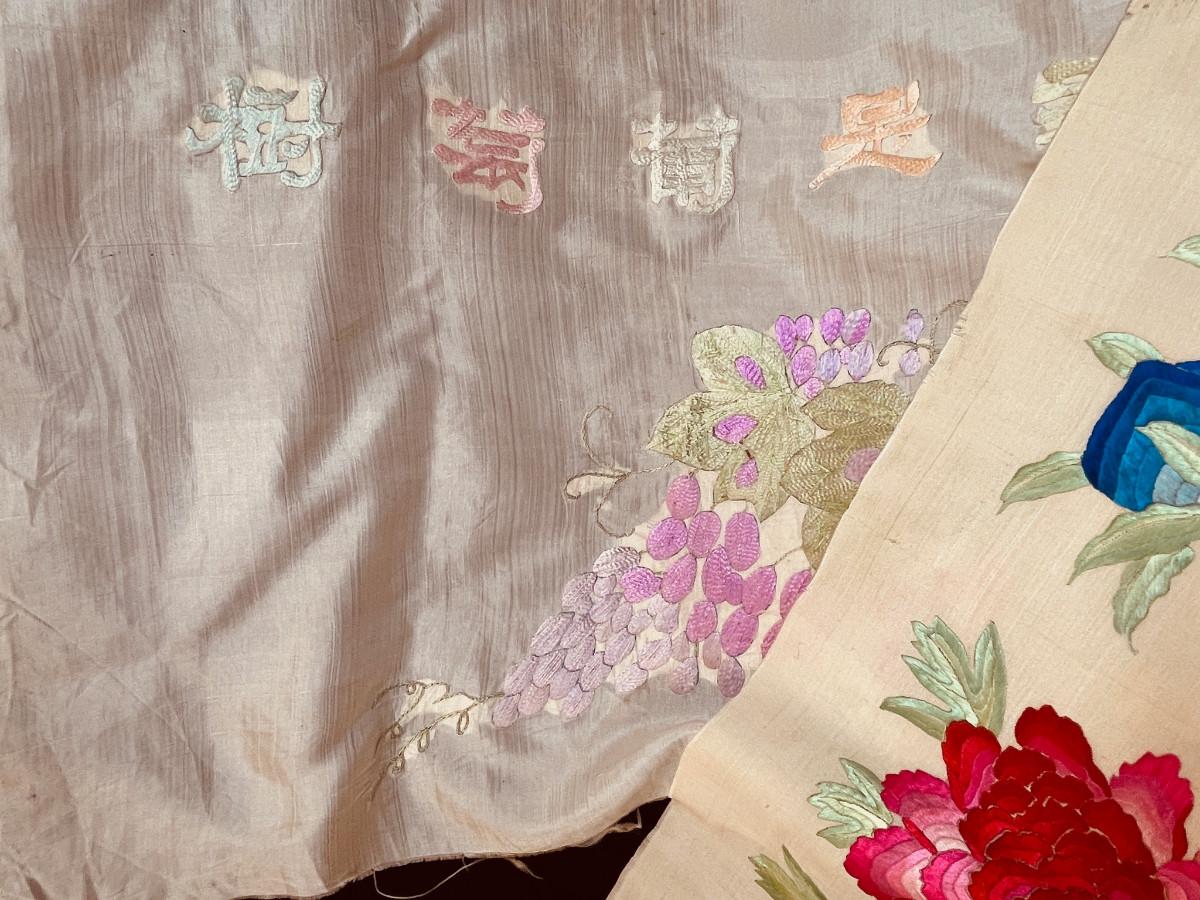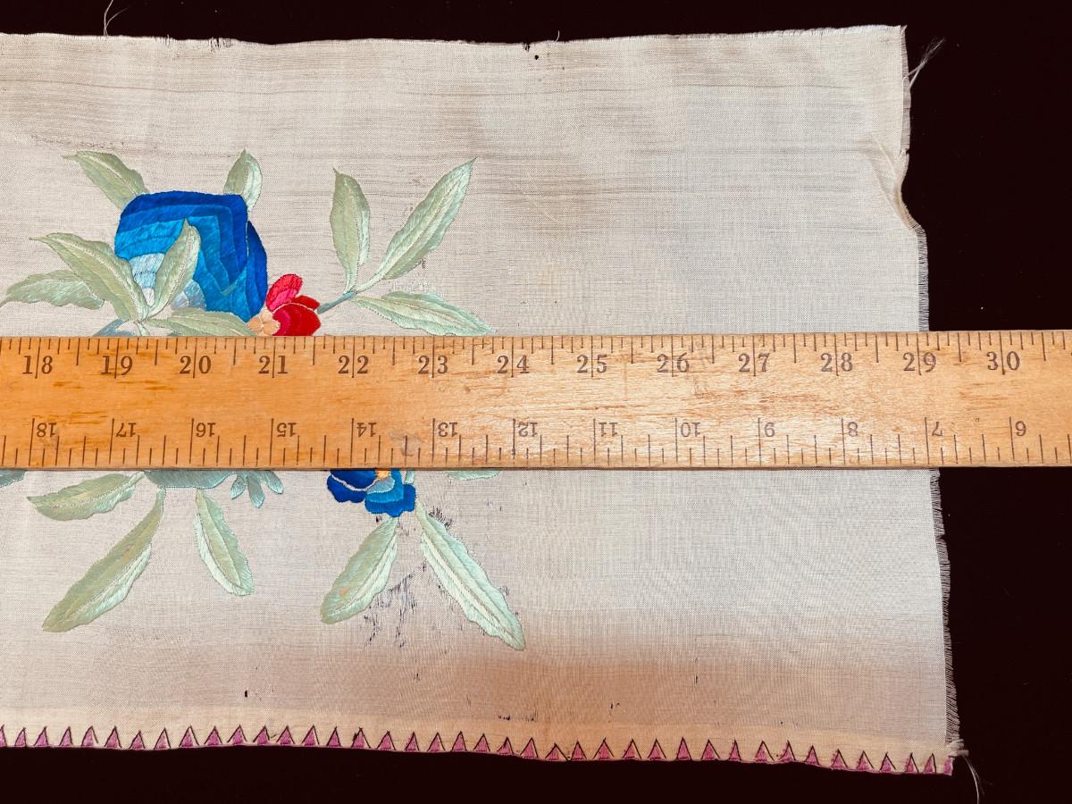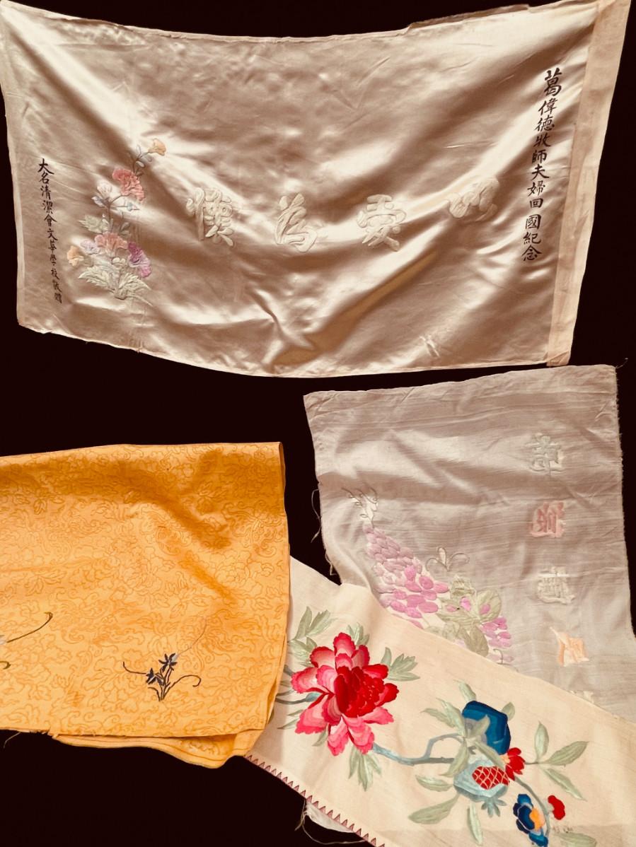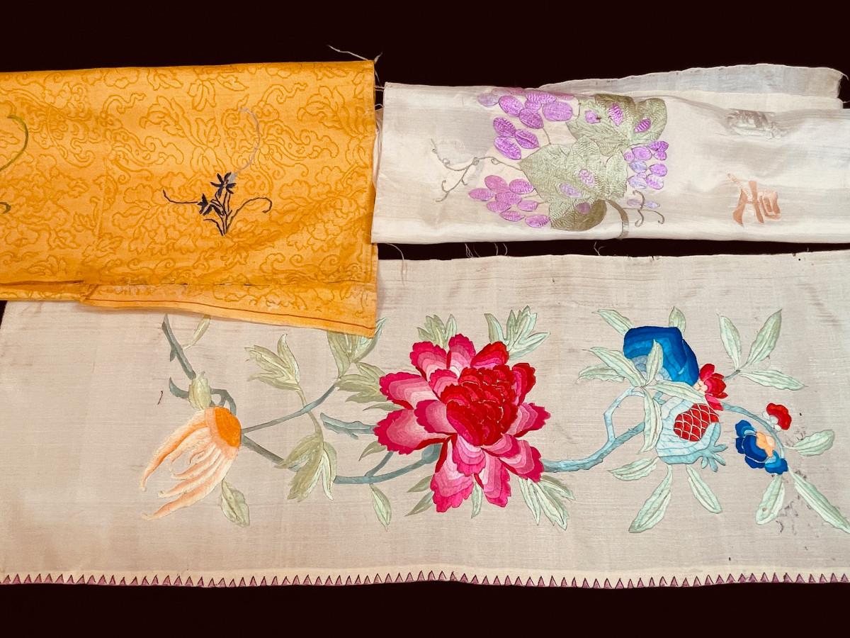 DESCRIPTION: This lot is made up of 4 vintage silk fragments, all embroidered with floral patterns. One of the larger fragments also includes a vertical line of calligraphy that is most probably a poem.