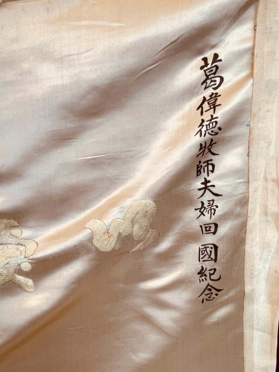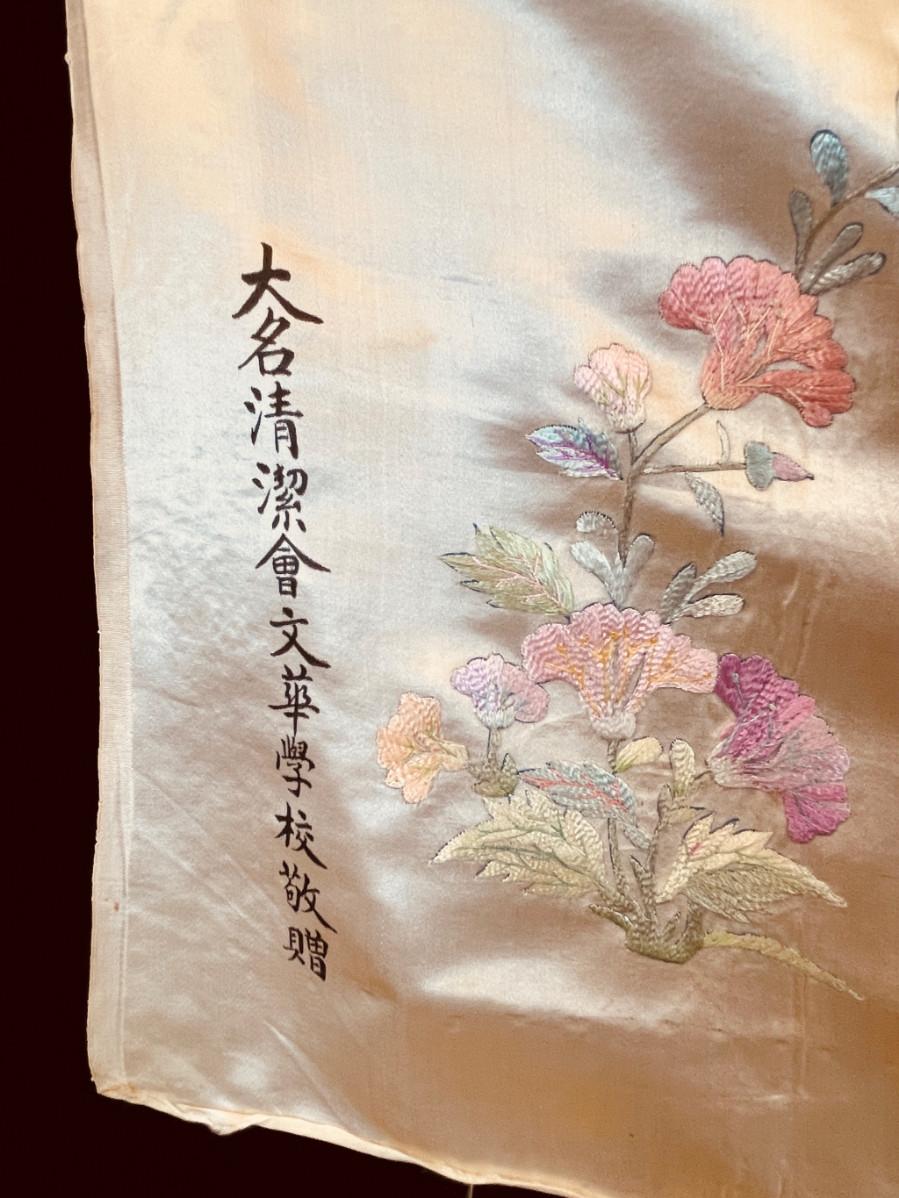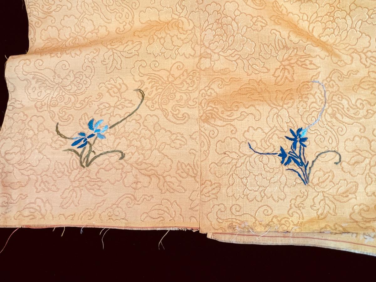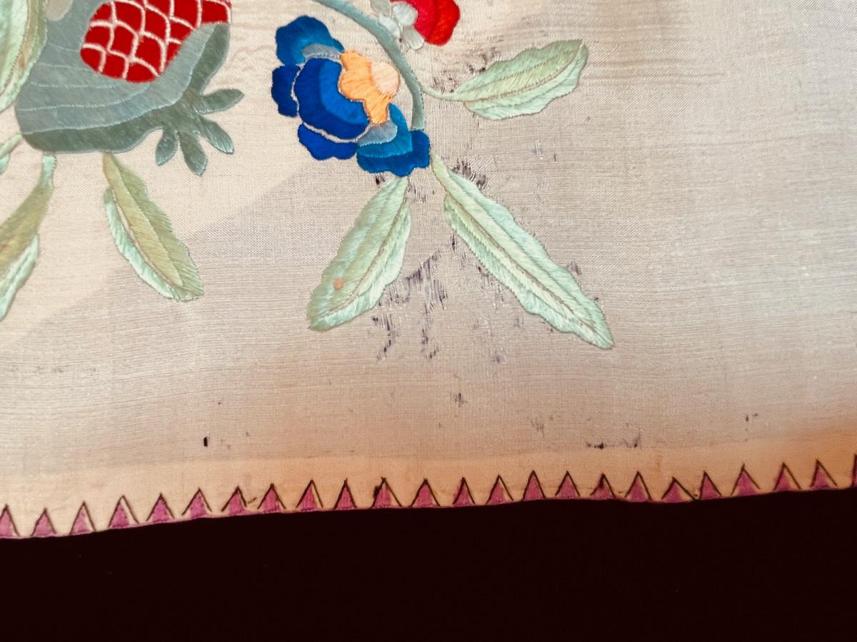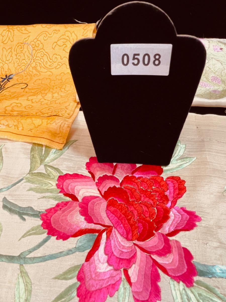 DESCRIPTION: This lot is made up of 4 vintage silk fragments, all embroidered with floral patterns. One of the larger fragments also includes a vertical line of calligraphy that is most probably a poem.
