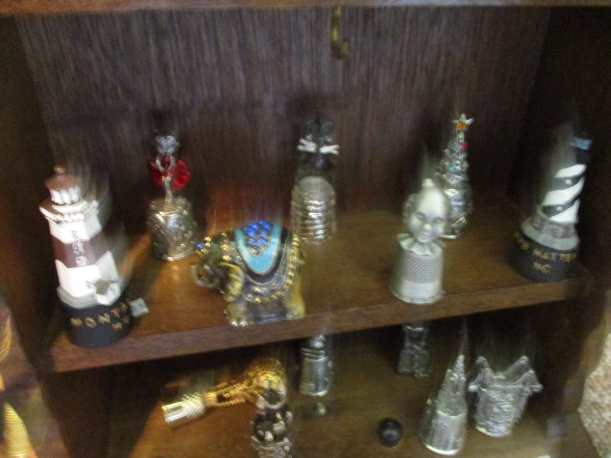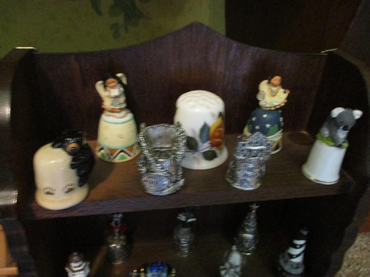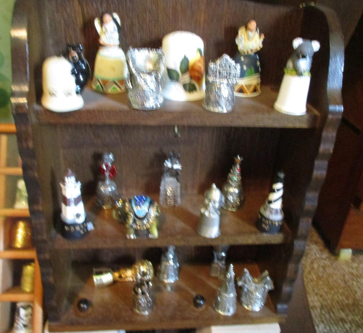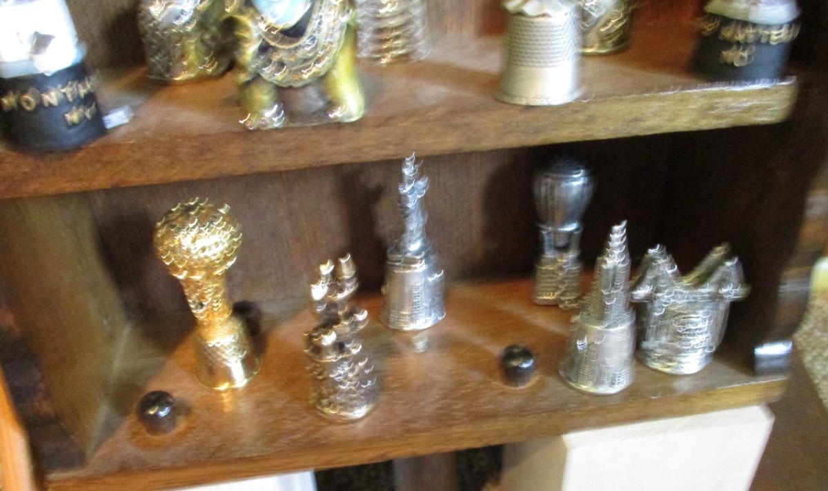Collection of Vintage Fancy Figural Thimbles on Wood Display