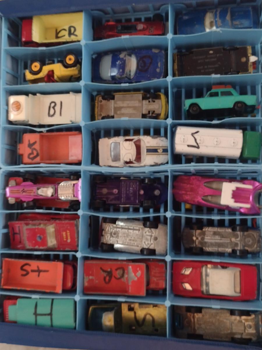 Collection of Vintage Hot Wheels/Matchbox Cars and Tonka Trucks. Most have ink markings. Please see all pictures for condition.