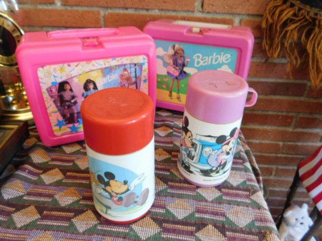 Collection of Vintage Lunch Boxes and Thermos Barbie, Batman, My Little Pony, Mickey (see all pics)