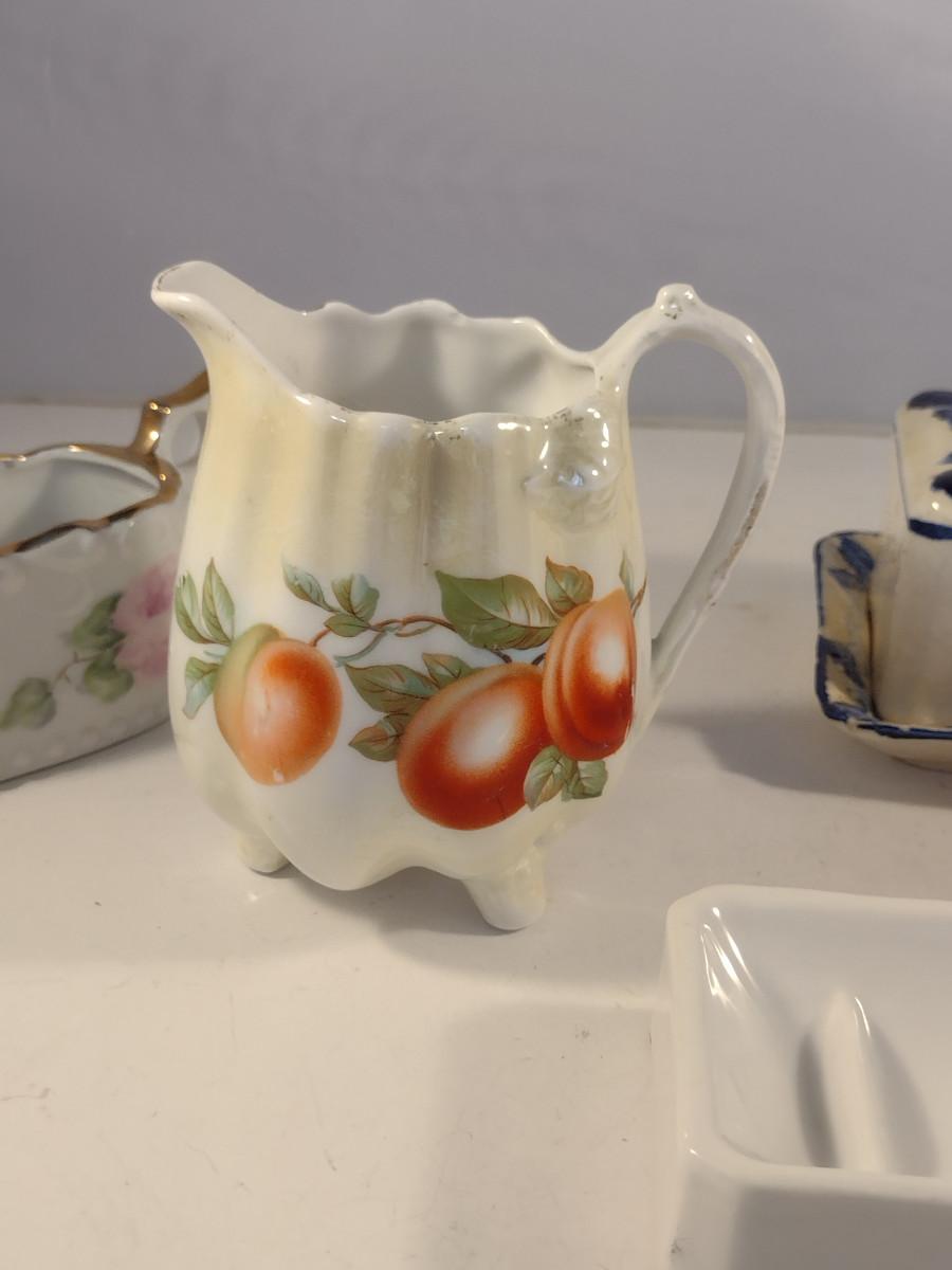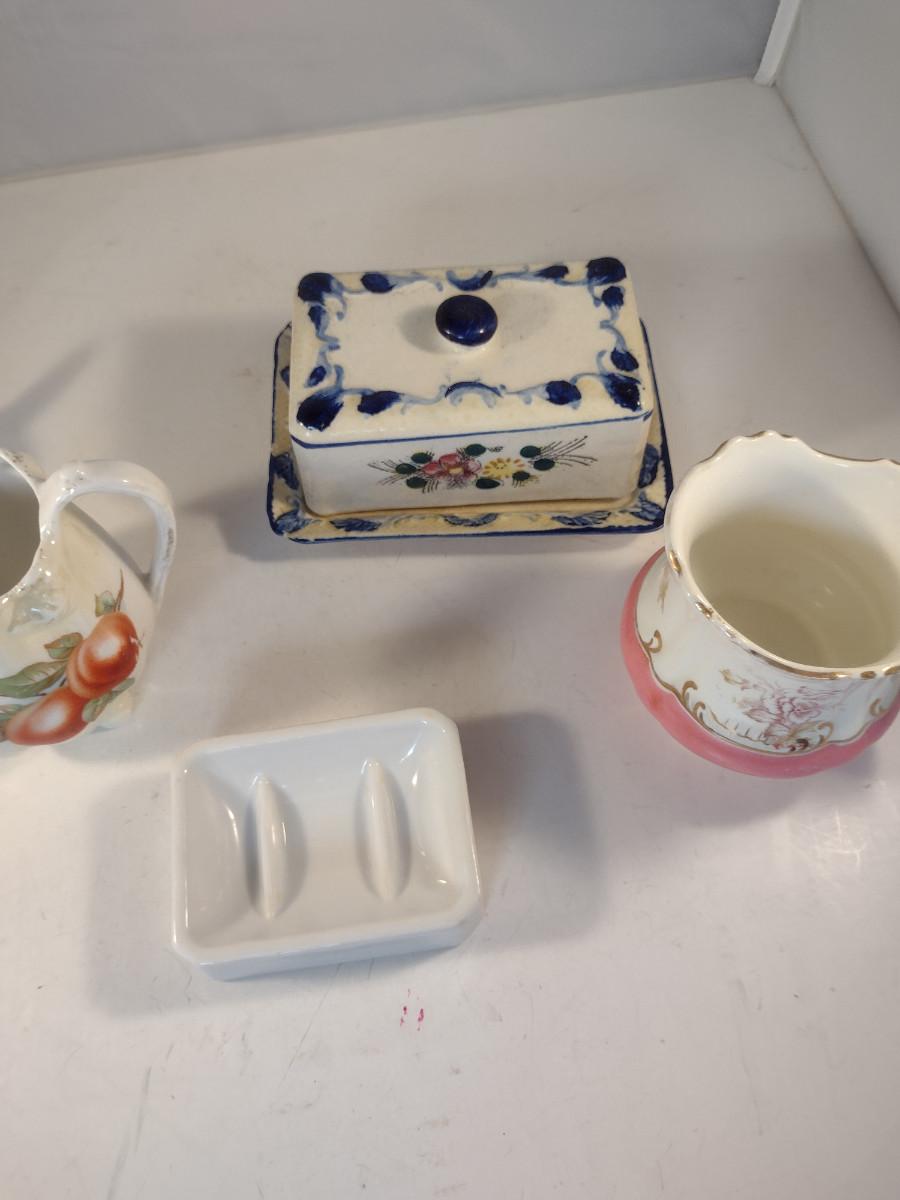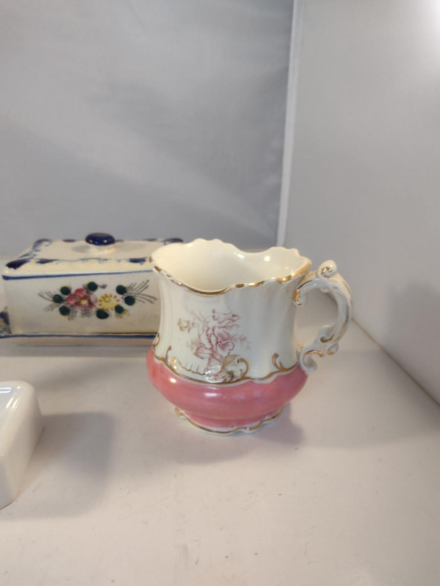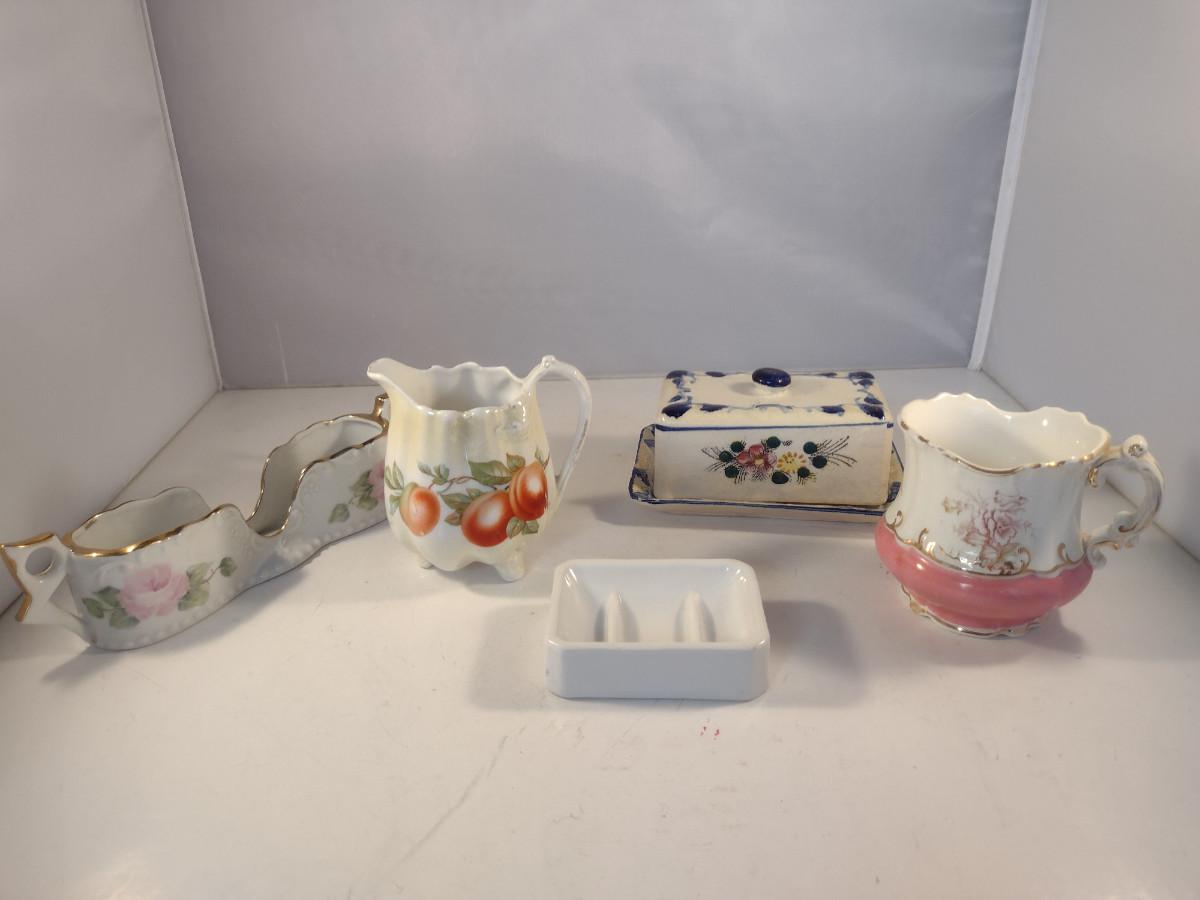Collection of Vintage Porcelain Housewares. Pitchers, butter dish, spoon holder, soap dish. All items are in used condition- please see all pictures.