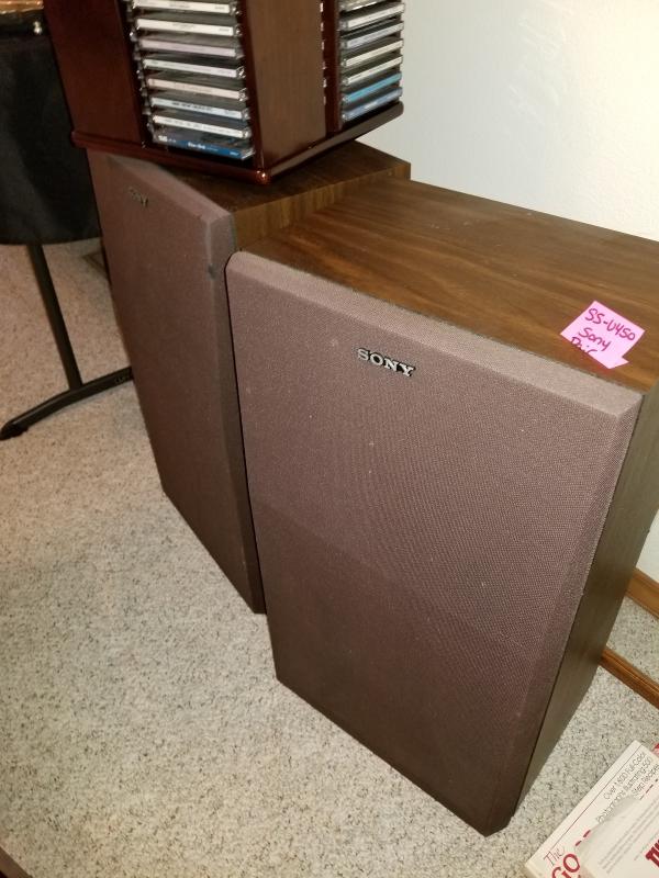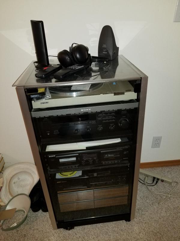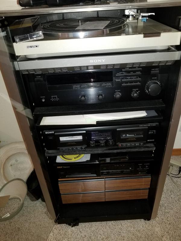 Zoom in to see details. Sony record player. We did not have a chance to test it all out. Everything powers on and seems to work fine. But you are buying as is. You get all the equipment plus the stand, and the speakers AND the CDs and Racks and any records (may not be any) AS IS NOT FULLY TESTED. But the family said everything worked fine and this is a nice tidy home 1 adult so everything was well taken care of.