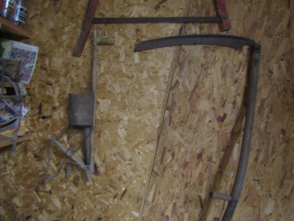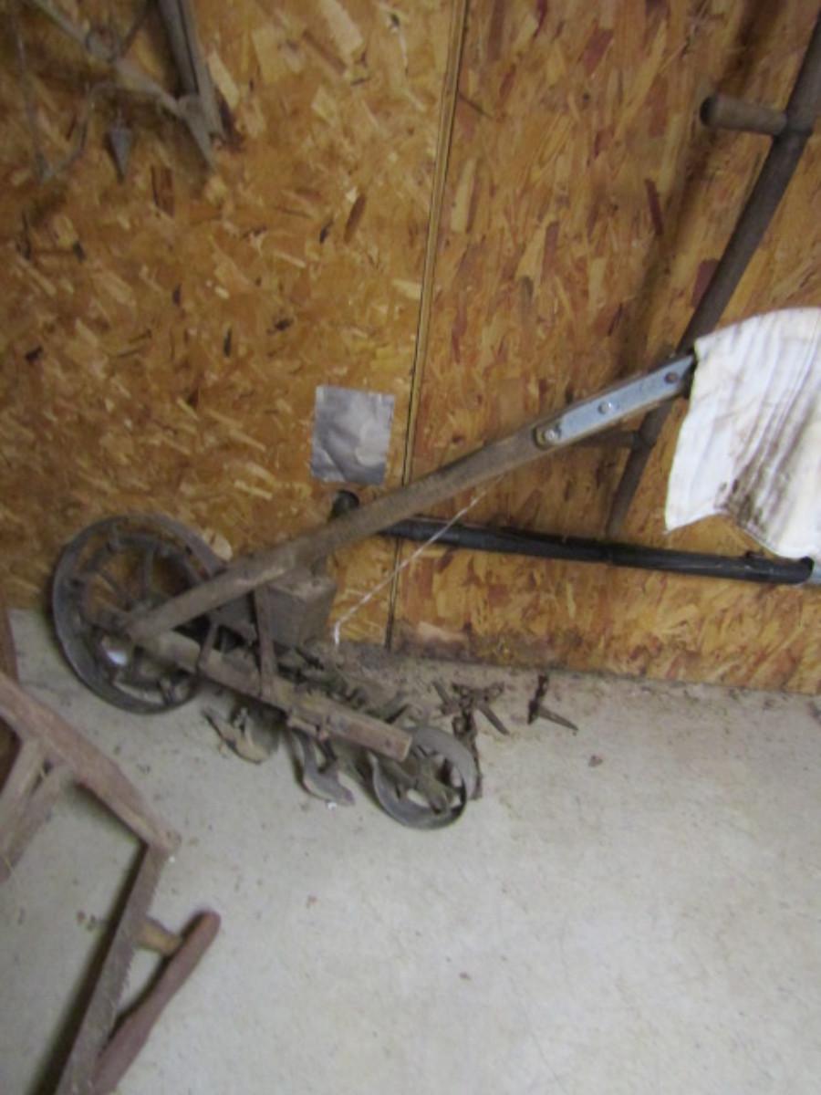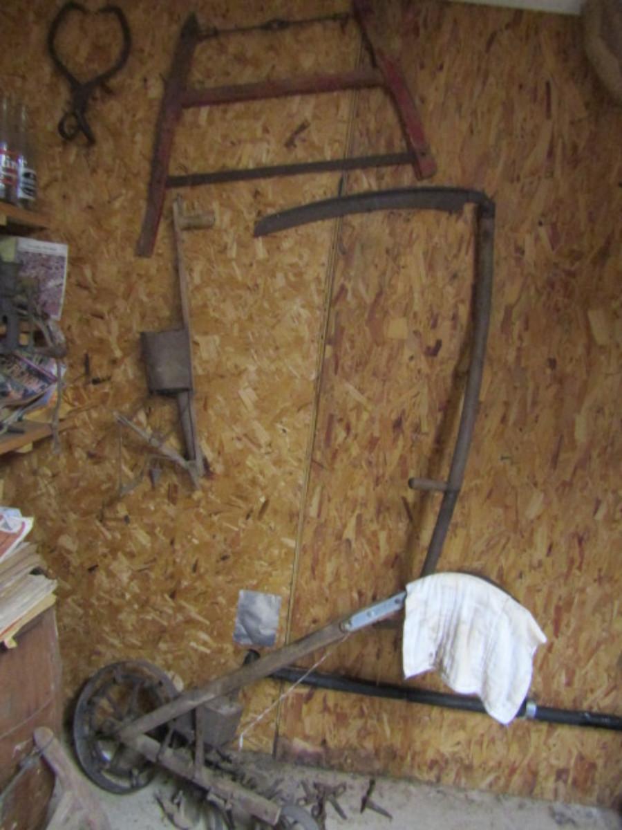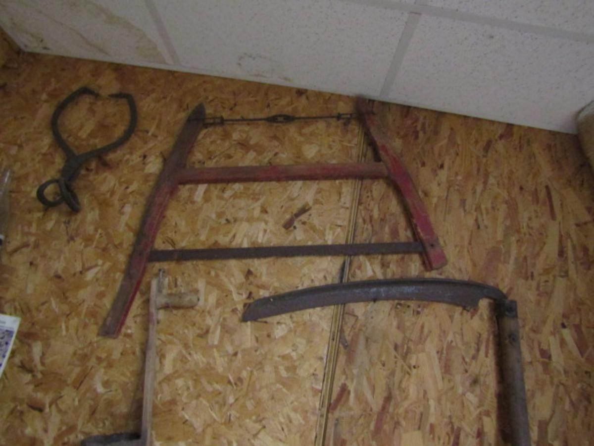 Collection of Vintage Tools- Saw, Scithe, Seeder, Plow. Please see all pictures for selection.