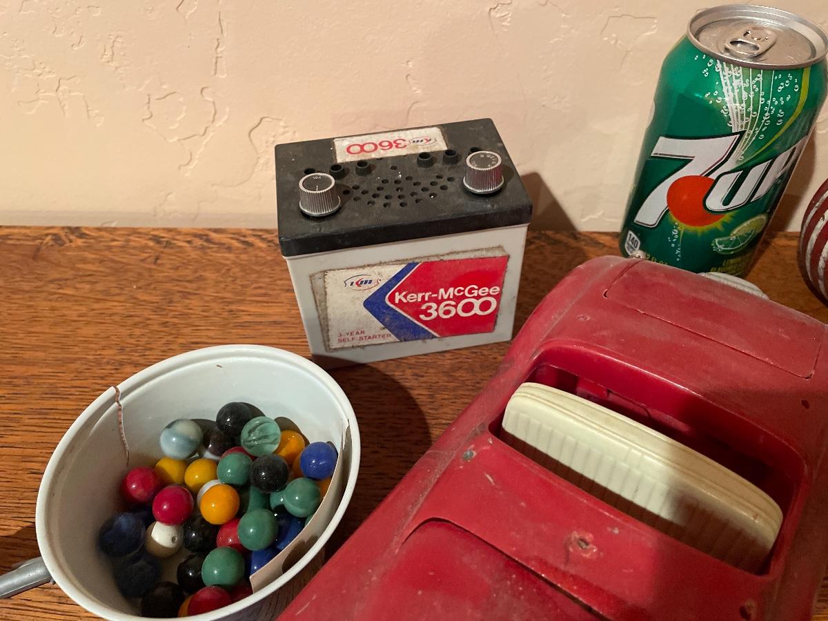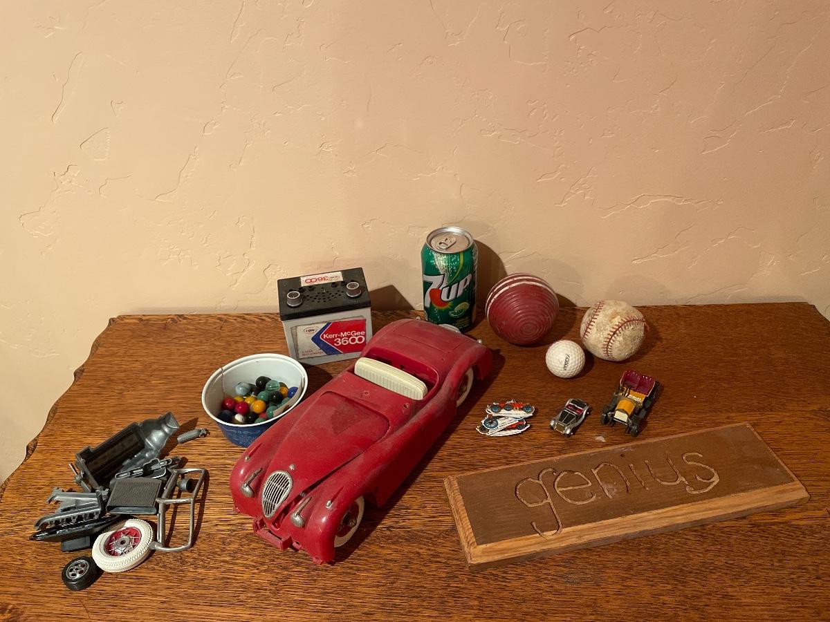 #298 Collection of Vintage Toys & Balls, “genius” Sign, Marbles