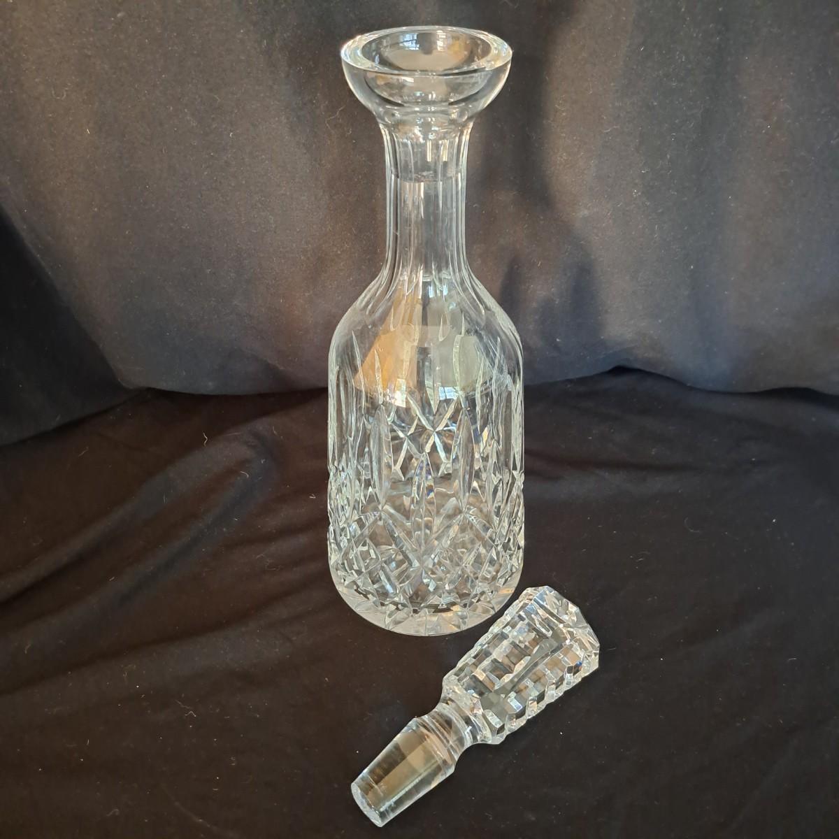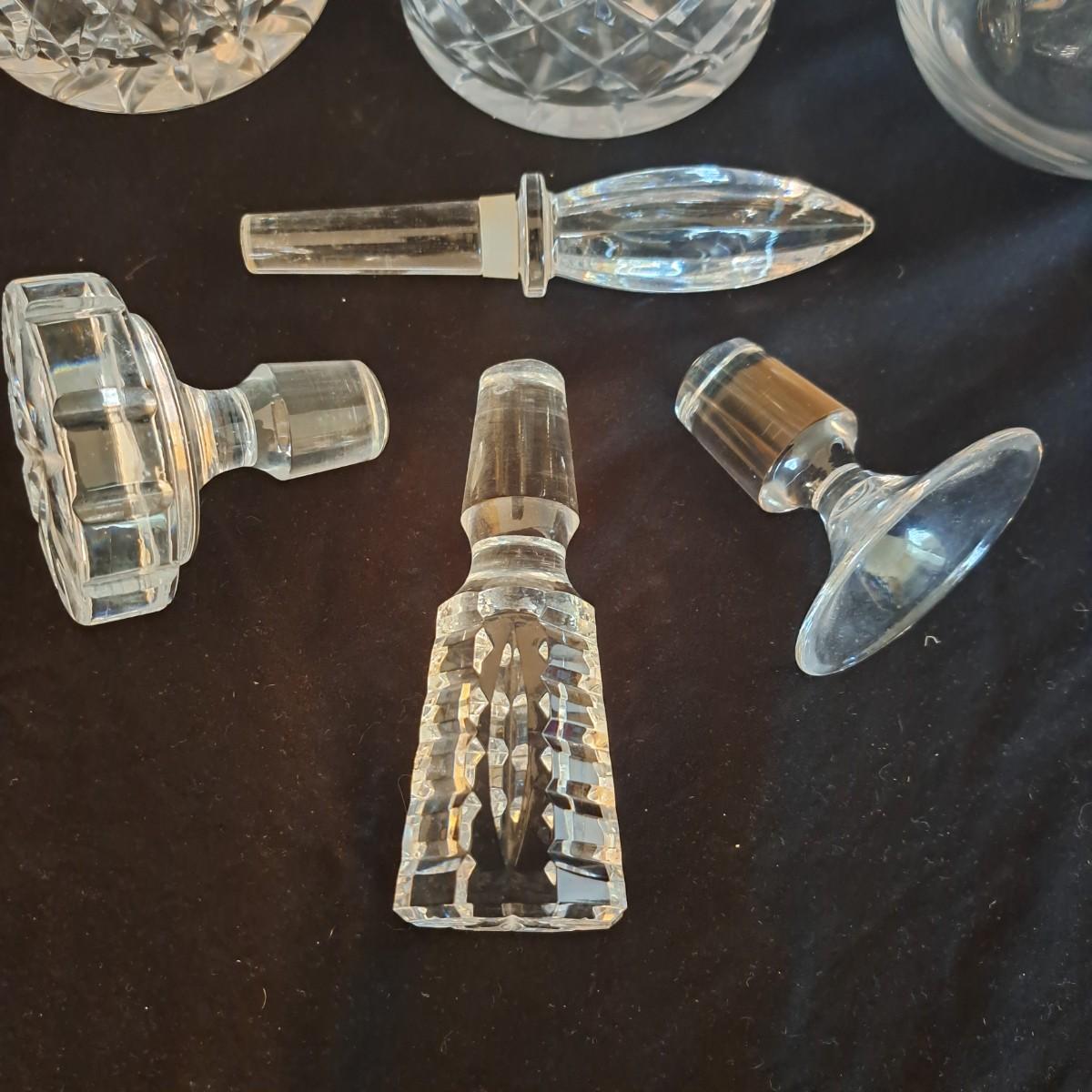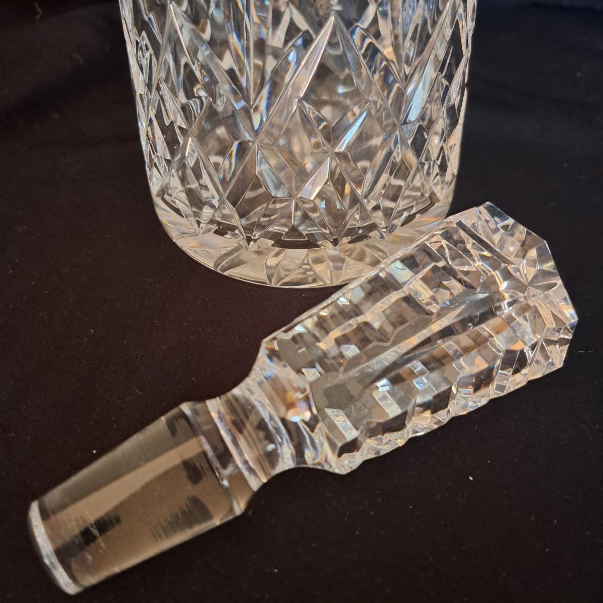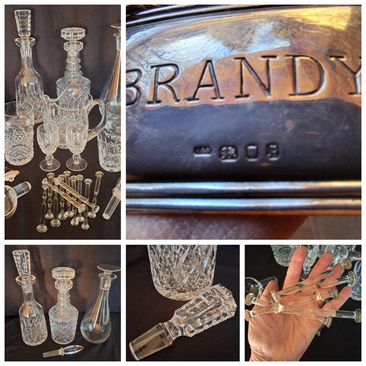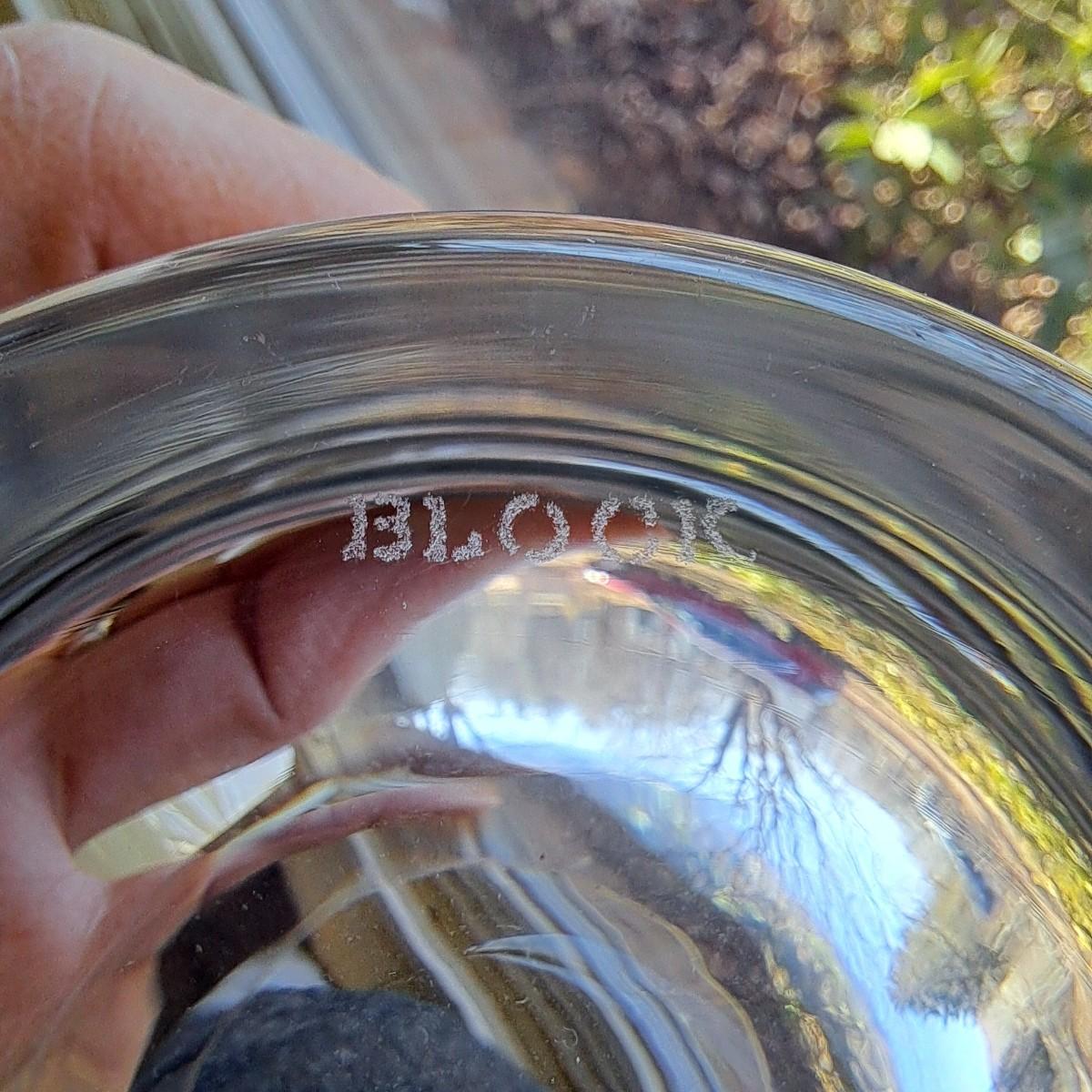 This grouping of 28 barware pieces ranges from five - 2"H decanter labels to a 13.25"H crystal glass decanter. Of the five decanter labels three are stamped "R&K" with a lion hallmark. There are 11 glass swizzle/stirring sticks, a Rosenthal crystal glass champagne taster, 2 rocks glasses (*one marked Waterford, the other with a small nick to rim), 2 cordials marked Waterford, a pitcher marked Waterford (*has crack as shown), 3 decanters (*one featured in photos marked Waterford) all with stoppers in very fine condition along with an additional single lone stopper. Finally, two large thick and heavy rocks tumblers marked "BLOCK" at bases. Shipping available. Shipping can be costly. We suggest contacting our preferred local shipping provider, Postage Express, with dimensions and getting an estimate before bidding: (828) 255-9250 or shipping@postageexpressnc.com.