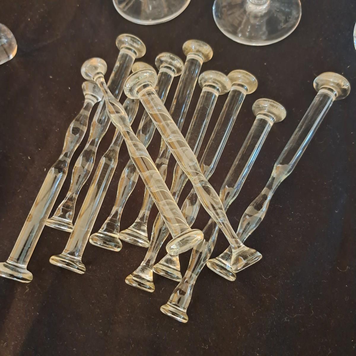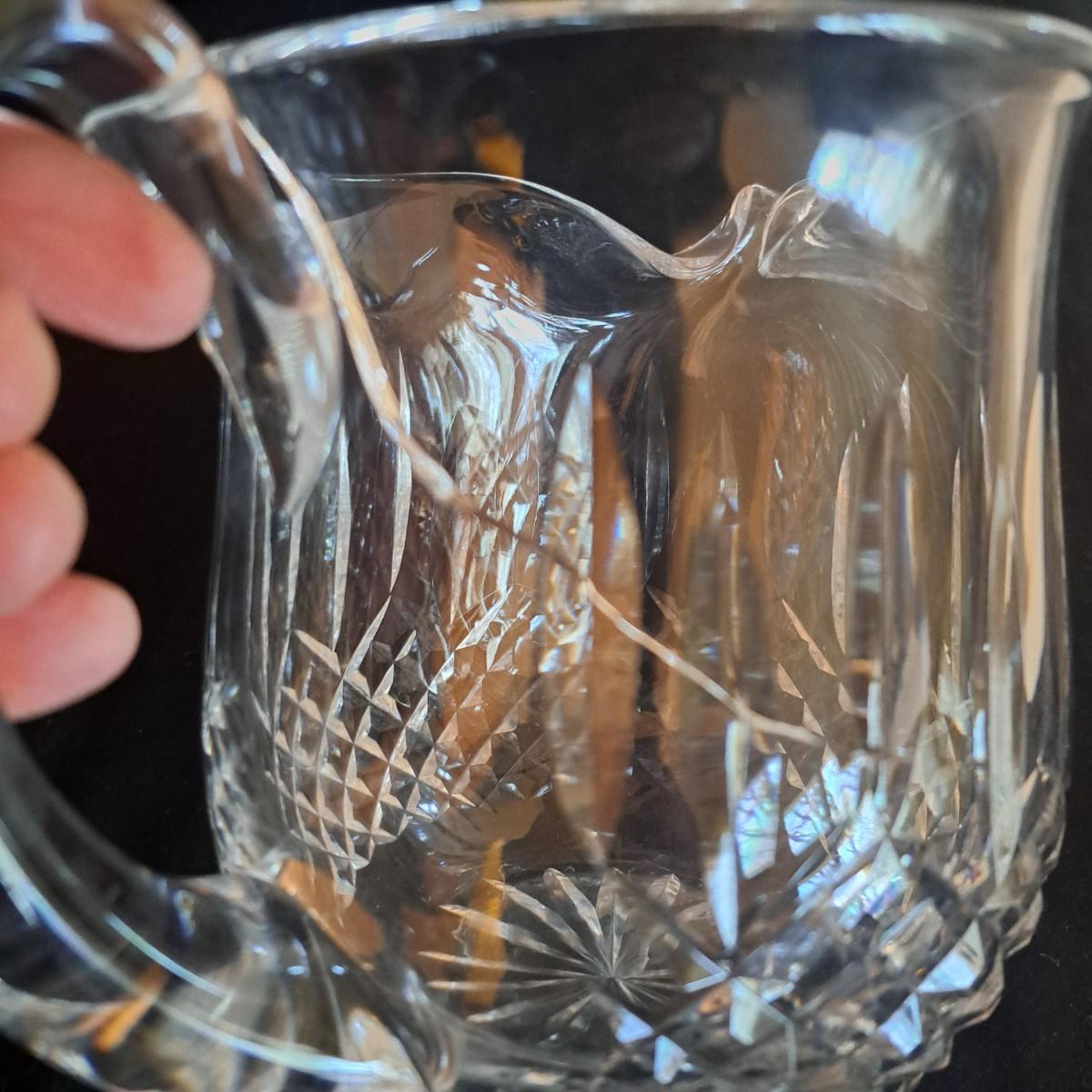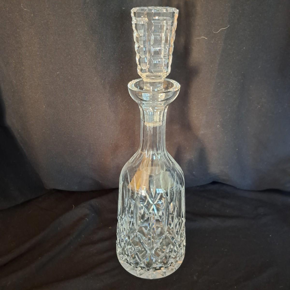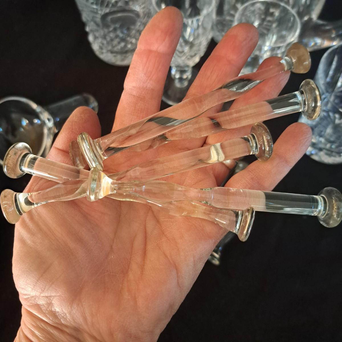 This grouping of 28 barware pieces ranges from five - 2"H decanter labels to a 13.25"H crystal glass decanter. Of the five decanter labels three are stamped "R&K" with a lion hallmark. There are 11 glass swizzle/stirring sticks, a Rosenthal crystal glass champagne taster, 2 rocks glasses (*one marked Waterford, the other with a small nick to rim), 2 cordials marked Waterford, a pitcher marked Waterford (*has crack as shown), 3 decanters (*one featured in photos marked Waterford) all with stoppers in very fine condition along with an additional single lone stopper. Finally, two large thick and heavy rocks tumblers marked "BLOCK" at bases. Shipping available. Shipping can be costly. We suggest contacting our preferred local shipping provider, Postage Express, with dimensions and getting an estimate before bidding: (828) 255-9250 or shipping@postageexpressnc.com.