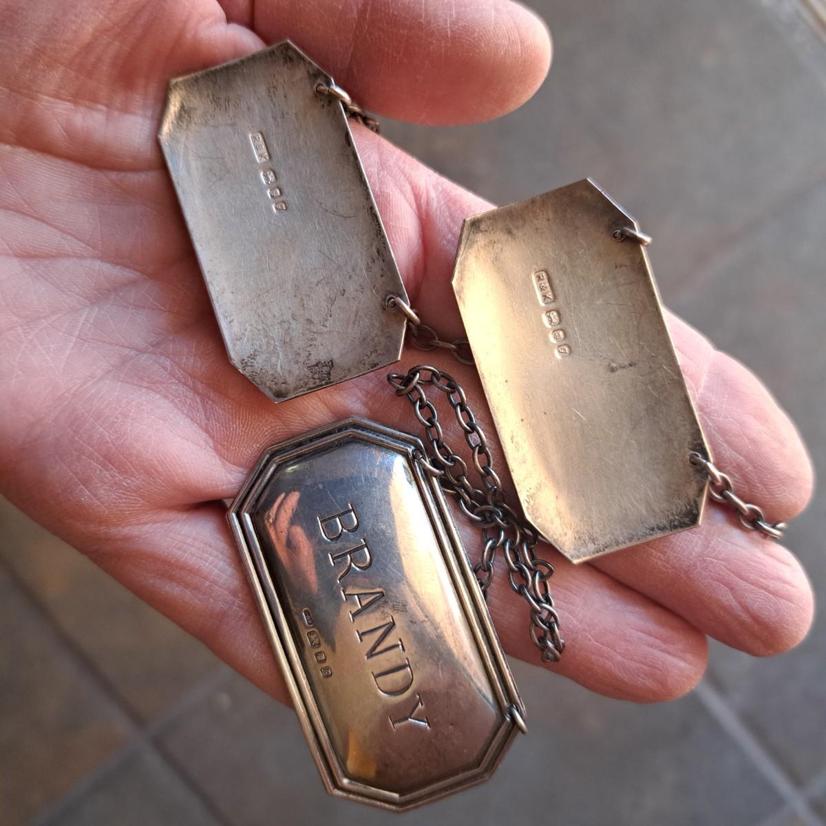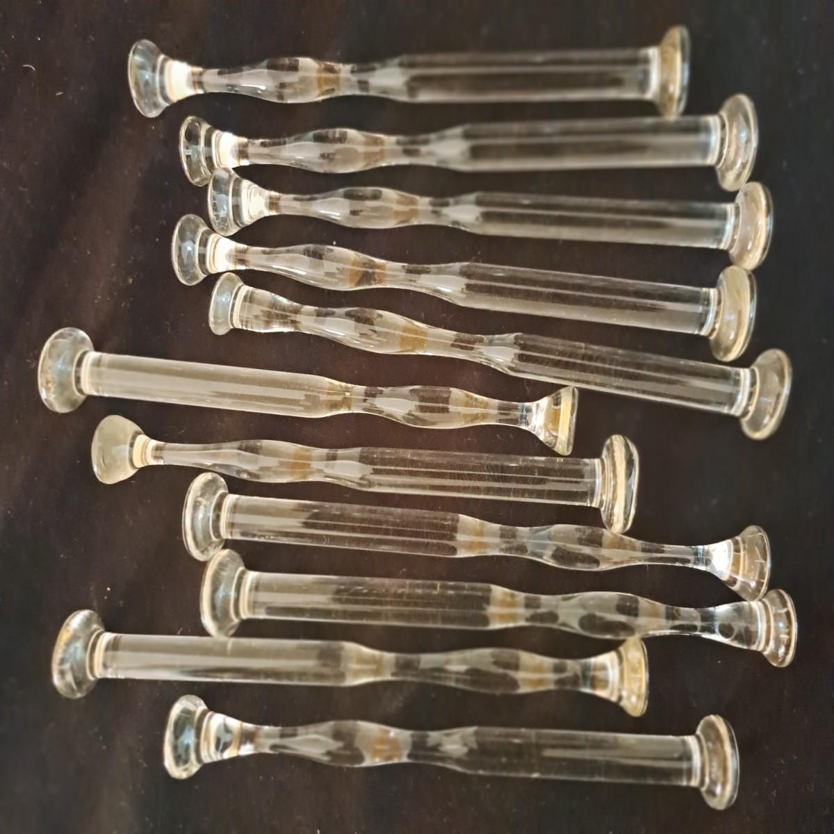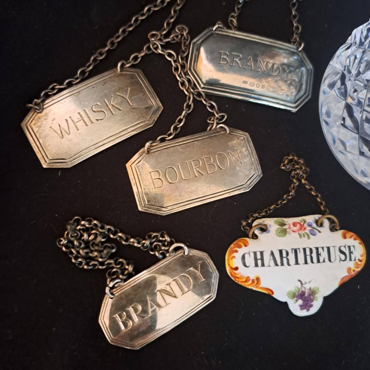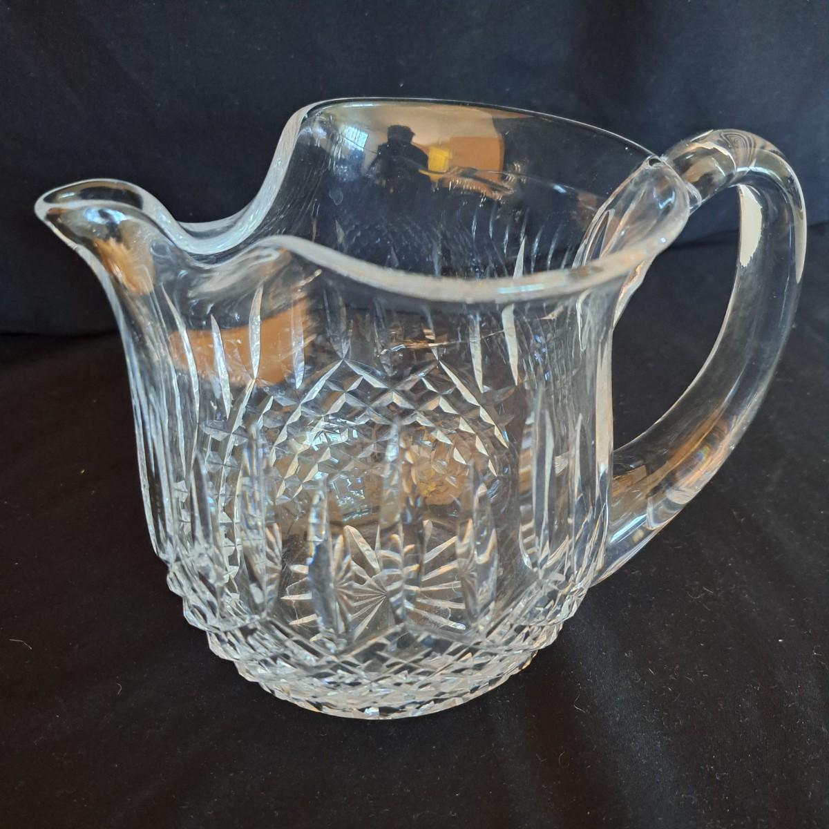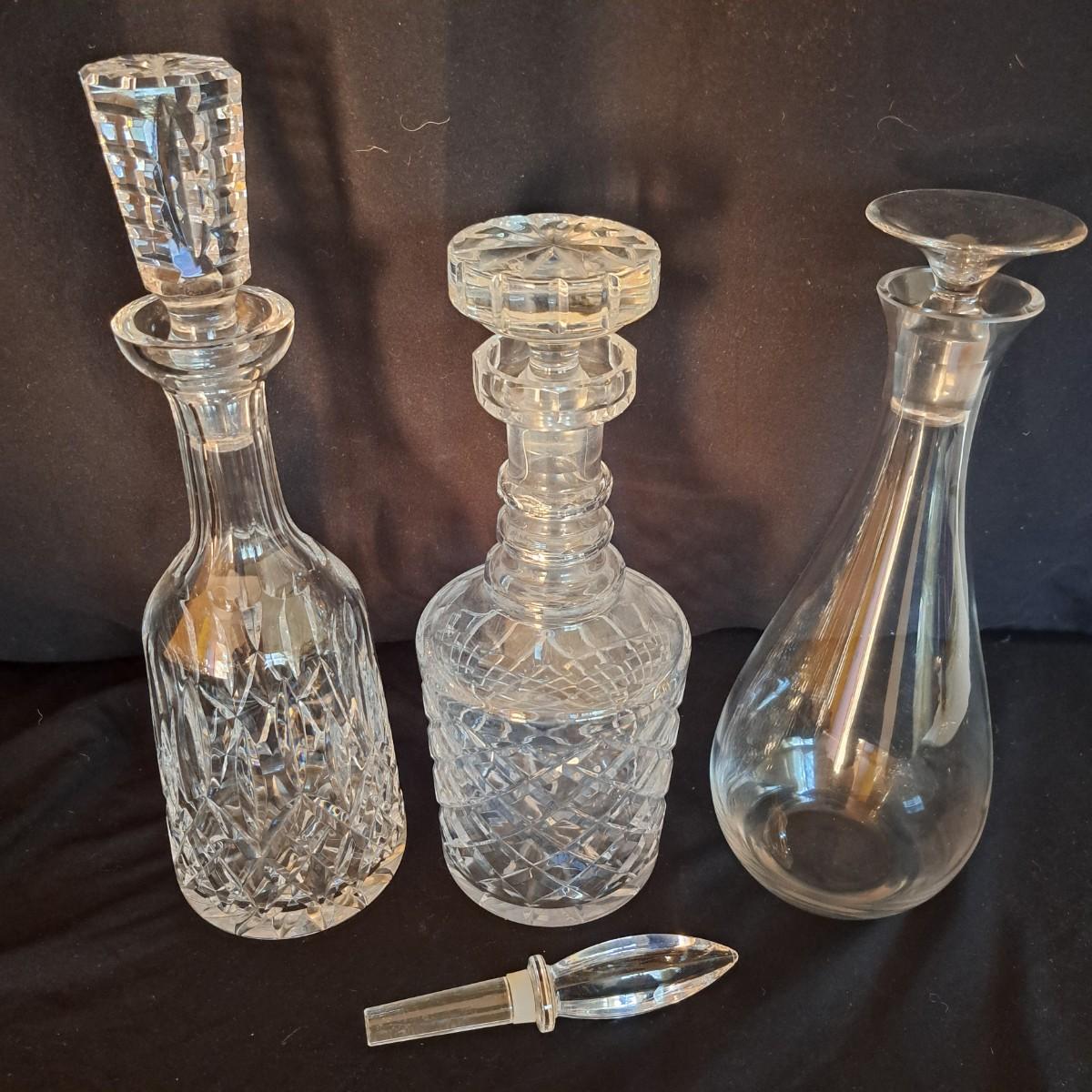 This grouping of 28 barware pieces ranges from five - 2"H decanter labels to a 13.25"H crystal glass decanter. Of the five decanter labels three are stamped "R&K" with a lion hallmark. There are 11 glass swizzle/stirring sticks, a Rosenthal crystal glass champagne taster, 2 rocks glasses (*one marked Waterford, the other with a small nick to rim), 2 cordials marked Waterford, a pitcher marked Waterford (*has crack as shown), 3 decanters (*one featured in photos marked Waterford) all with stoppers in very fine condition along with an additional single lone stopper. Finally, two large thick and heavy rocks tumblers marked "BLOCK" at bases. Shipping available. Shipping can be costly. We suggest contacting our preferred local shipping provider, Postage Express, with dimensions and getting an estimate before bidding: (828) 255-9250 or shipping@postageexpressnc.com.