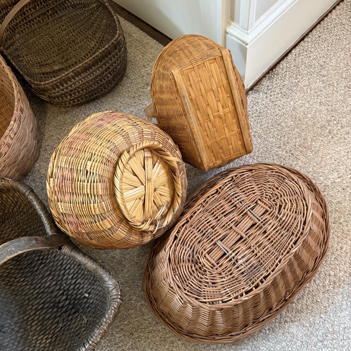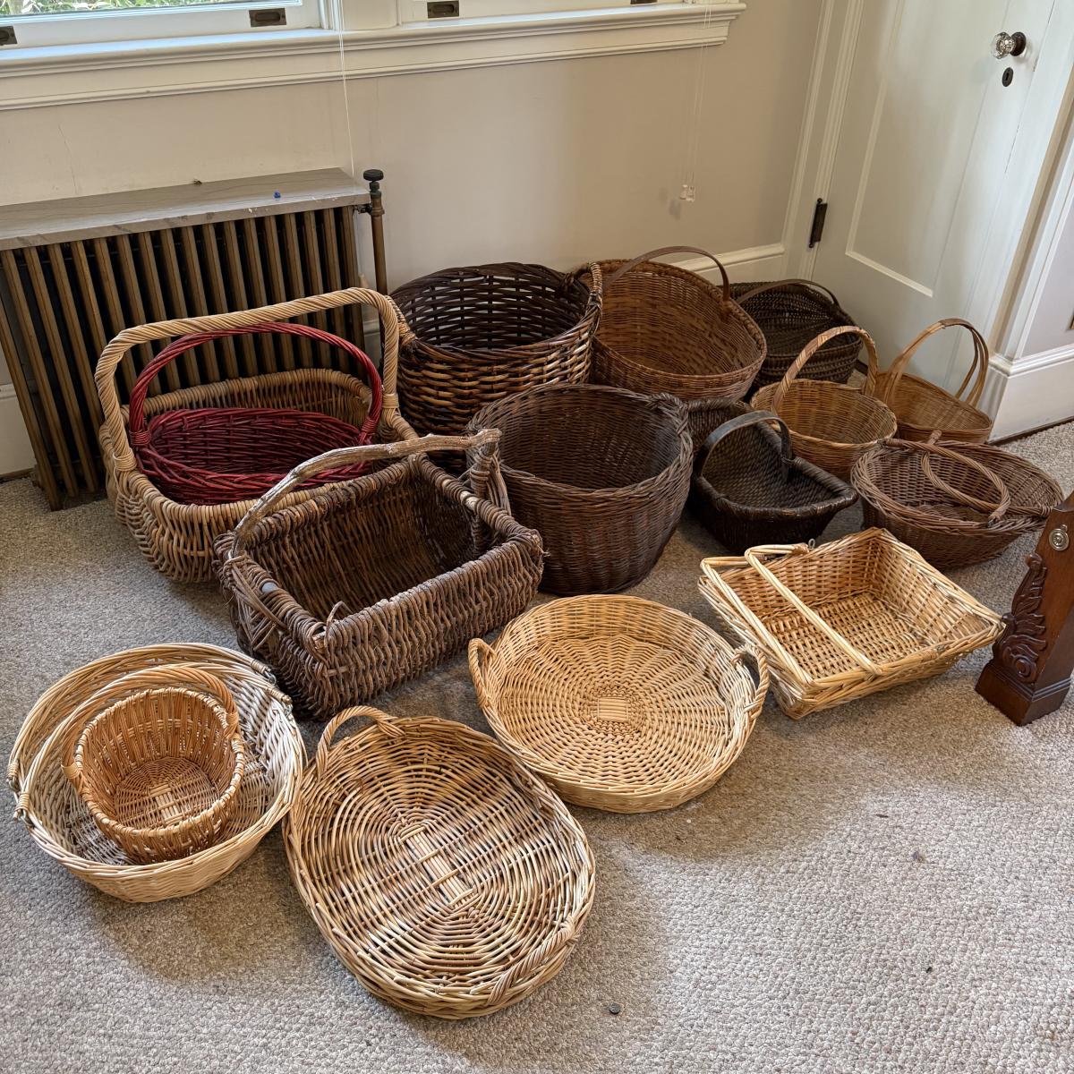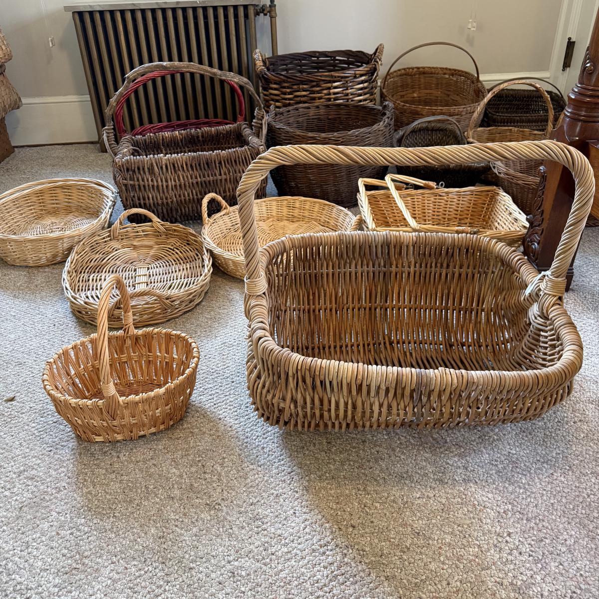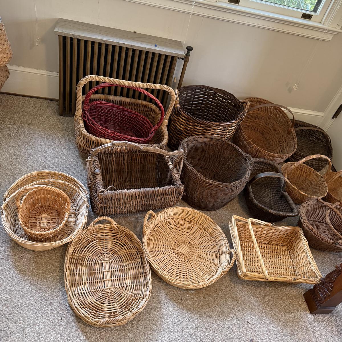 This lot contains an amazing collection of 16 wicker baskets. These baskets vary in shape, size and color. The largest basket is a rectangular shape with a medium color and a very sturdy handle. This one measures 24” x 20” x 21”H. The smallest basket is a light colored, oval shaped basket with a rounded handle that measures 12” x 9.5” x 12”H. Most of these baskets are old but in pretty good condition. See pictures for any known rips or damages as well as full inventory. Local pick up only.
