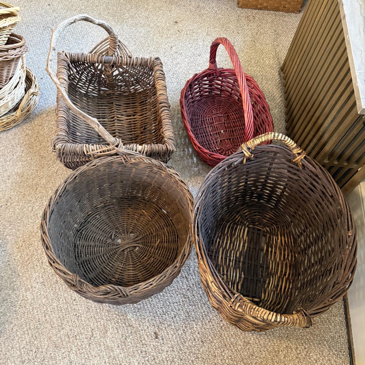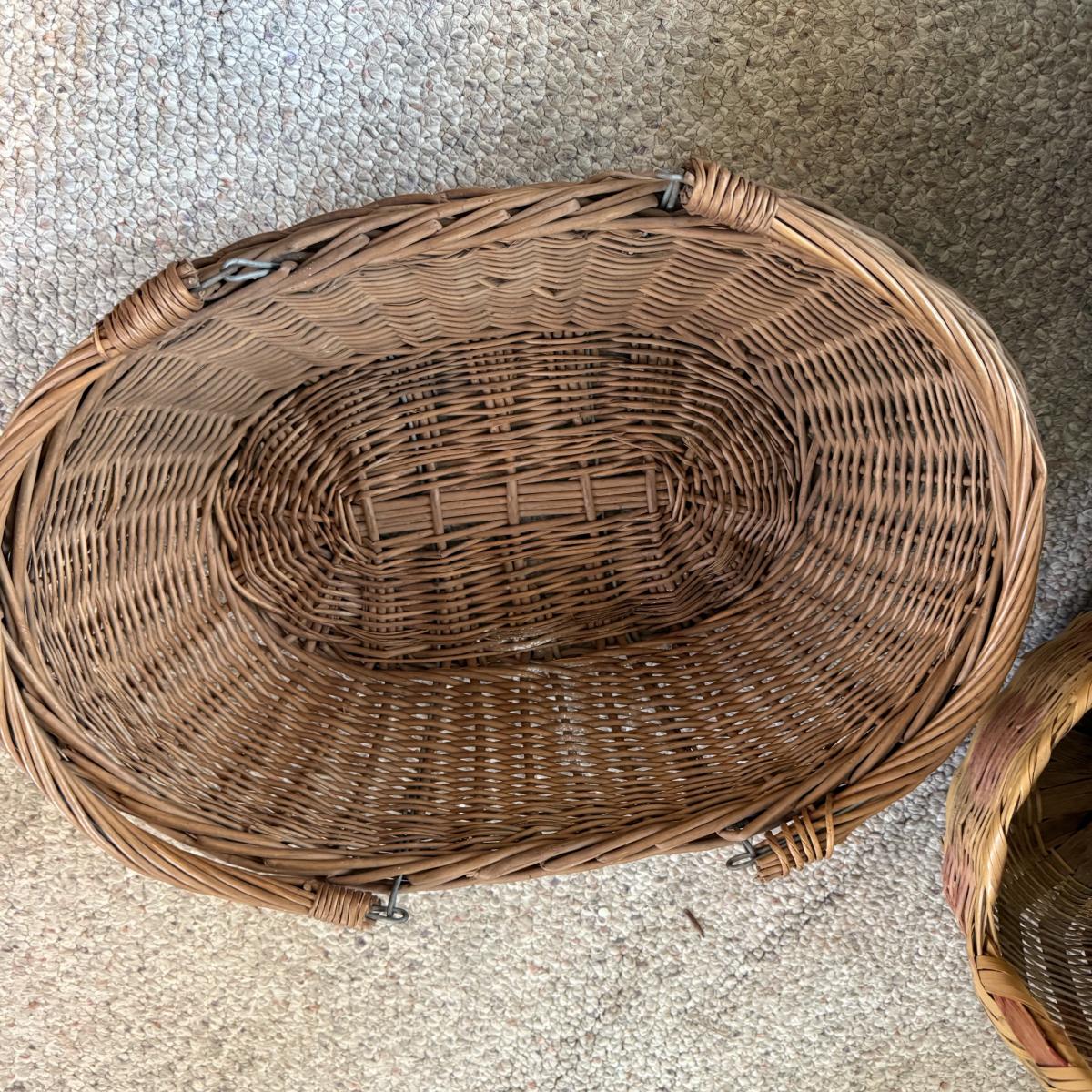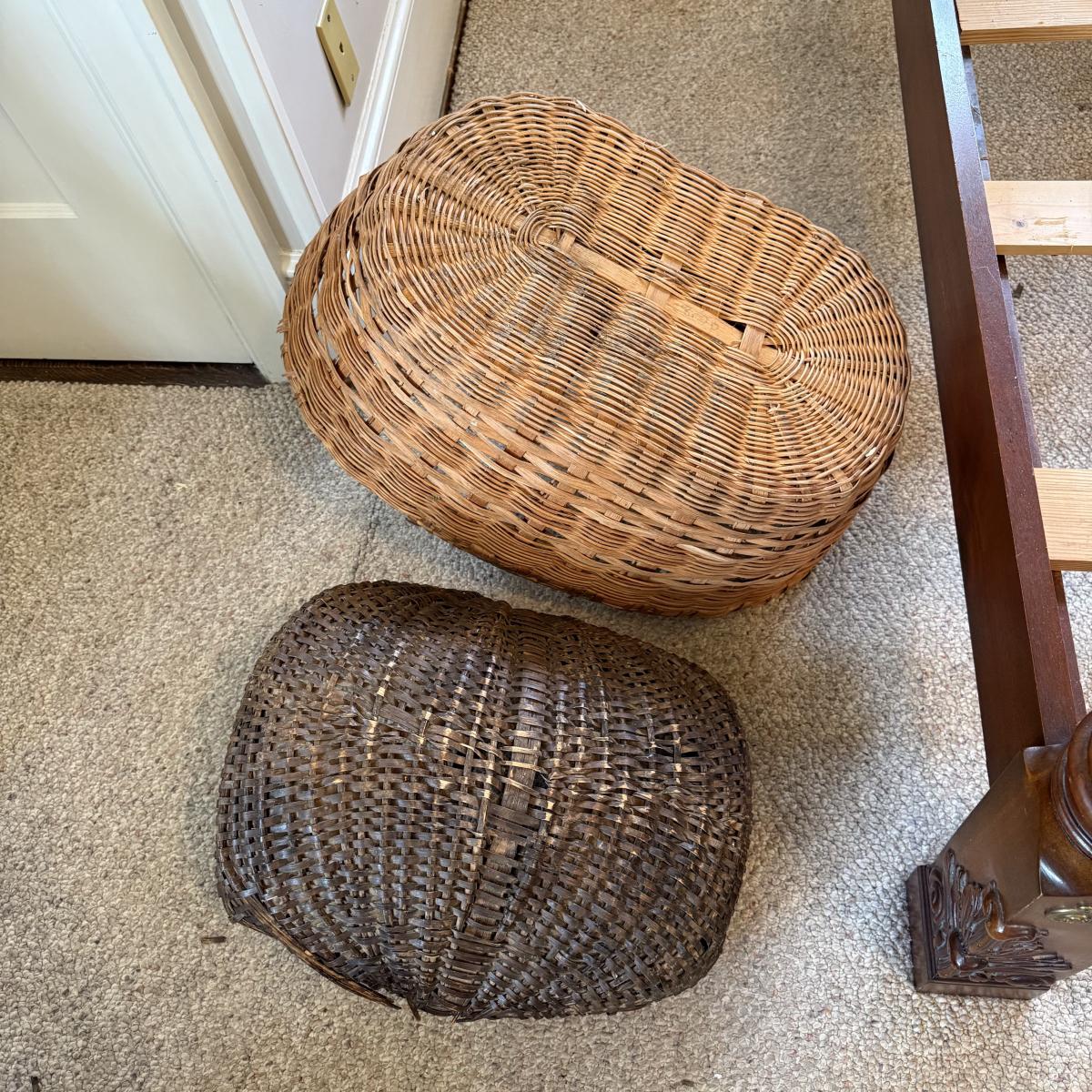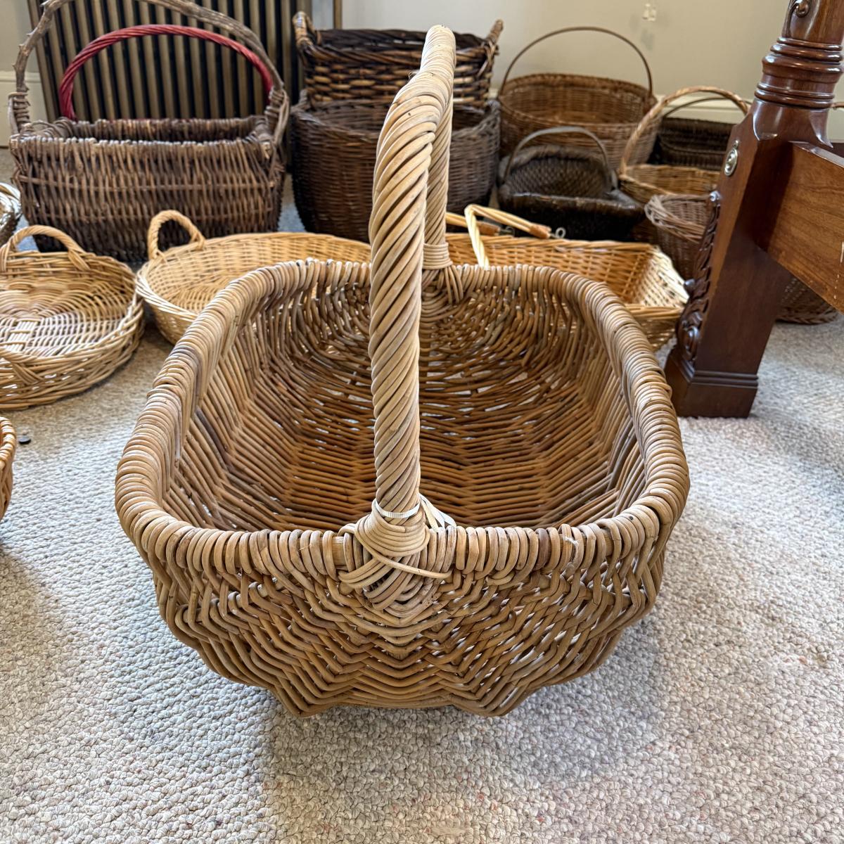This lot contains an amazing collection of 16 wicker baskets. These baskets vary in shape, size and color. The largest basket is a rectangular shape with a medium color and a very sturdy handle. This one measures 24” x 20” x 21”H. The smallest basket is a light colored, oval shaped basket with a rounded handle that measures 12” x 9.5” x 12”H. Most of these baskets are old but in pretty good condition. See pictures for any known rips or damages as well as full inventory. Local pick up only.