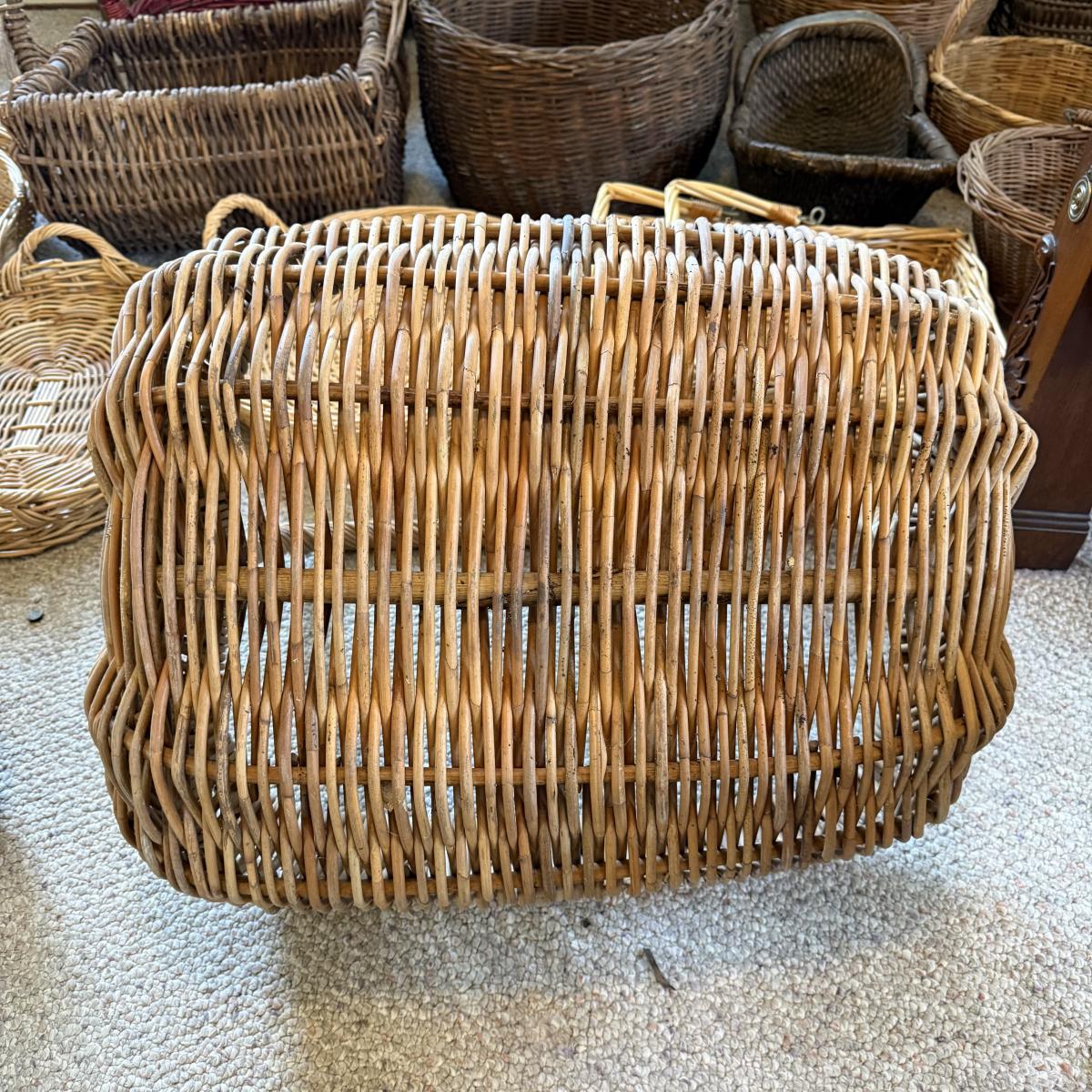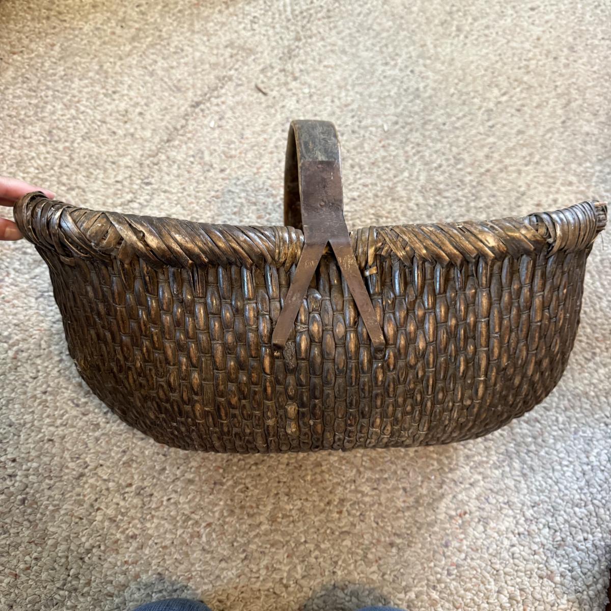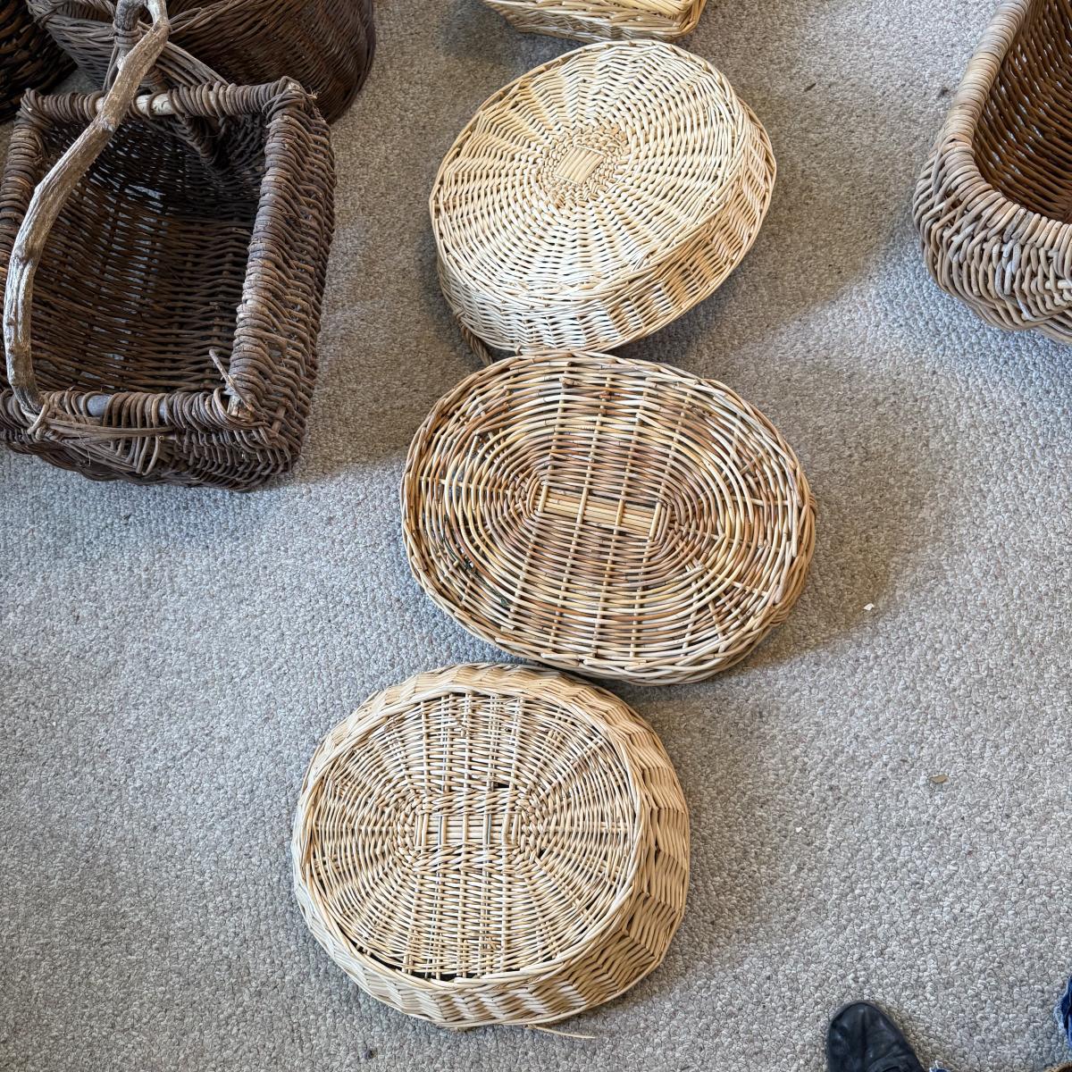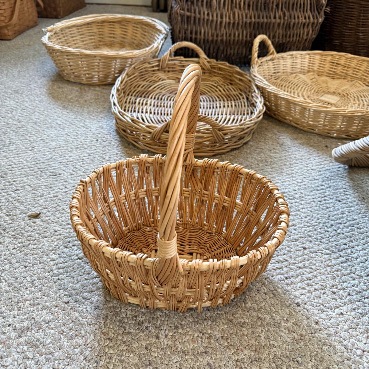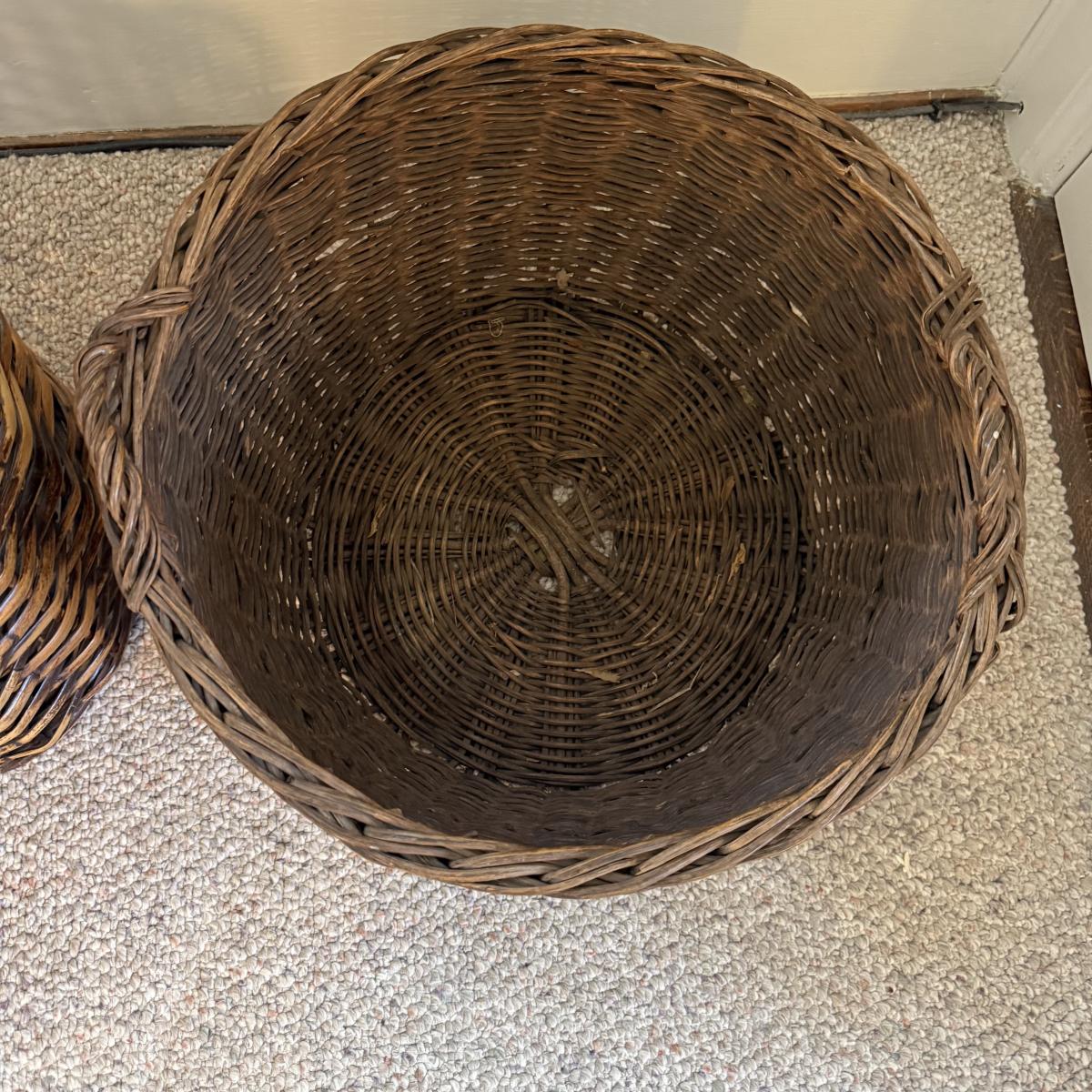 This lot contains an amazing collection of 16 wicker baskets. These baskets vary in shape, size and color. The largest basket is a rectangular shape with a medium color and a very sturdy handle. This one measures 24” x 20” x 21”H. The smallest basket is a light colored, oval shaped basket with a rounded handle that measures 12” x 9.5” x 12”H. Most of these baskets are old but in pretty good condition. See pictures for any known rips or damages as well as full inventory. Local pick up only.