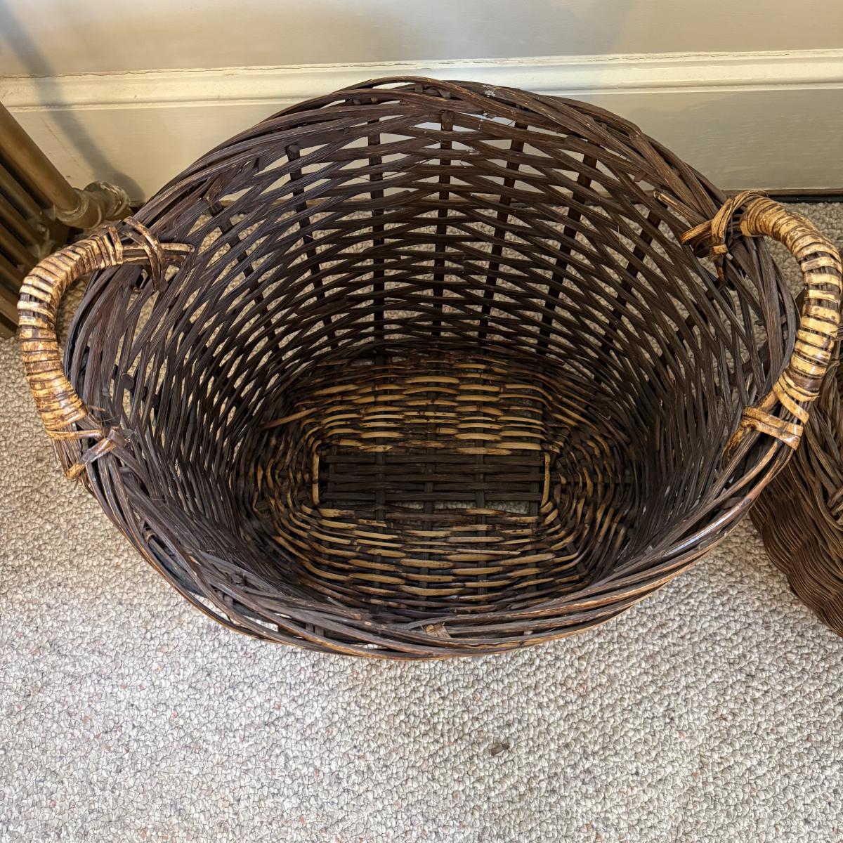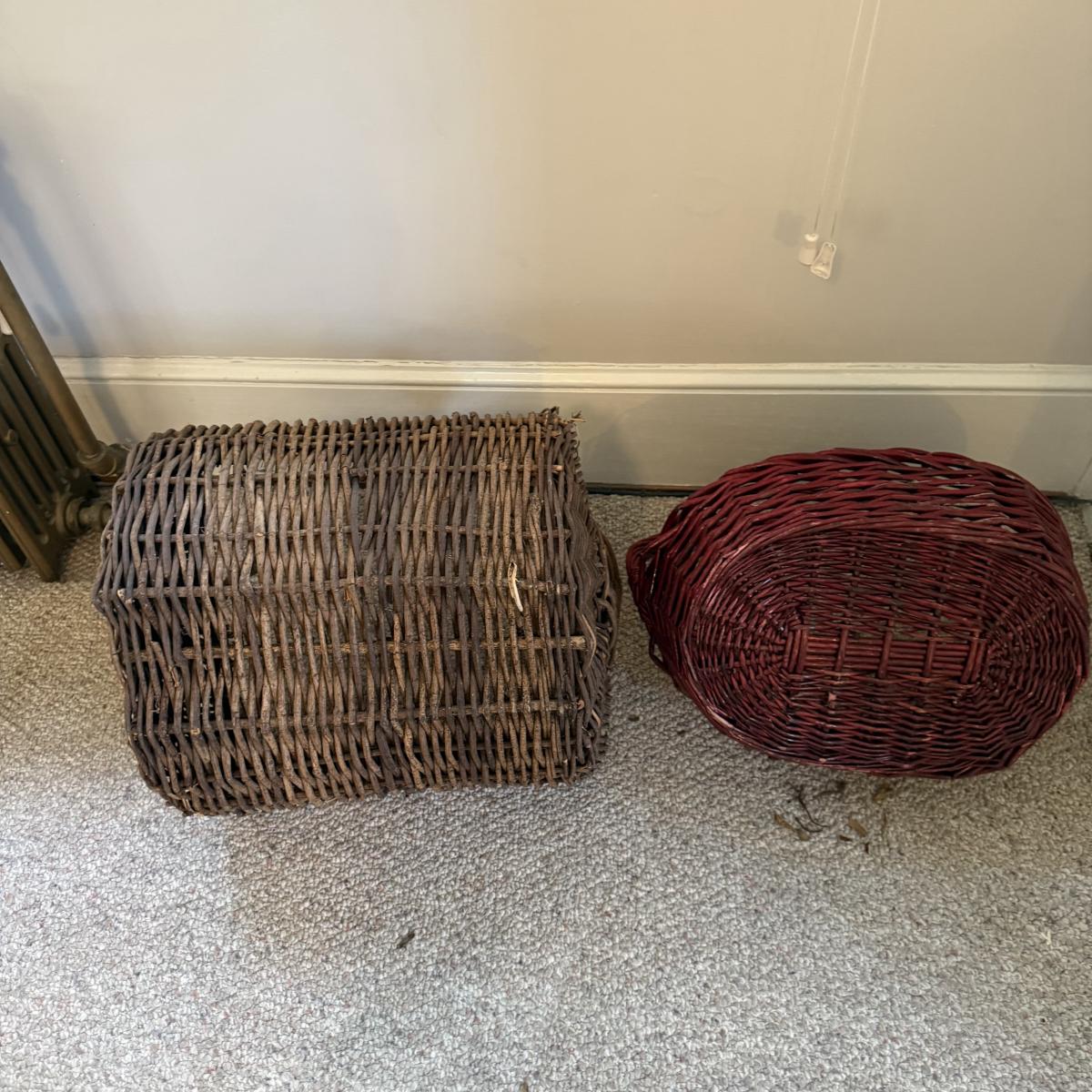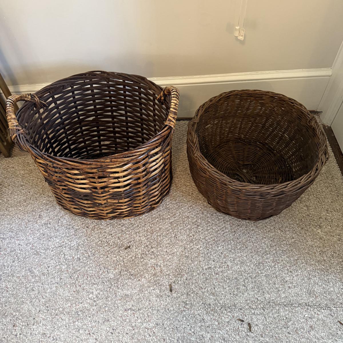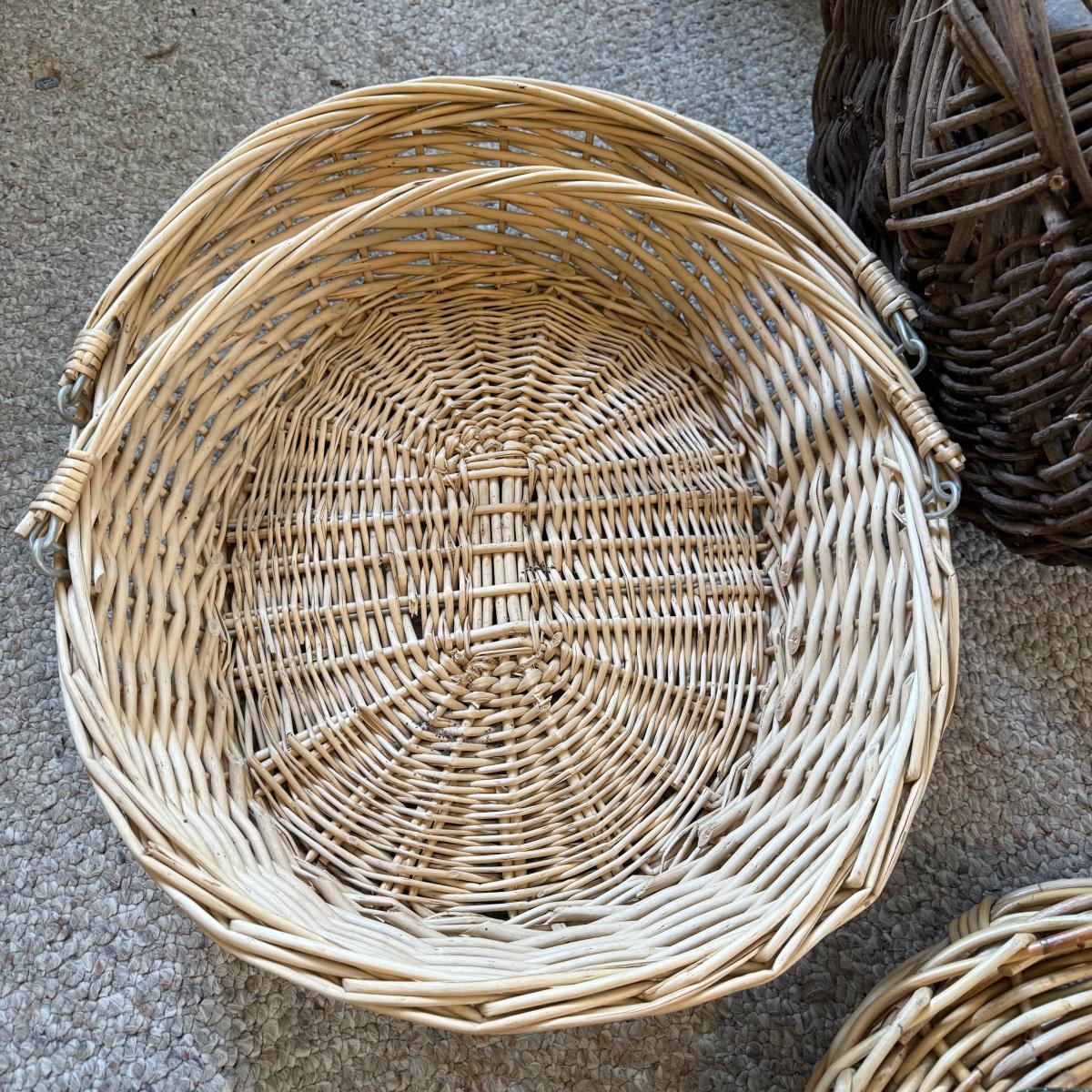 This lot contains an amazing collection of 16 wicker baskets. These baskets vary in shape, size and color. The largest basket is a rectangular shape with a medium color and a very sturdy handle. This one measures 24” x 20” x 21”H. The smallest basket is a light colored, oval shaped basket with a rounded handle that measures 12” x 9.5” x 12”H. Most of these baskets are old but in pretty good condition. See pictures for any known rips or damages as well as full inventory. Local pick up only.