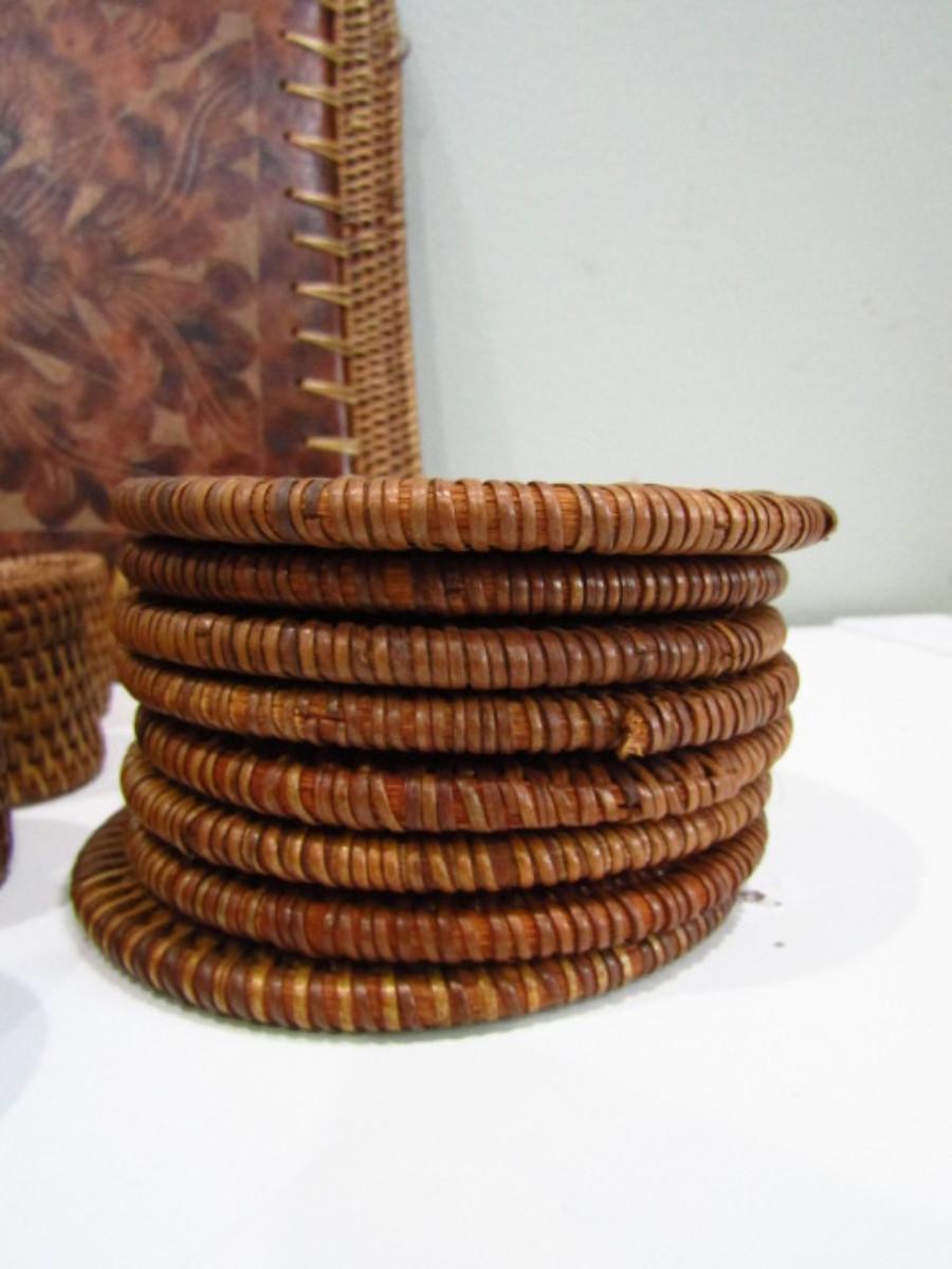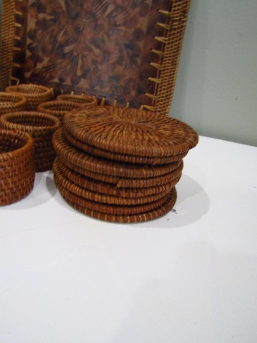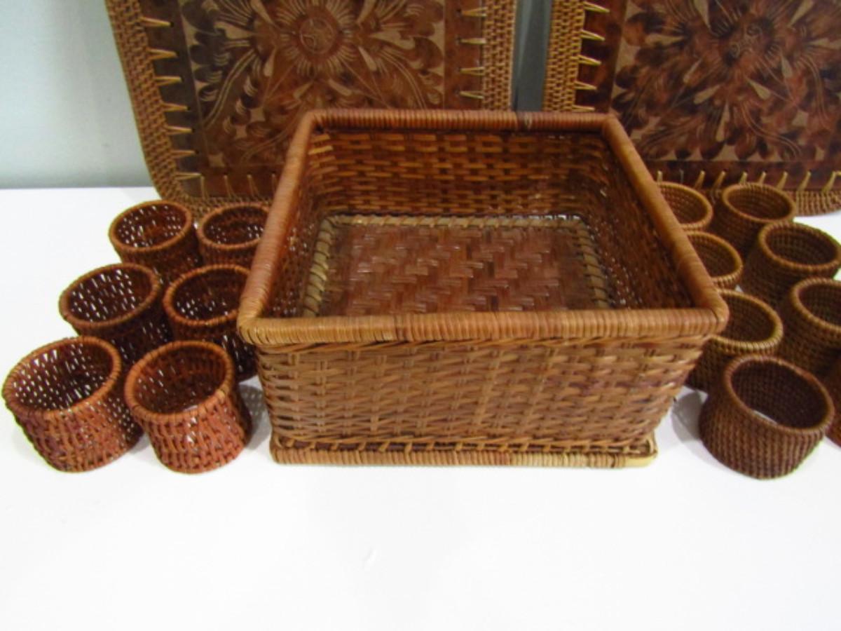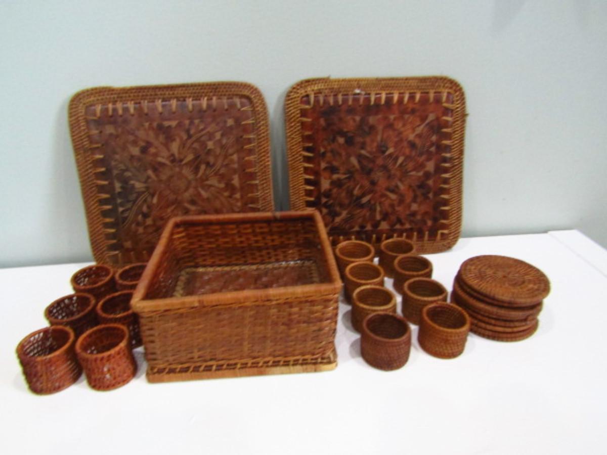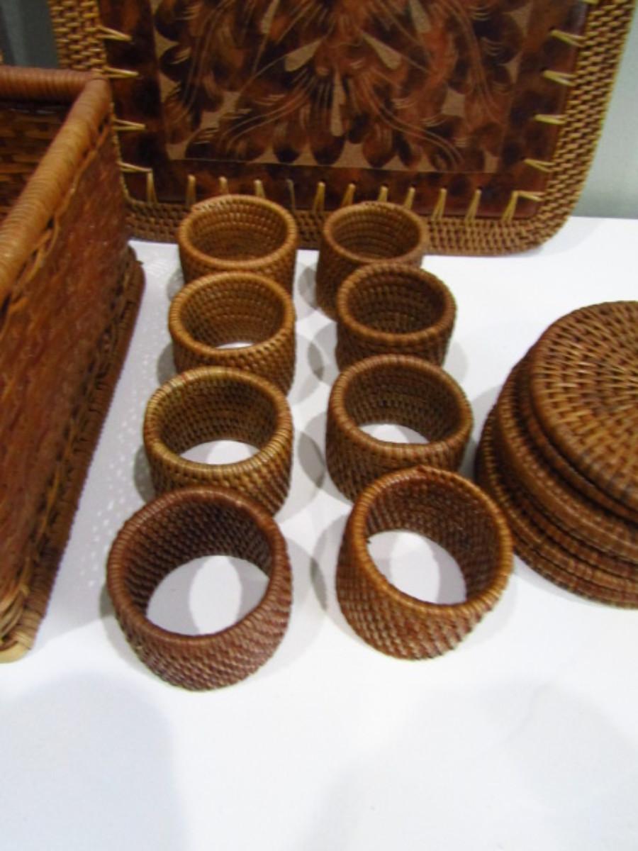 Collection of Wicker Table Accessories (DR). Napkin basket, napkin rings (2 types- 10 pcs total), coasters, and 2 trivets.