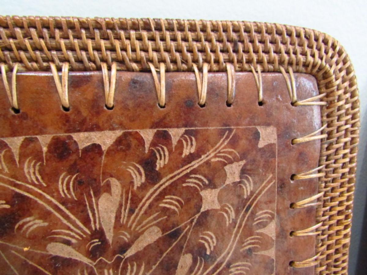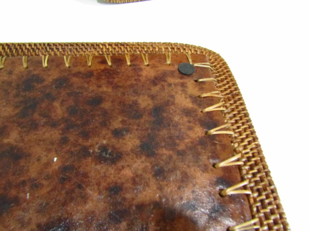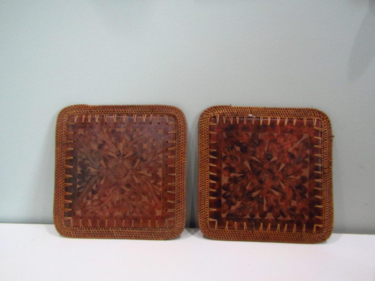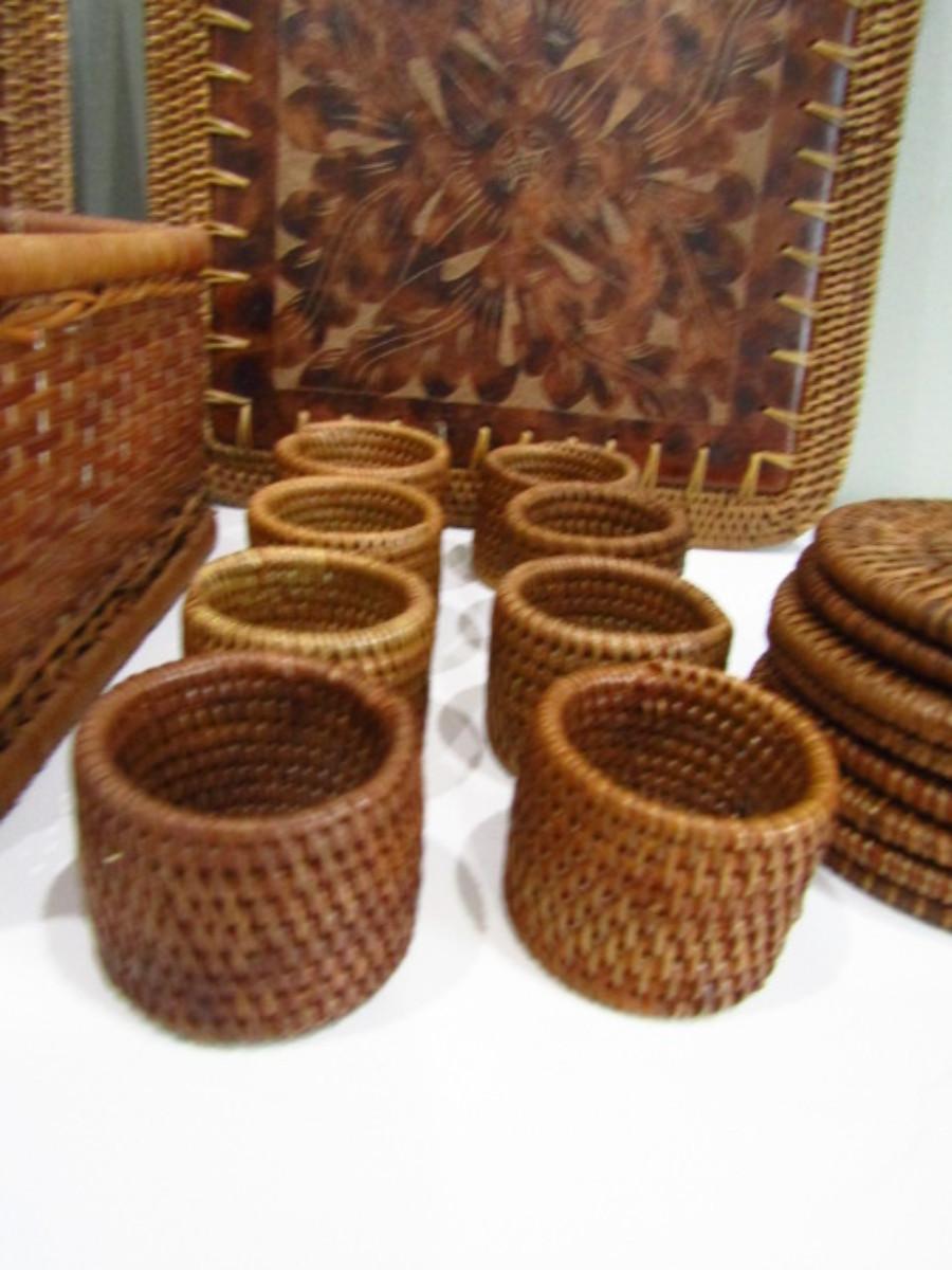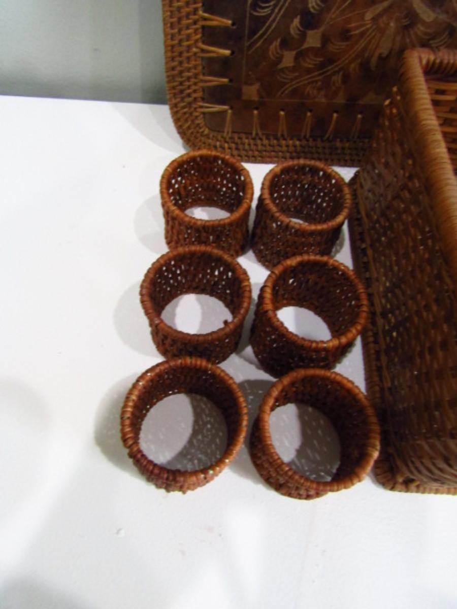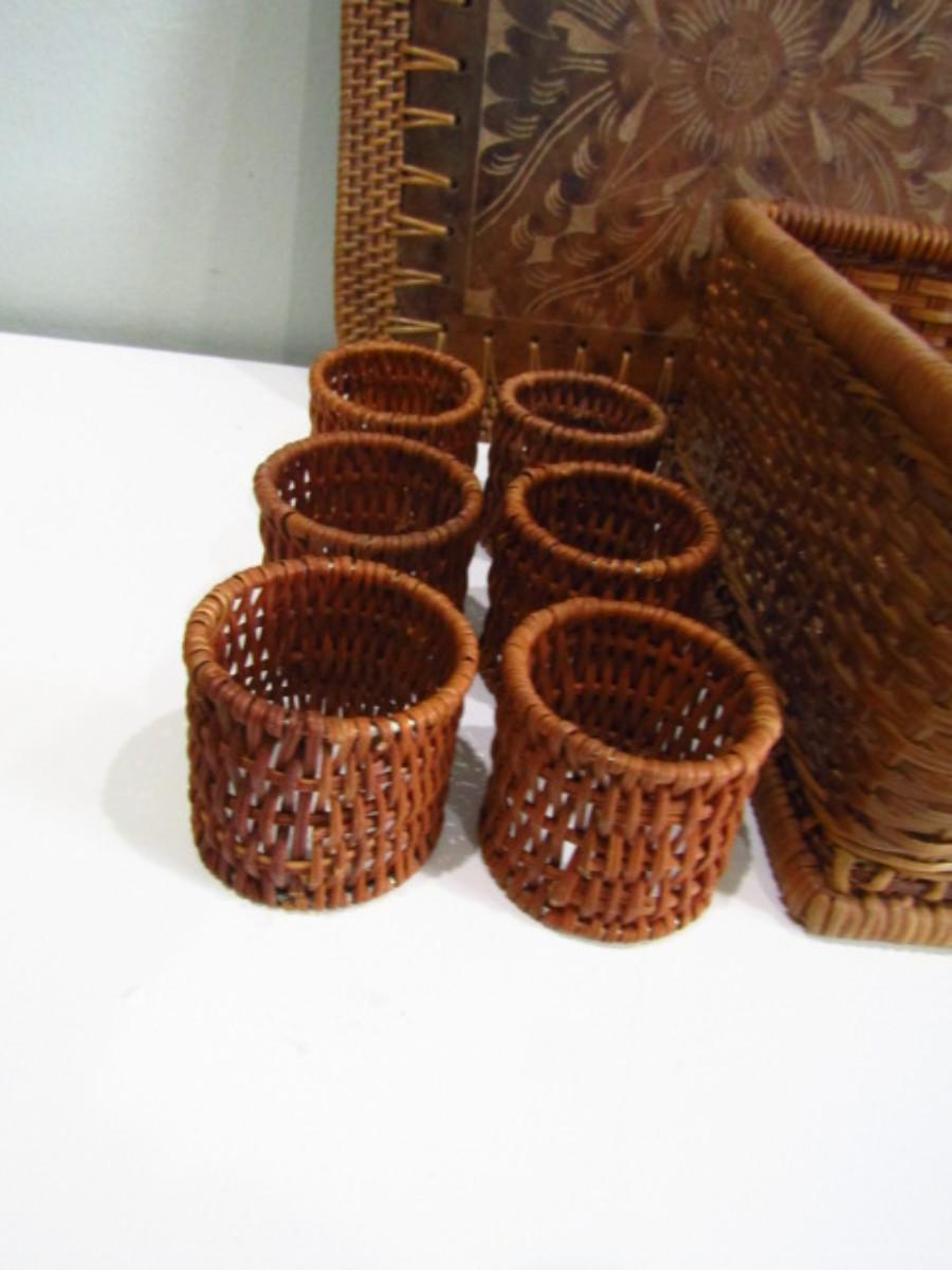 Collection of Wicker Table Accessories (DR). Napkin basket, napkin rings (2 types- 10 pcs total), coasters, and 2 trivets.
