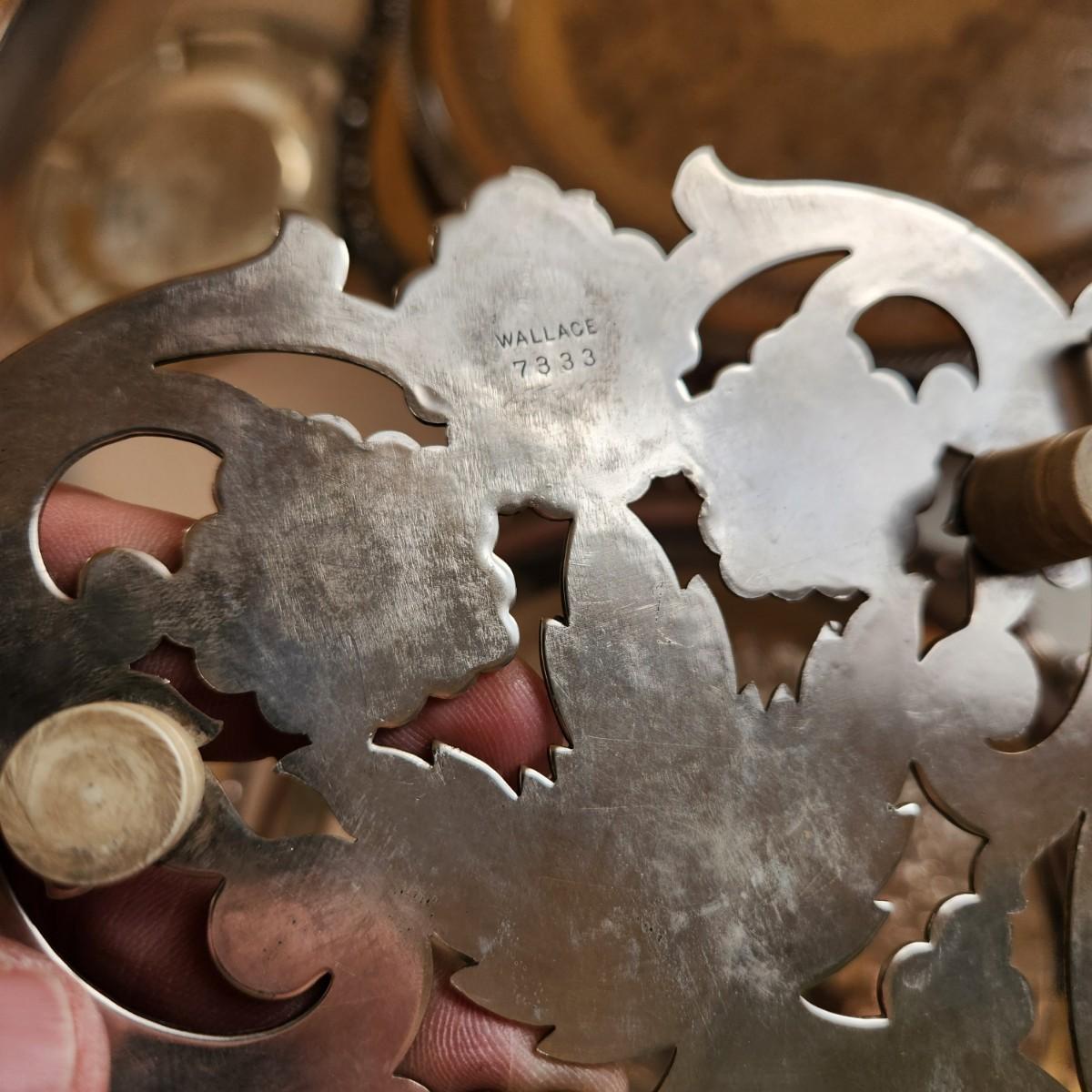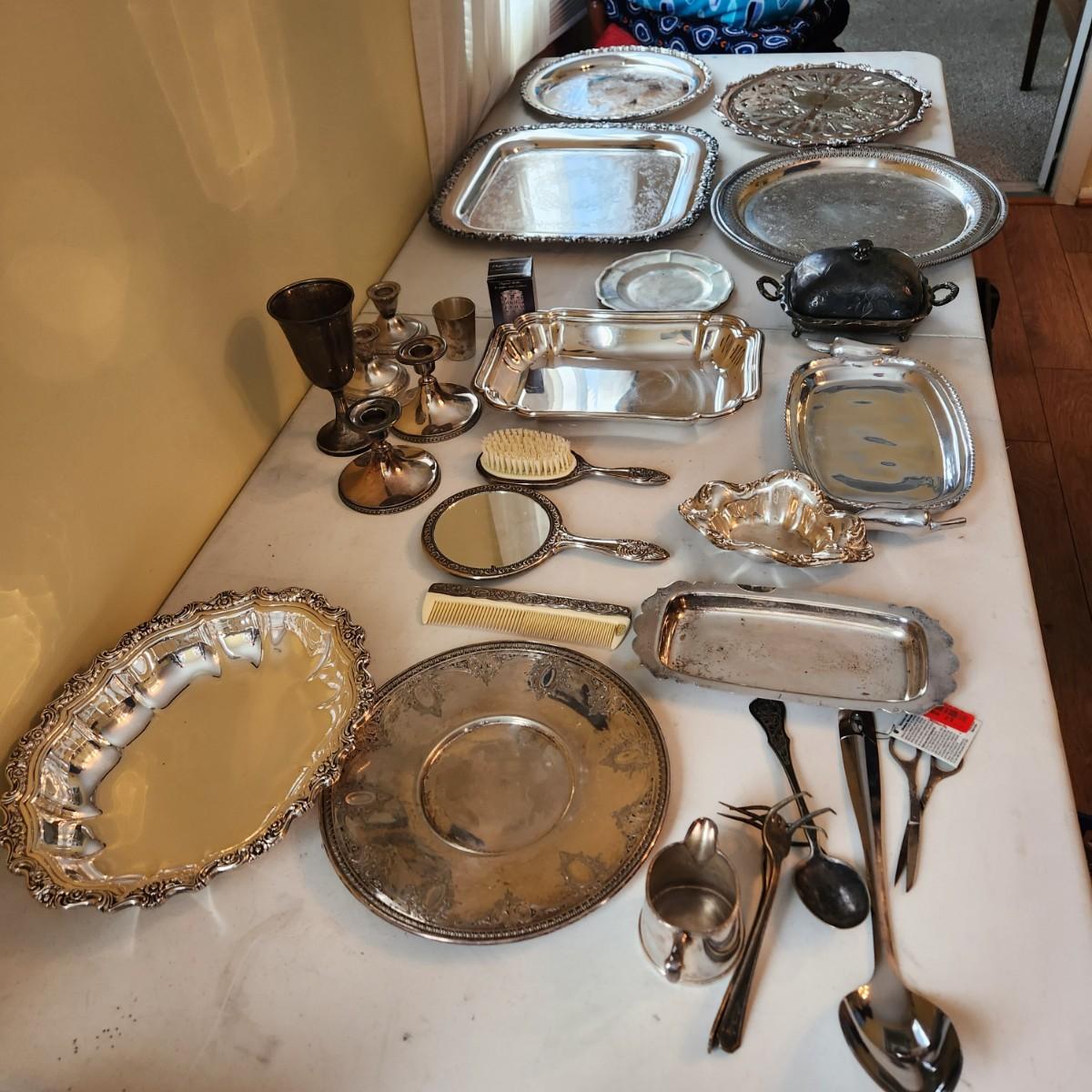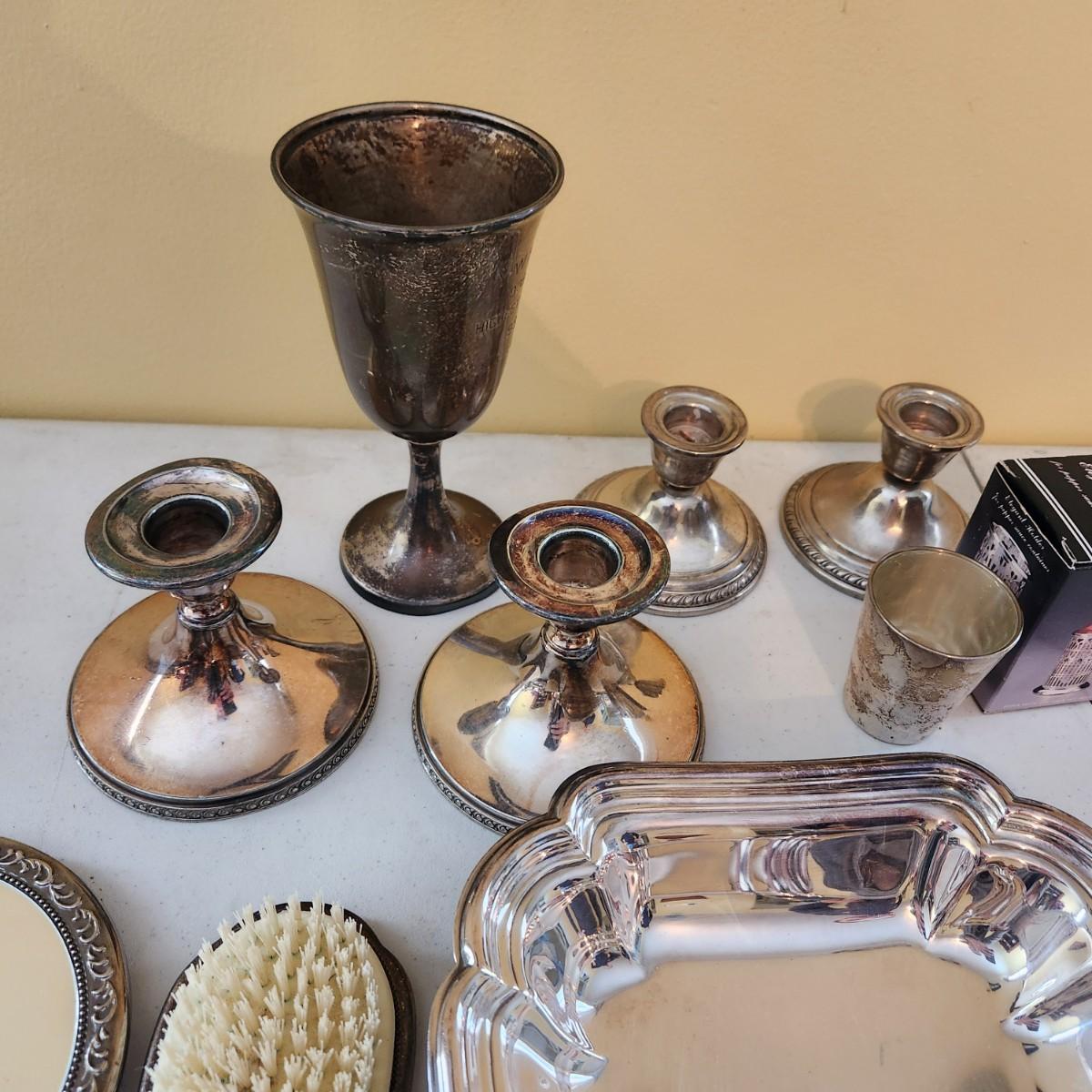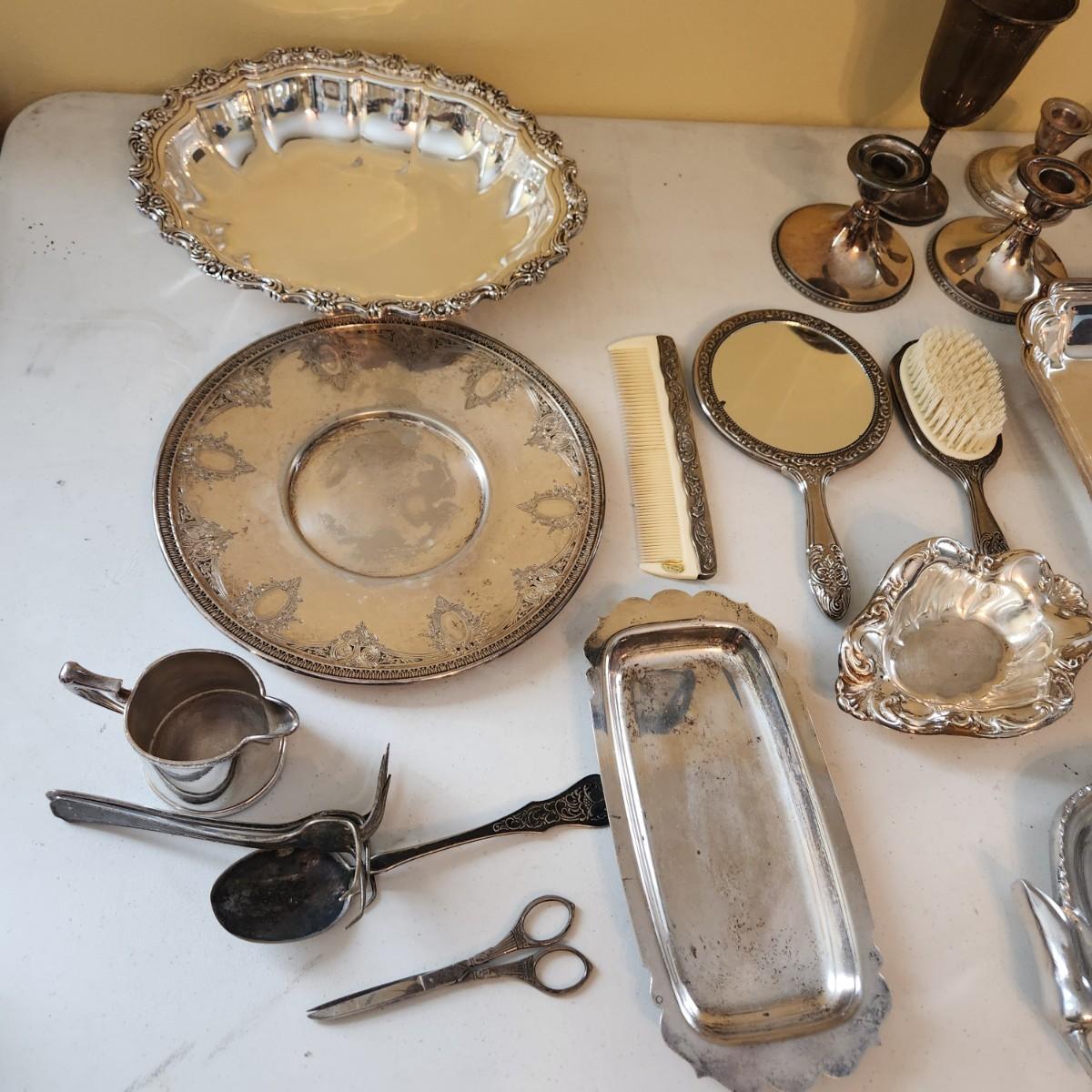 Collection of Wilcox Rogers Wallace Silverplate Platters Butter dish Candle holders Dishes Vanity Mirror brush comb