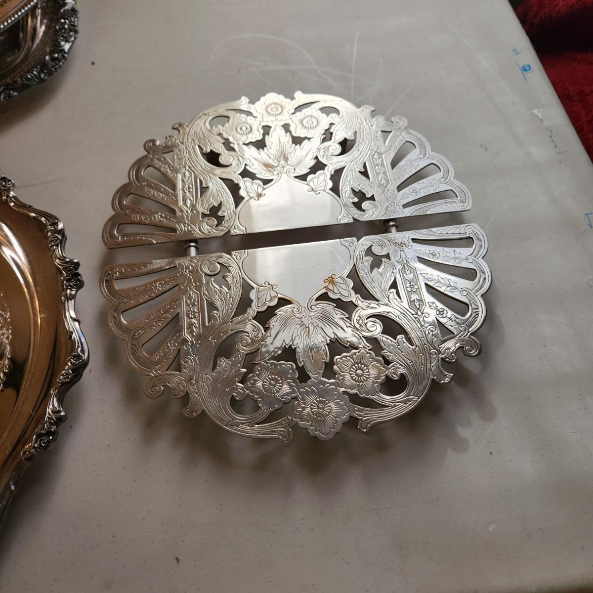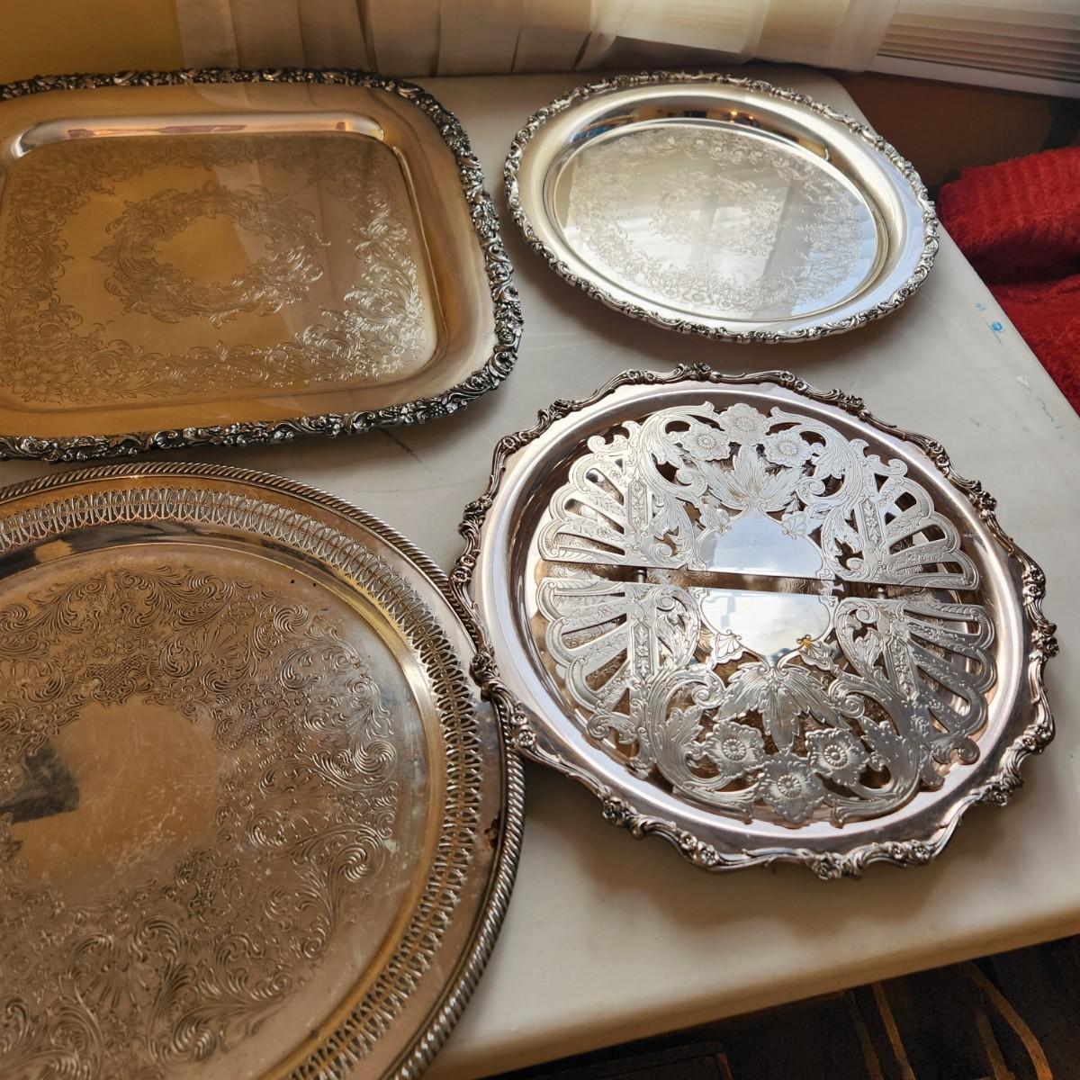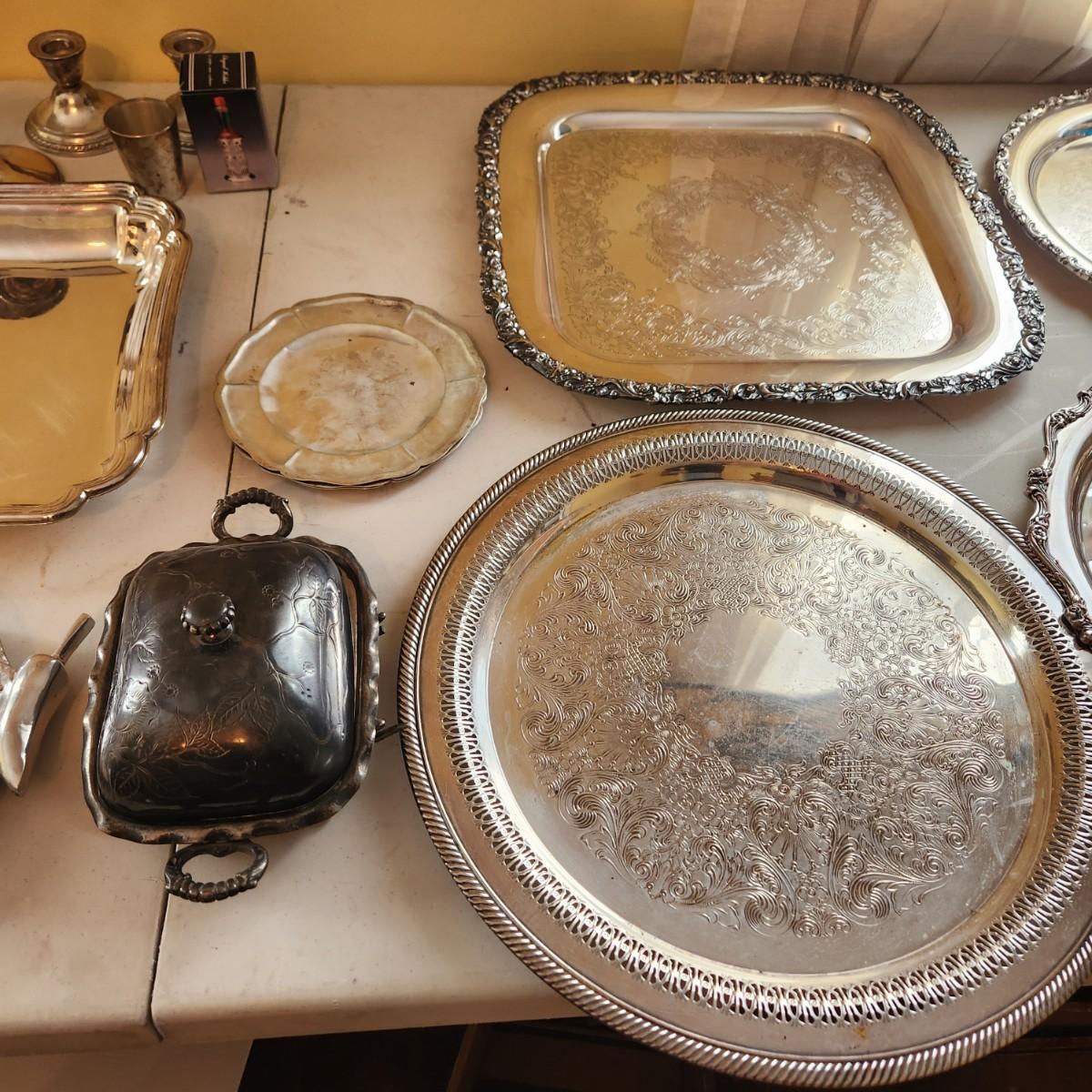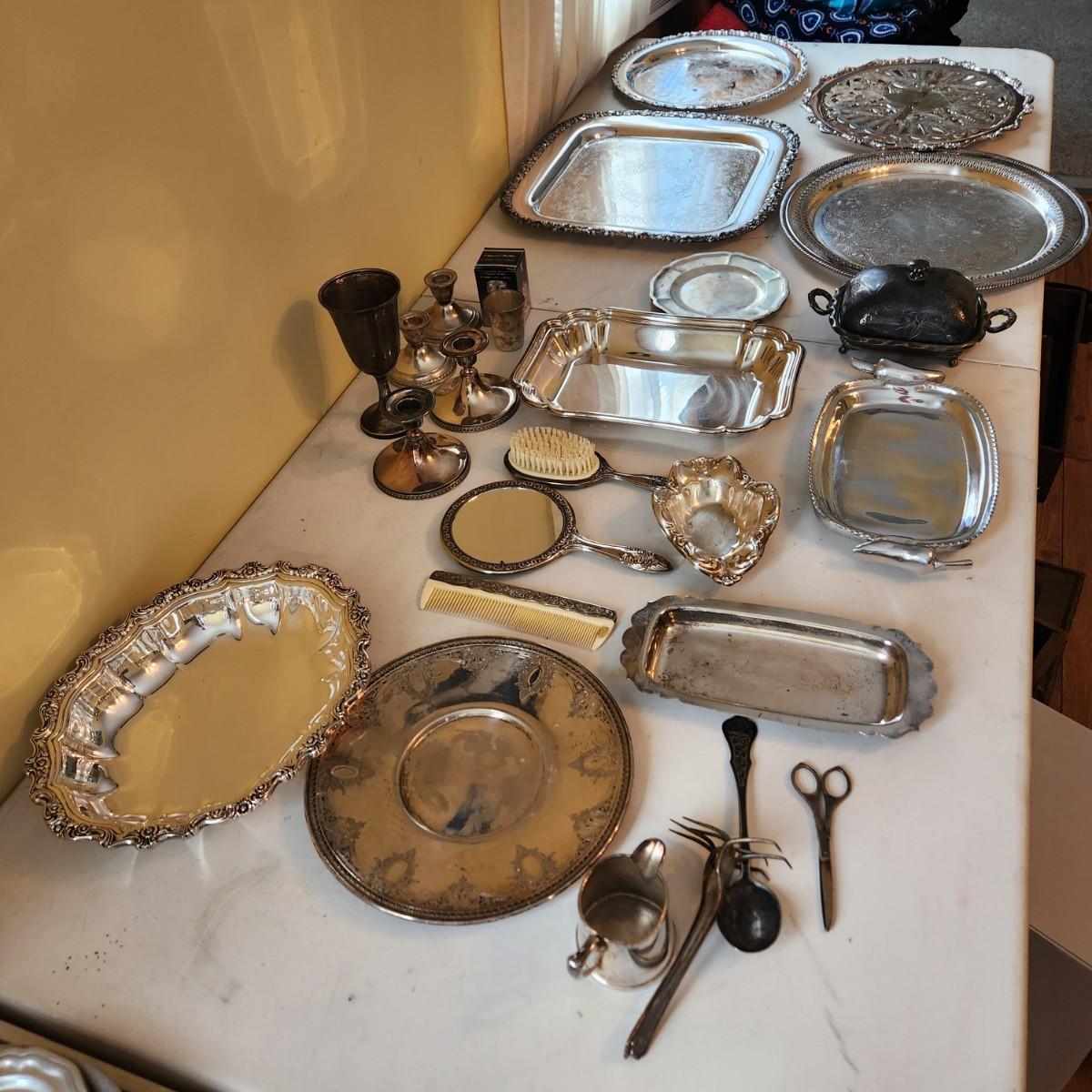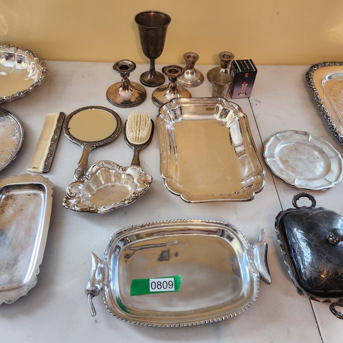 Collection of Wilcox Rogers Wallace Silverplate Platters Butter dish Candle holders Dishes Vanity Mirror brush comb