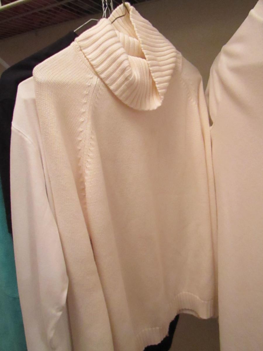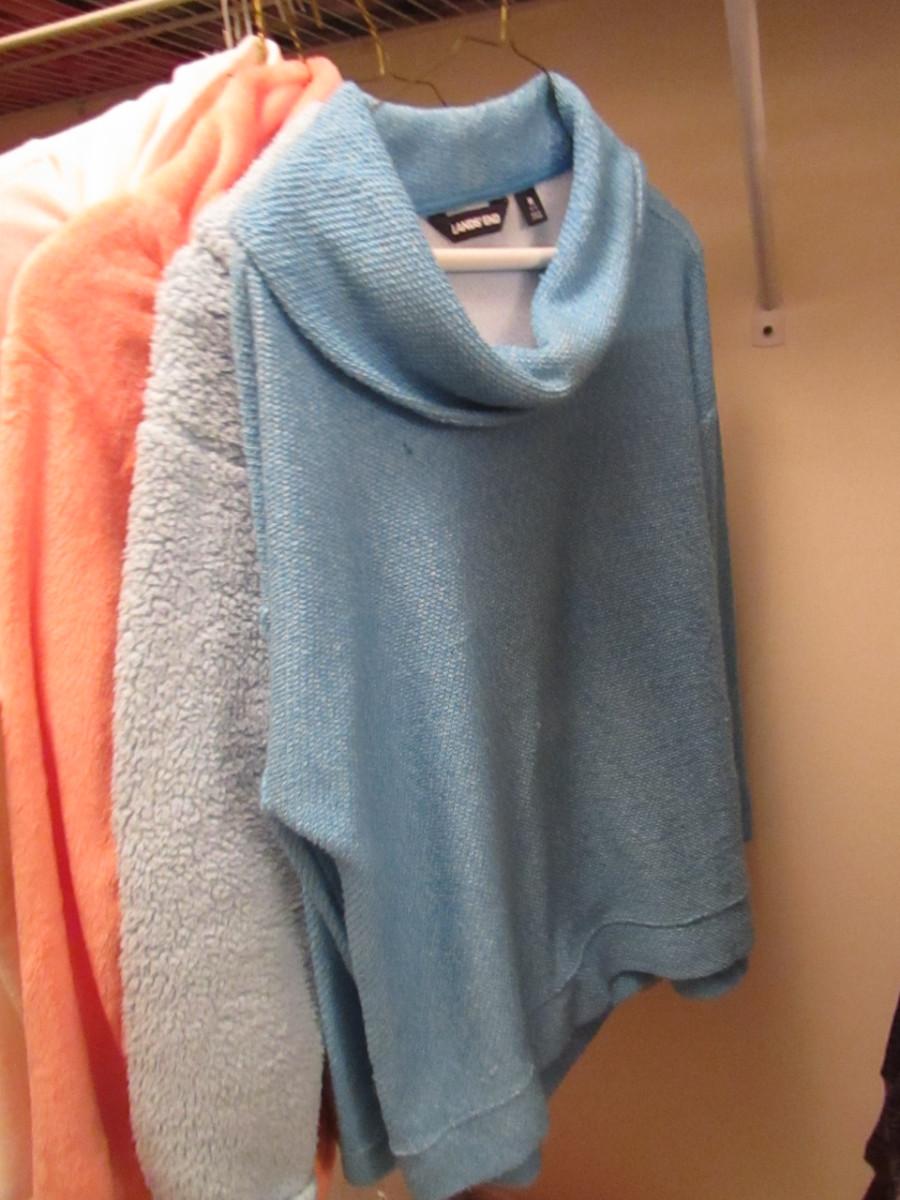 Collection of Women's Clothing- Leather Jacket and Long Sleeve Tops. Jacket is by Chance Encounters and is size medium. Tops are from multiple makers: LL Bean, Land's End, Bechamel- size medium and large. **Brown coat shown in left side of picture is not included with this lot.**