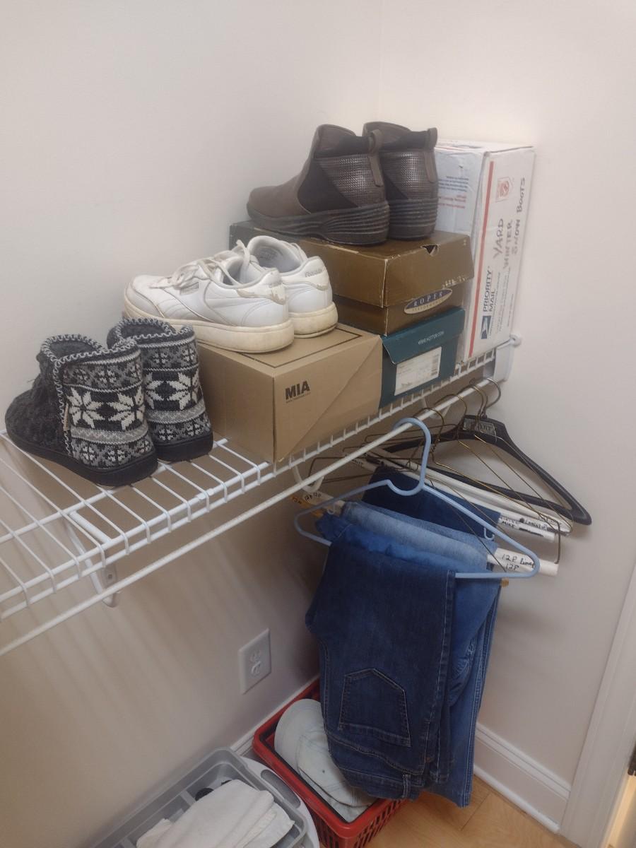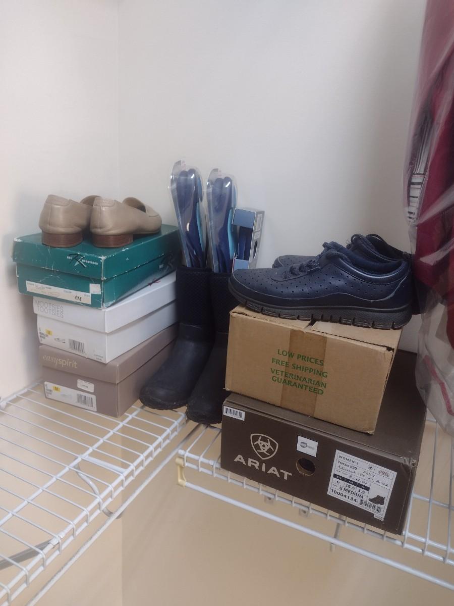 Collection of Women's Fashion Clothes, Shoes, Apparel Mostly Medium Petite Sizes. Some shoe boxes may be empty.