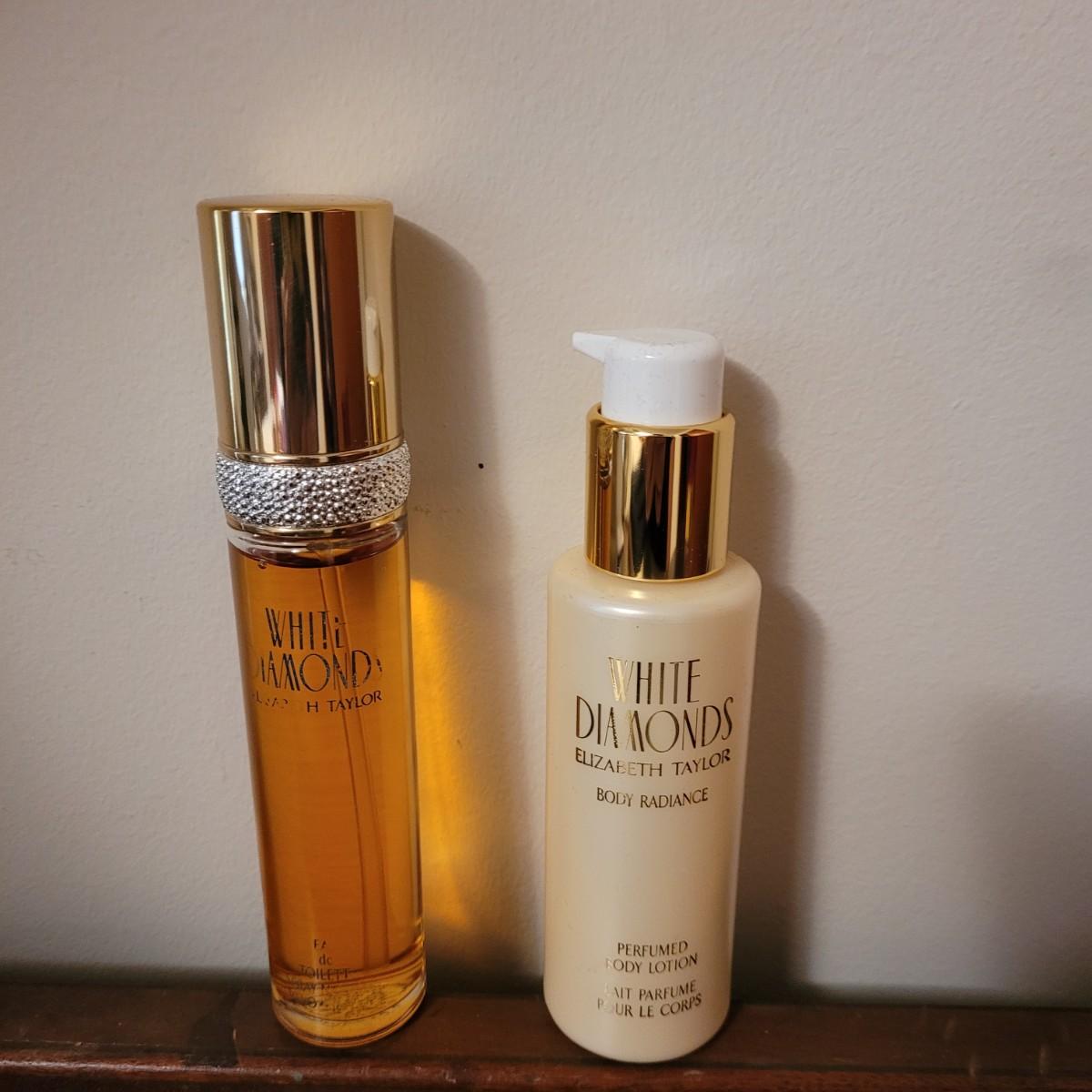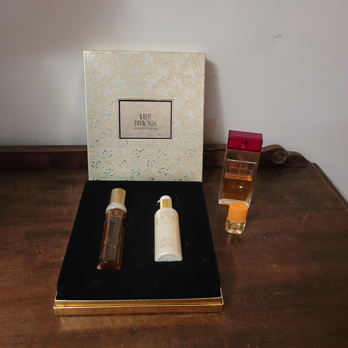 Small collection of women's perfumes, including White Diamonds by Elizabeth Taylor (lotion and perfume set), Dolce & Gabana, and Clinique Happy. Shipping available.