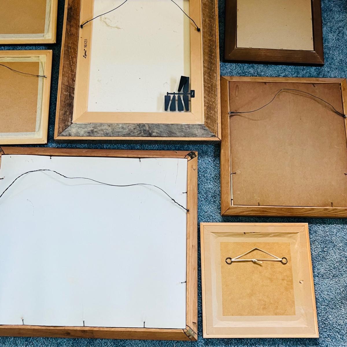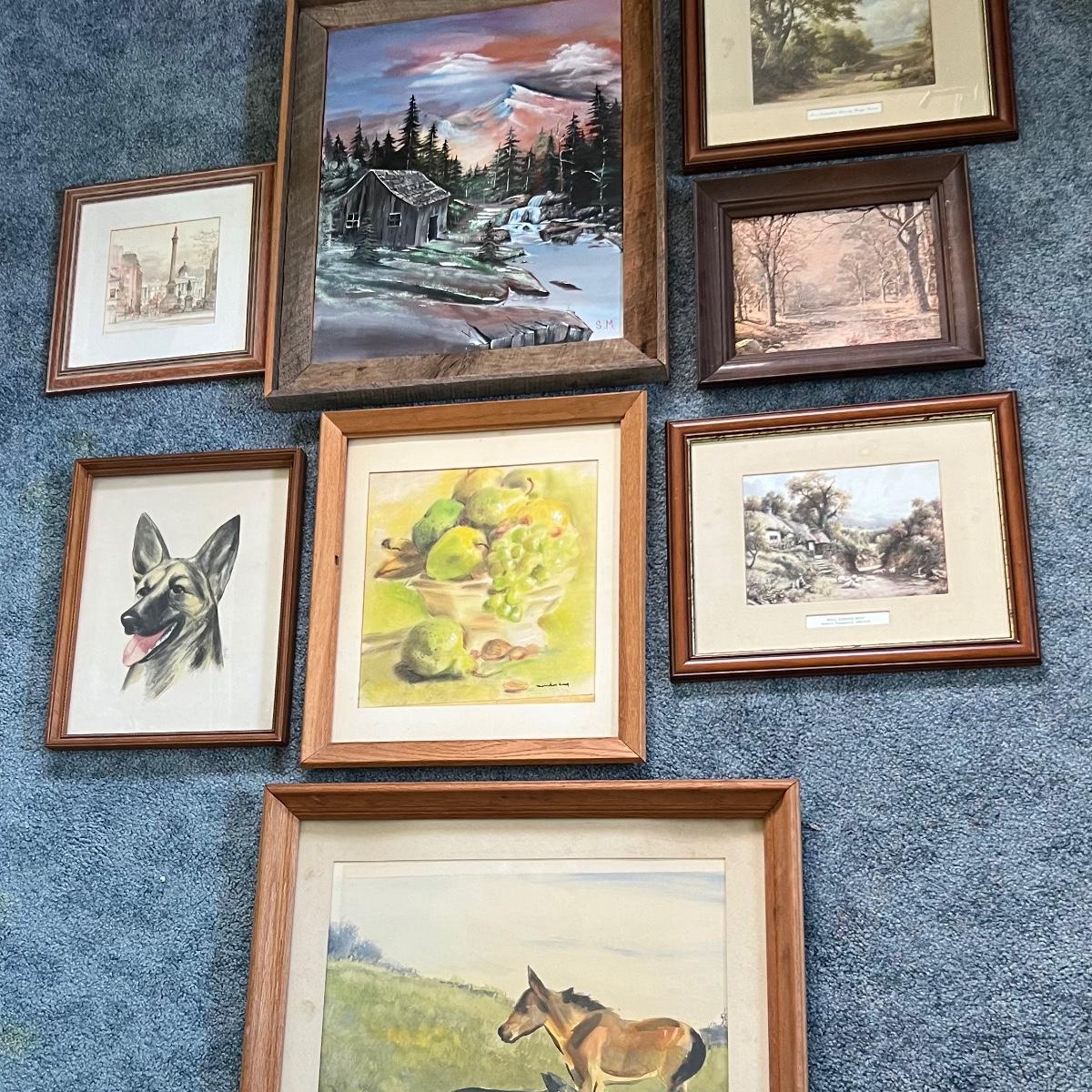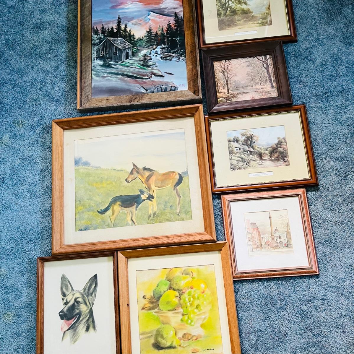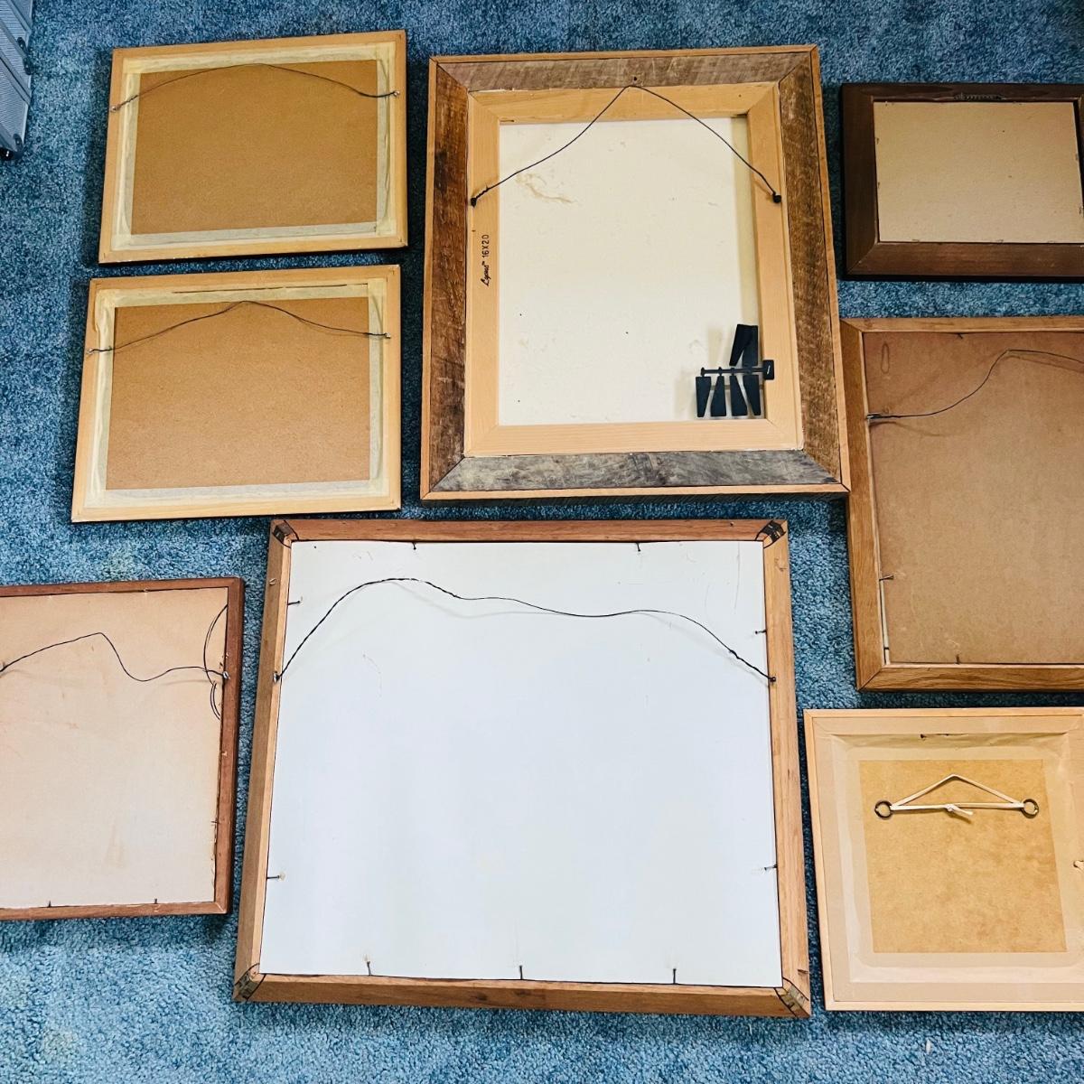 Lot includes a variety of eight wood framed paintings/prints in different finishes and sizes. Large rustic frame measures 16”x20”.