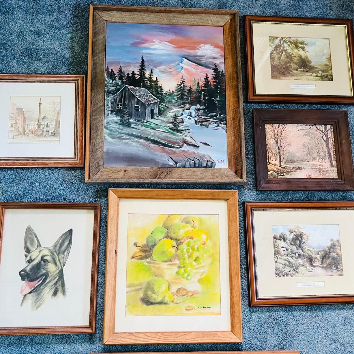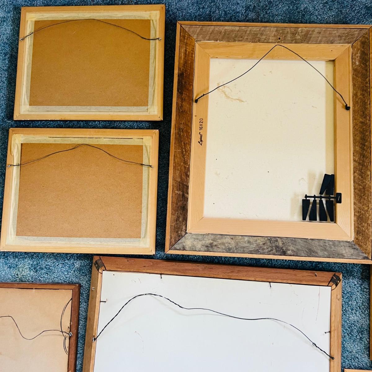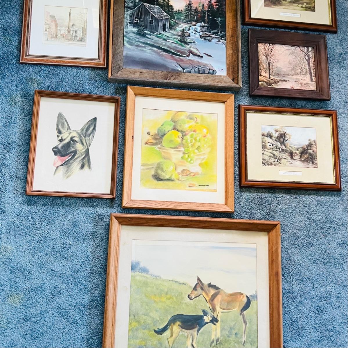 Lot includes a variety of eight wood framed paintings/prints in different finishes and sizes. Large rustic frame measures 16”x20”.