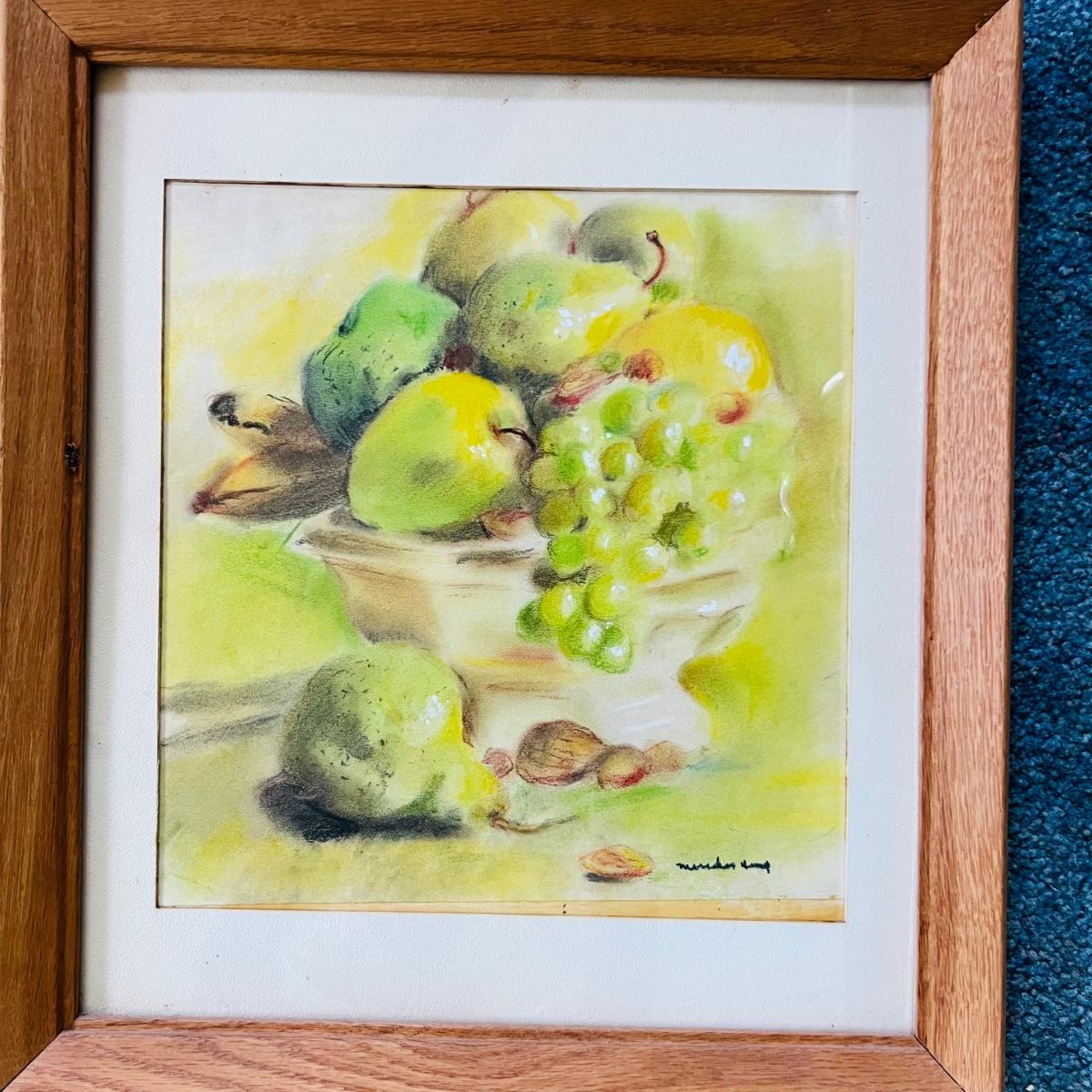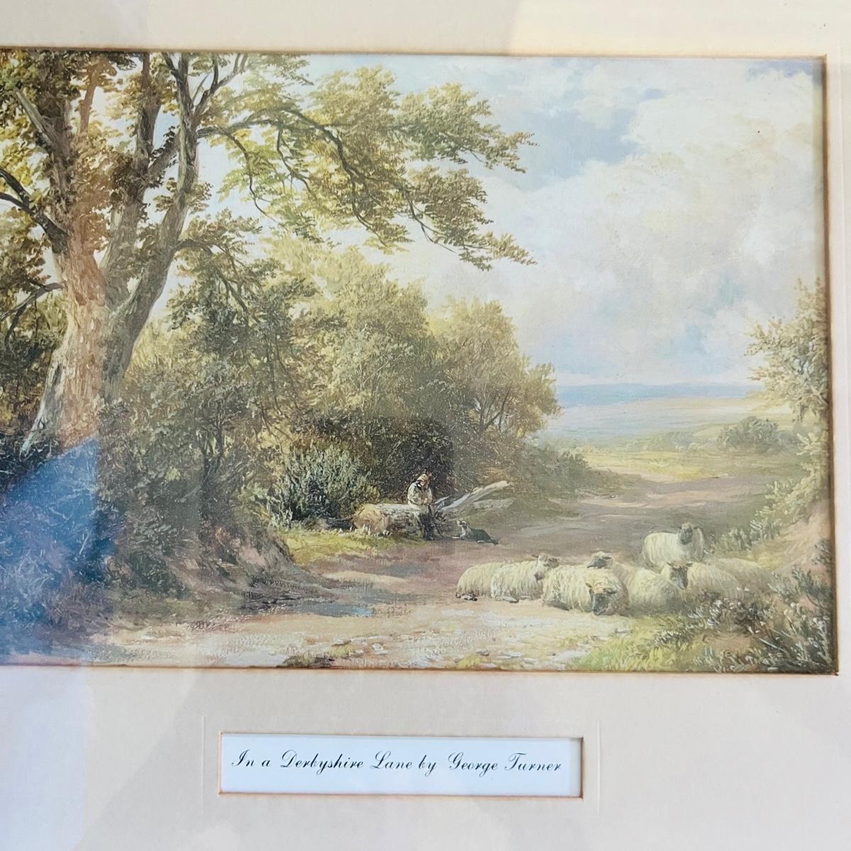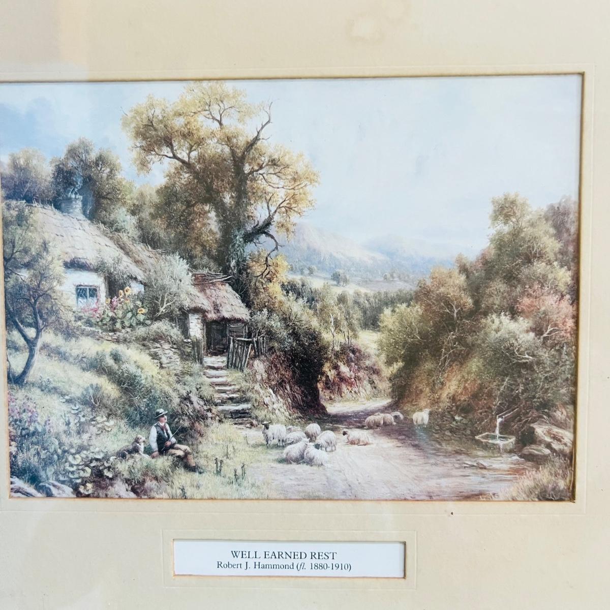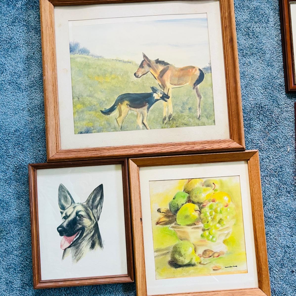 Lot includes a variety of eight wood framed paintings/prints in different finishes and sizes. Large rustic frame measures 16”x20”.