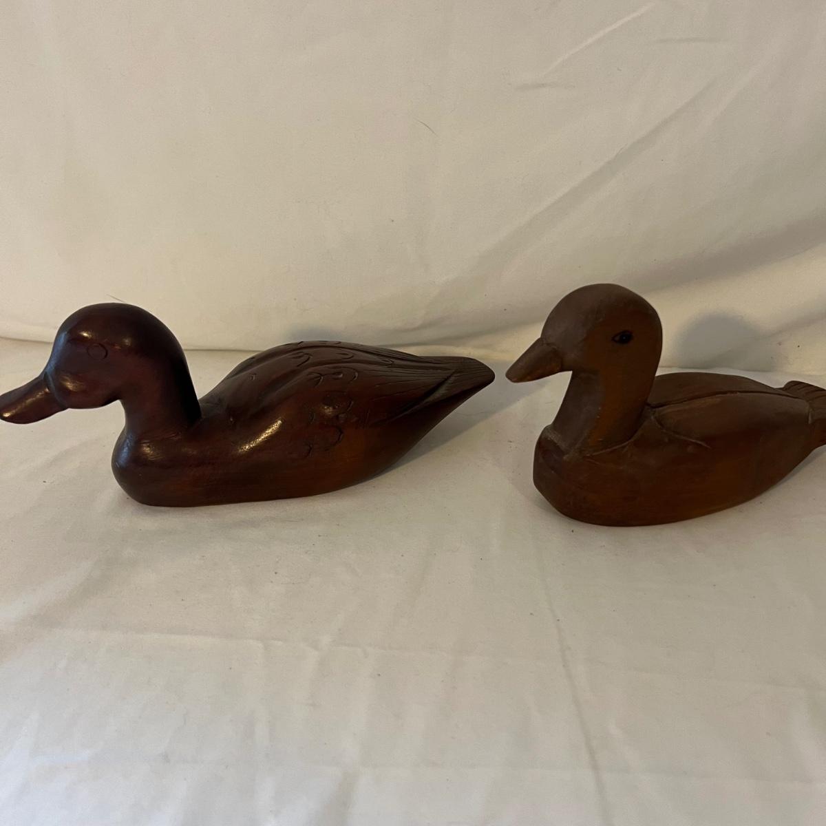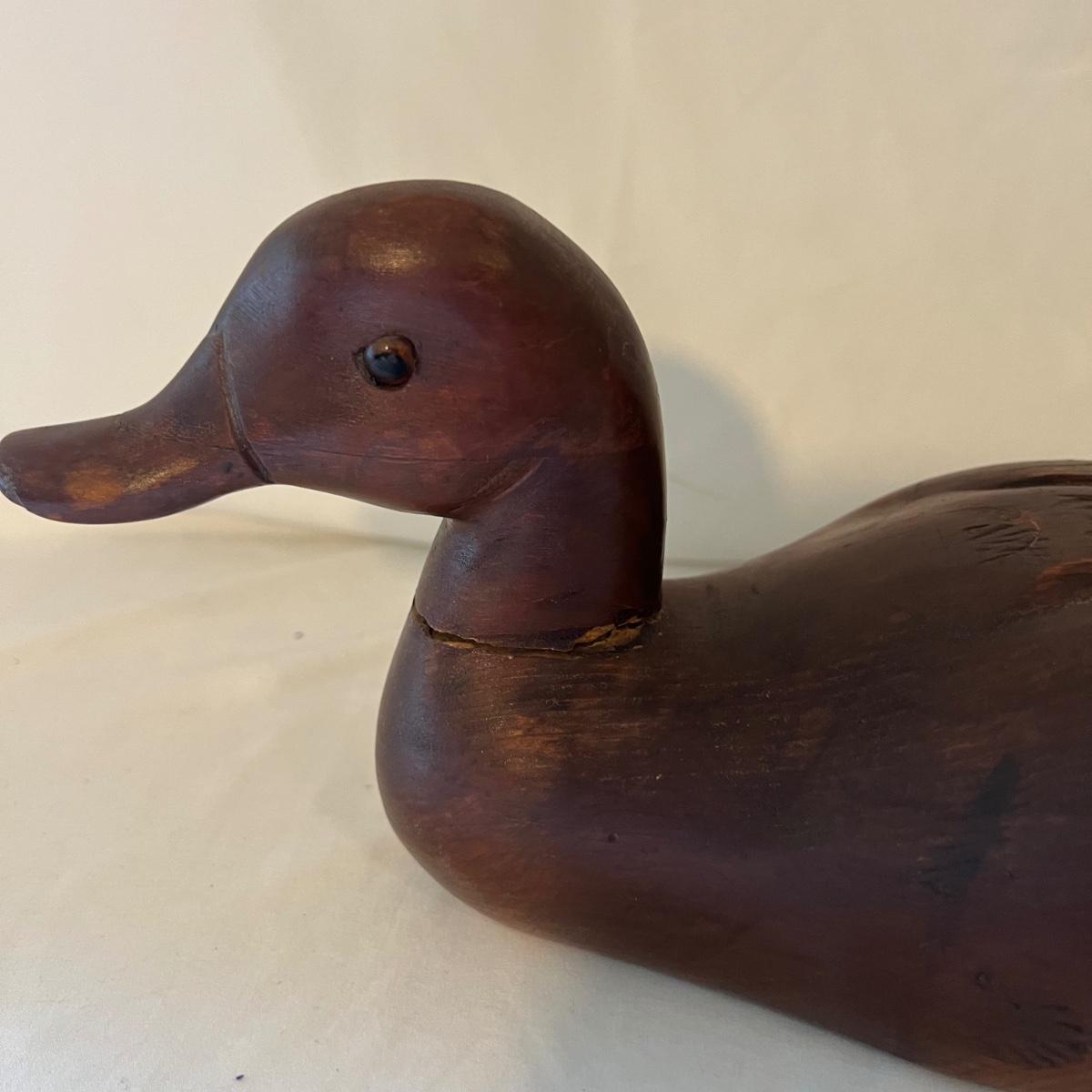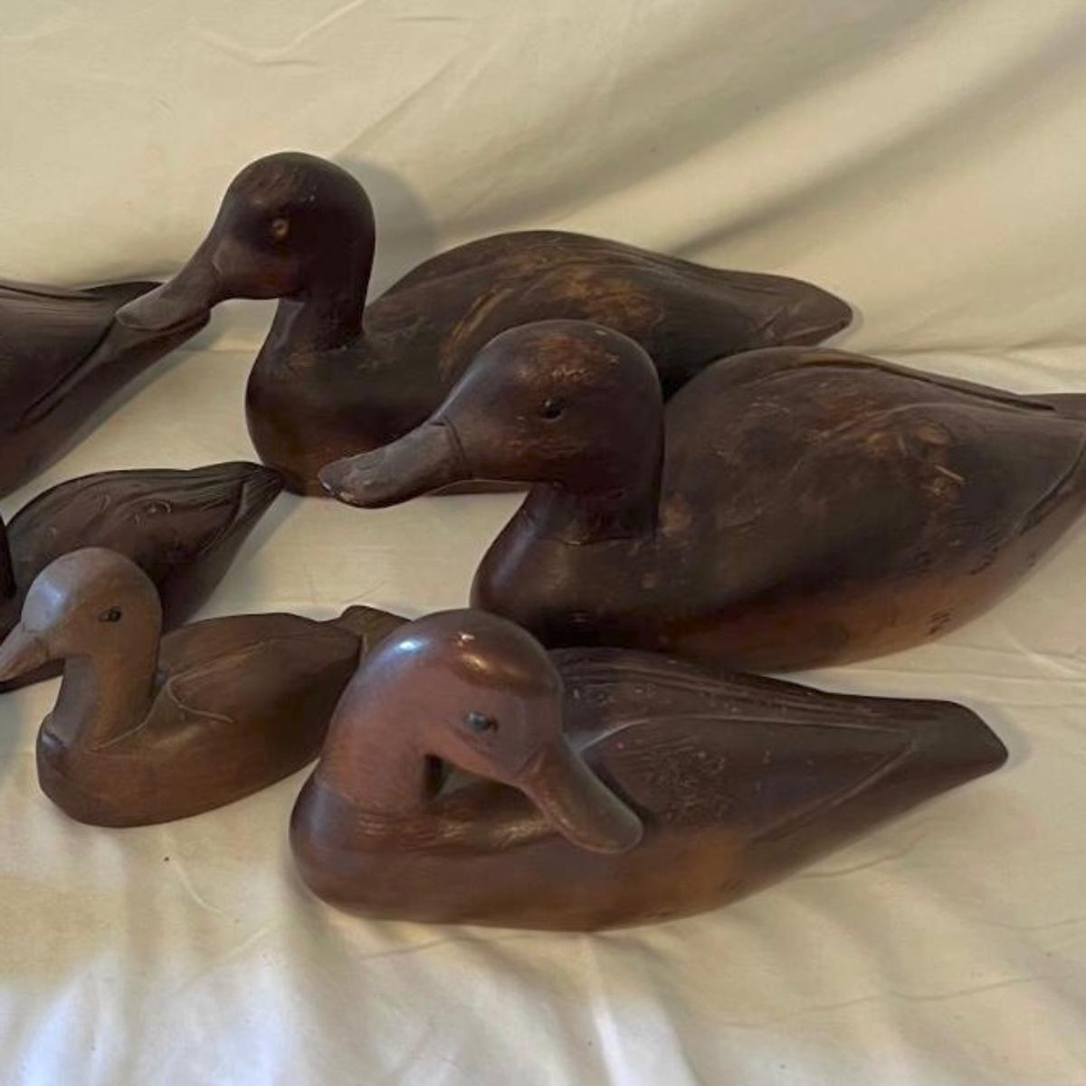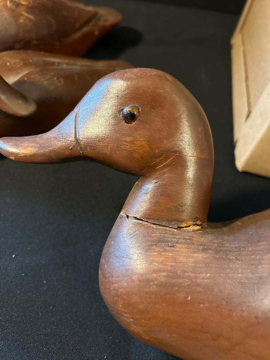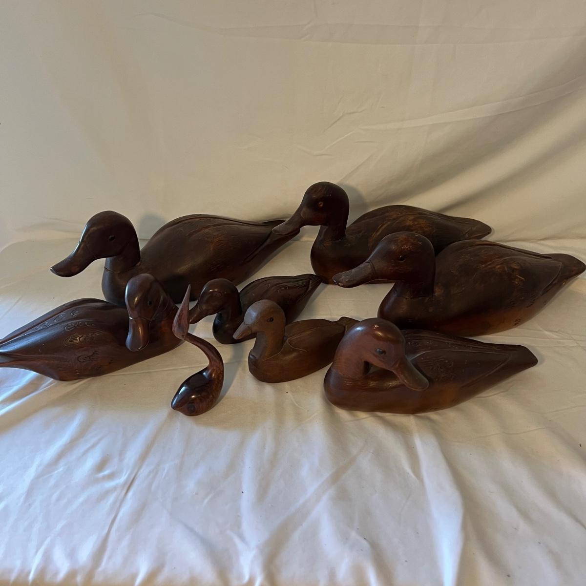 Seven carved wooden ducks plus a crane. Three larger decoys measure appropriately 15” x 4.5” x 6”H. The two medium ducks measure approximately 9.25” x 4” x 4.5”H. The two smaller ducks measure approximately 8” x 2.5” x 3”H and a small carved crane looking duck measures approximately 2”D x 6”H. One large duck has a split neck (see photo) no makers markings found on any of them. All have about the same staining and appear to be made by the same maker, possibly (except the crane).