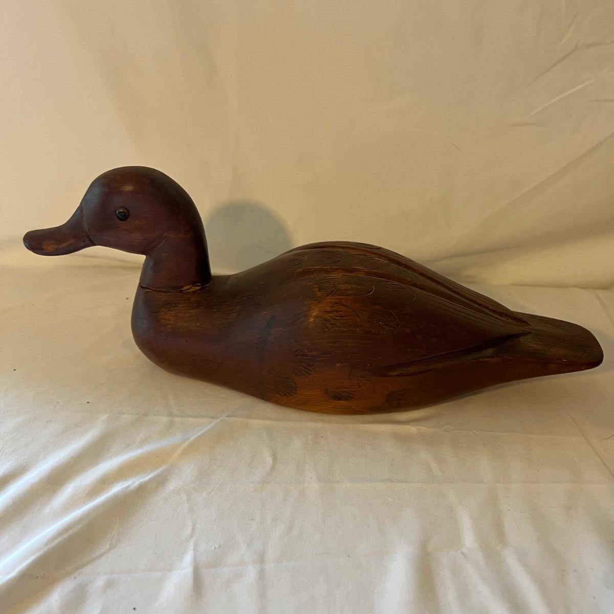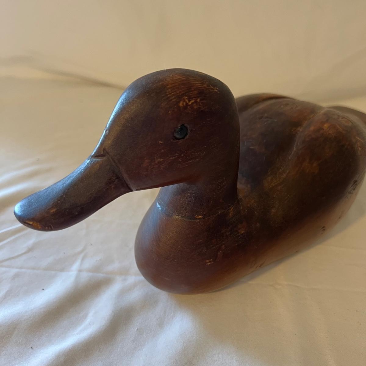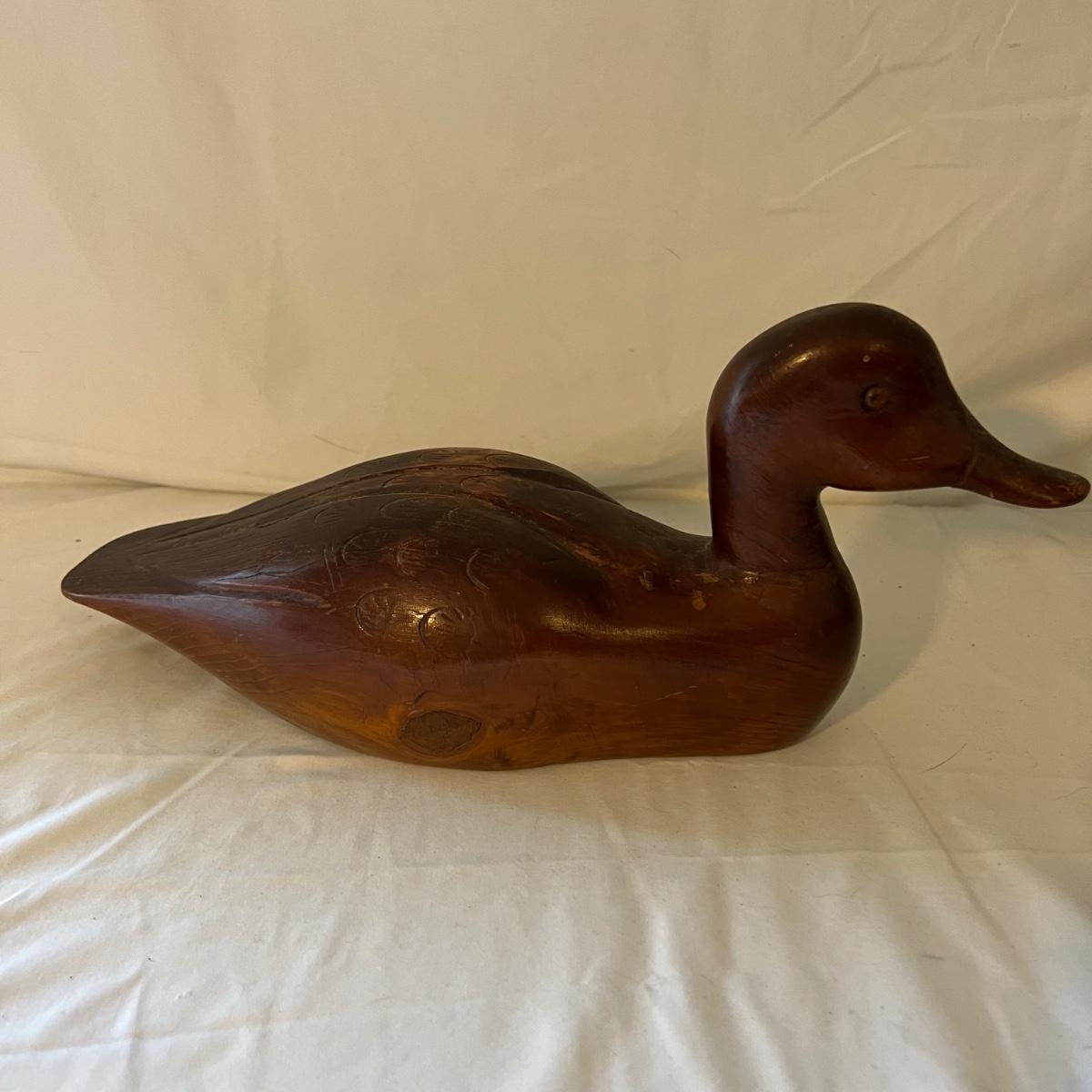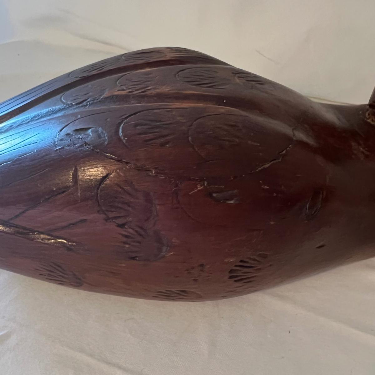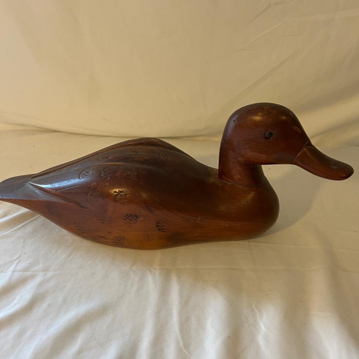 Seven carved wooden ducks plus a crane. Three larger decoys measure appropriately 15” x 4.5” x 6”H. The two medium ducks measure approximately 9.25” x 4” x 4.5”H. The two smaller ducks measure approximately 8” x 2.5” x 3”H and a small carved crane looking duck measures approximately 2”D x 6”H. One large duck has a split neck (see photo) no makers markings found on any of them. All have about the same staining and appear to be made by the same maker, possibly (except the crane).