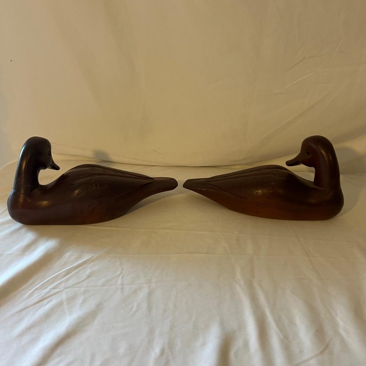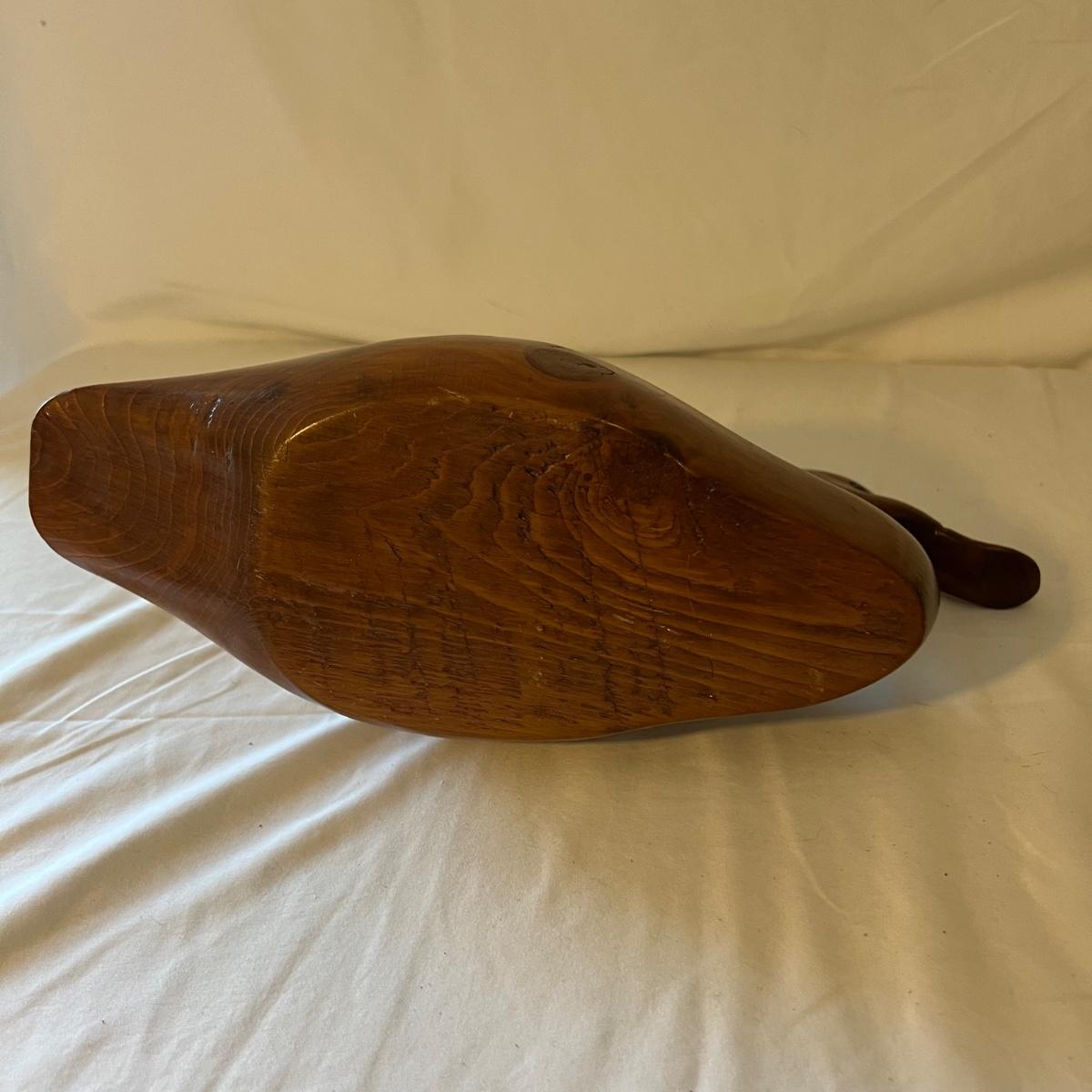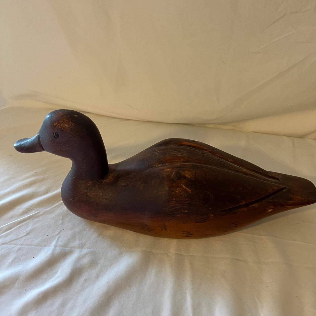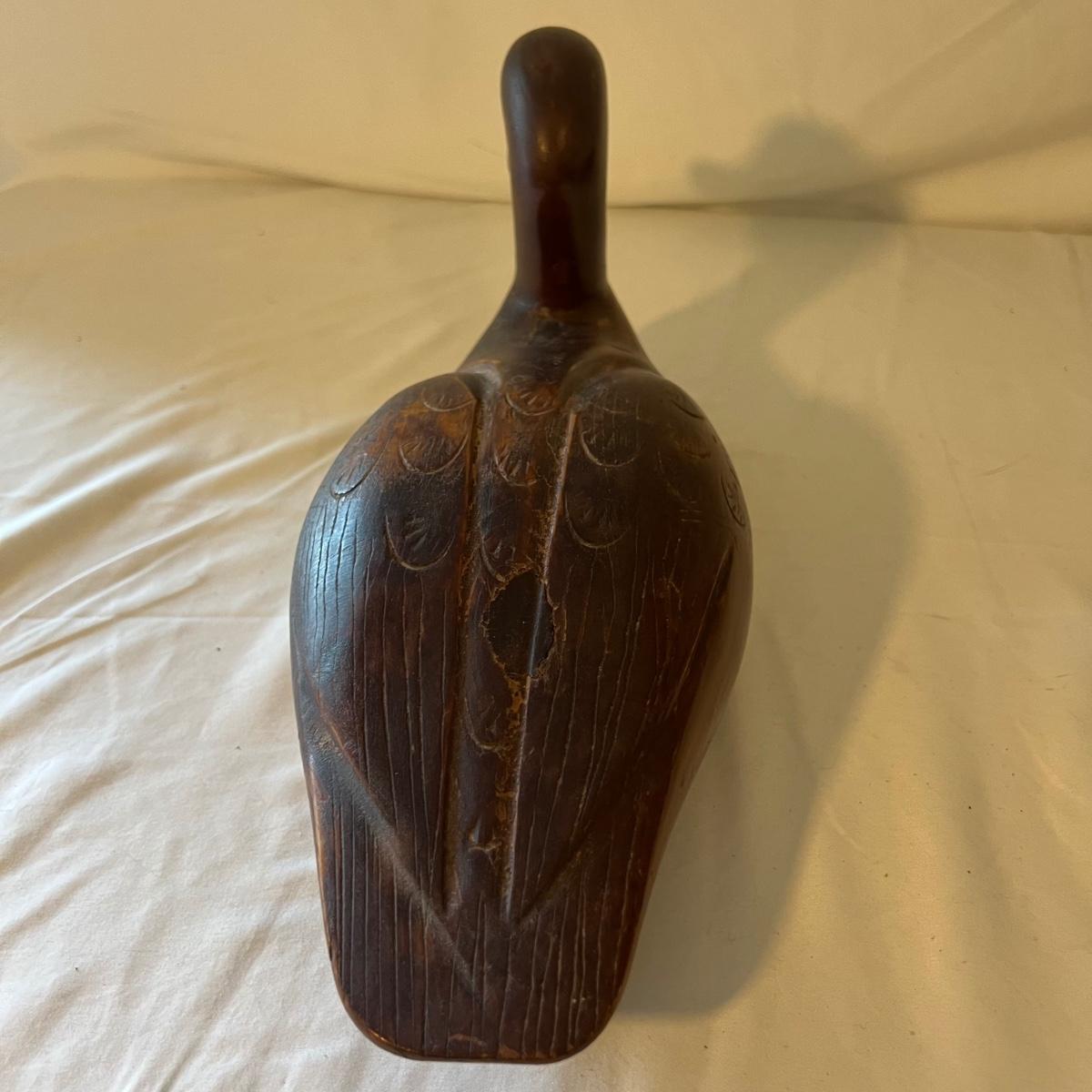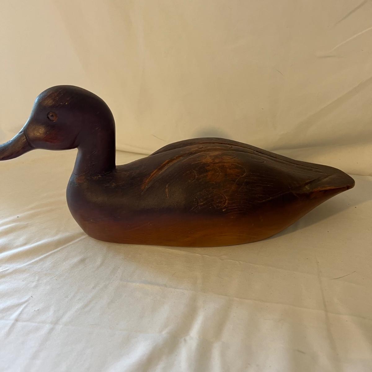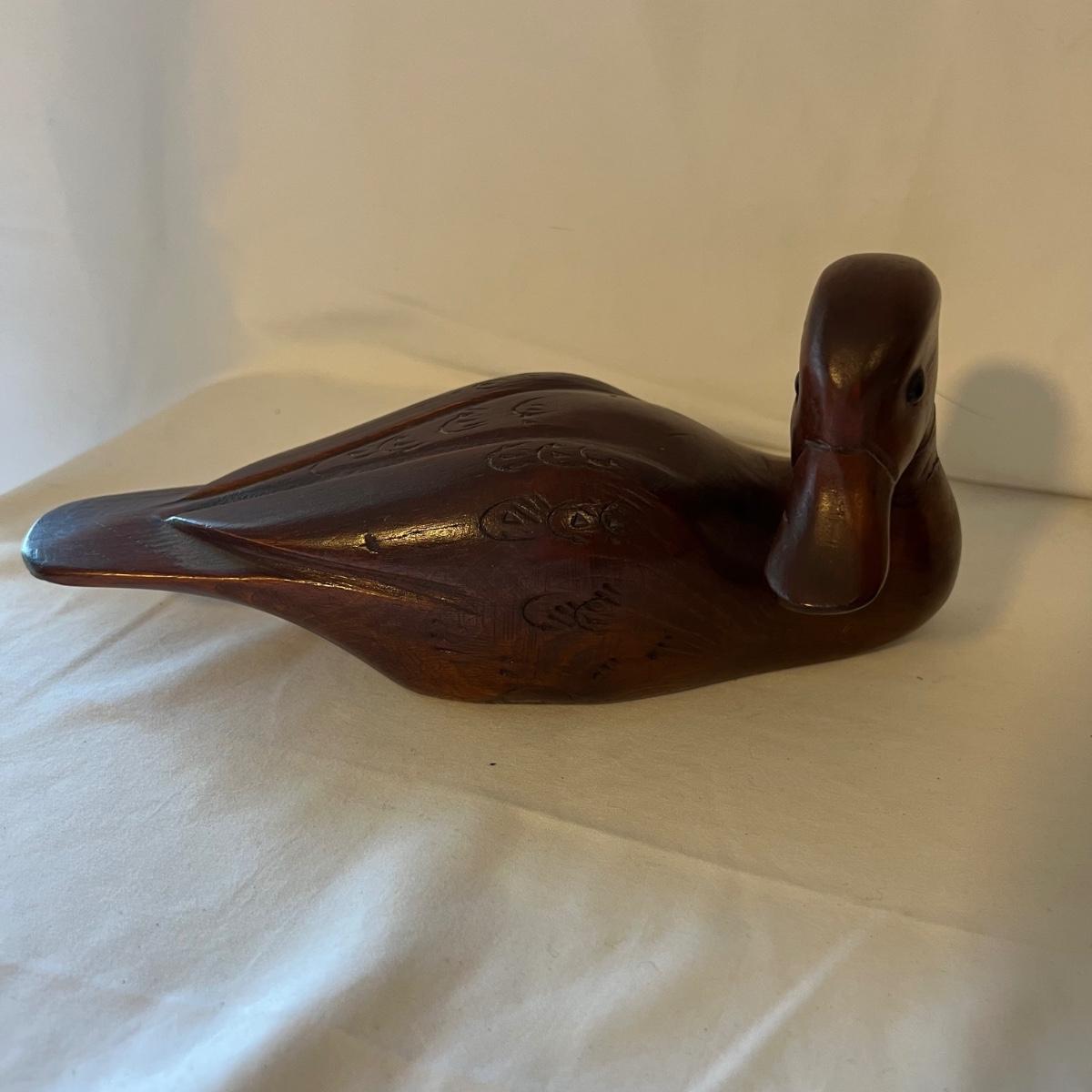 Seven carved wooden ducks plus a crane. Three larger decoys measure appropriately 15” x 4.5” x 6”H. The two medium ducks measure approximately 9.25” x 4” x 4.5”H. The two smaller ducks measure approximately 8” x 2.5” x 3”H and a small carved crane looking duck measures approximately 2”D x 6”H. One large duck has a split neck (see photo) no makers markings found on any of them. All have about the same staining and appear to be made by the same maker, possibly (except the crane).