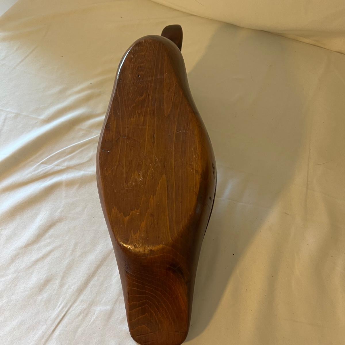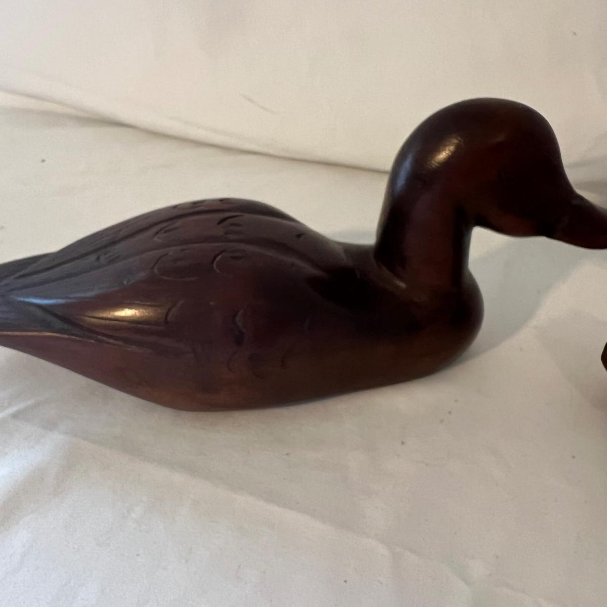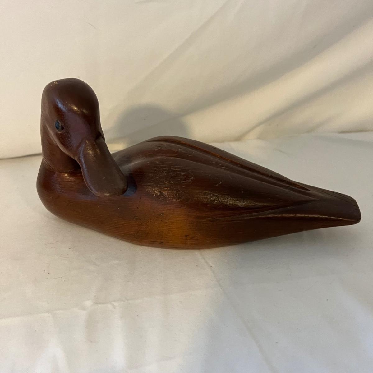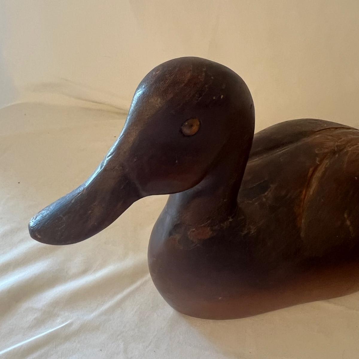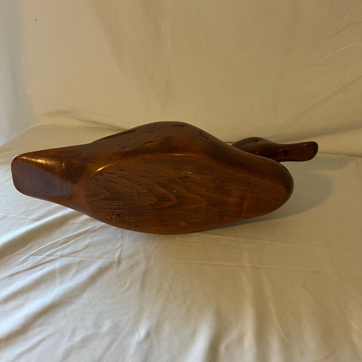 Seven carved wooden ducks plus a crane. Three larger decoys measure appropriately 15” x 4.5” x 6”H. The two medium ducks measure approximately 9.25” x 4” x 4.5”H. The two smaller ducks measure approximately 8” x 2.5” x 3”H and a small carved crane looking duck measures approximately 2”D x 6”H. One large duck has a split neck (see photo) no makers markings found on any of them. All have about the same staining and appear to be made by the same maker, possibly (except the crane).