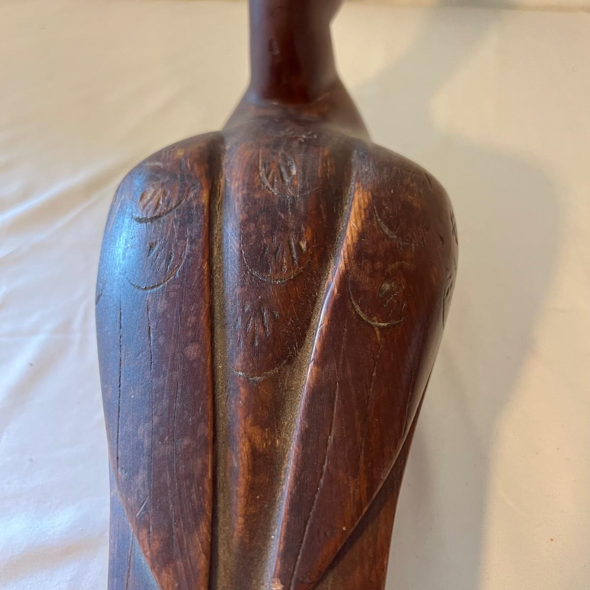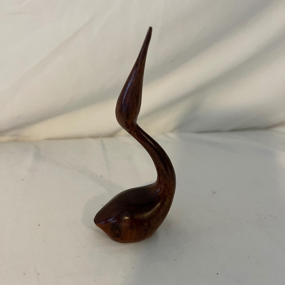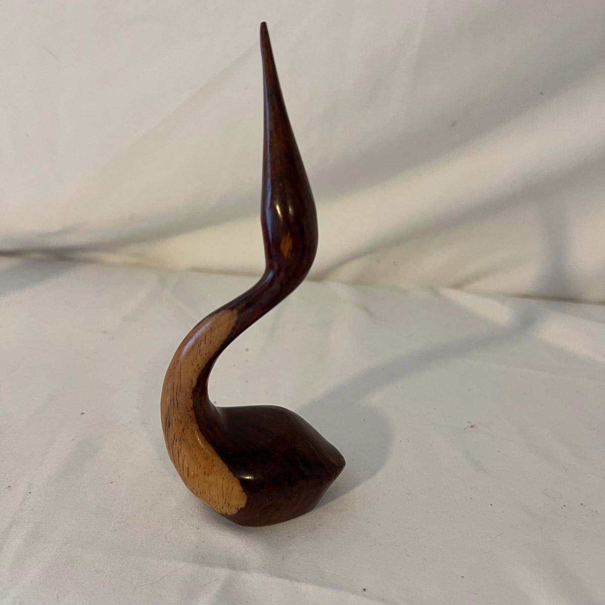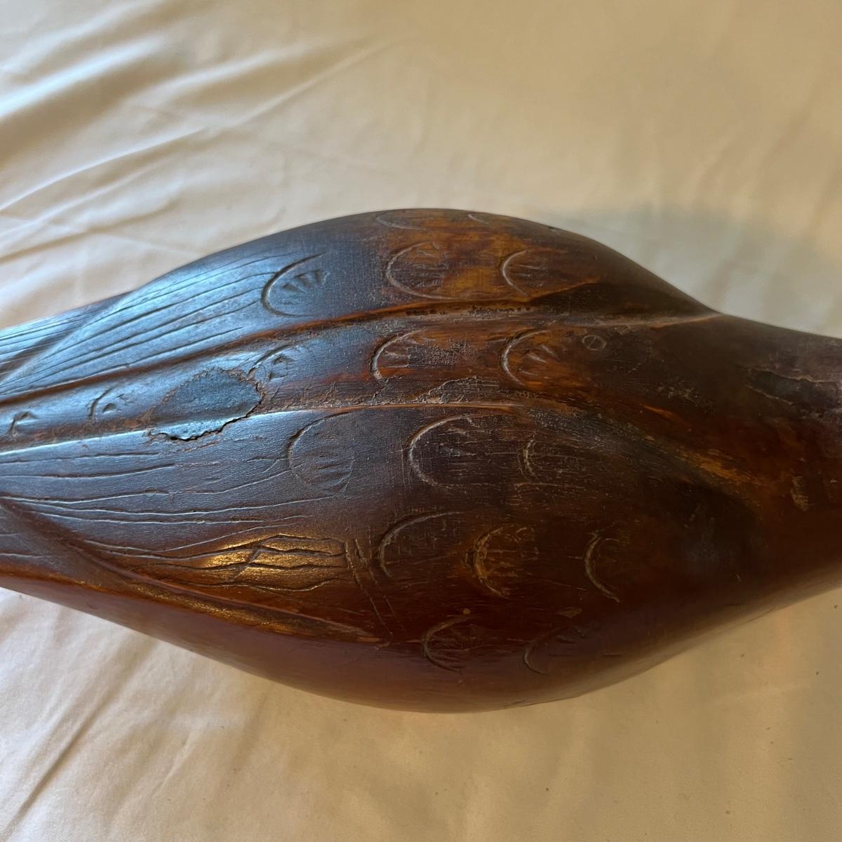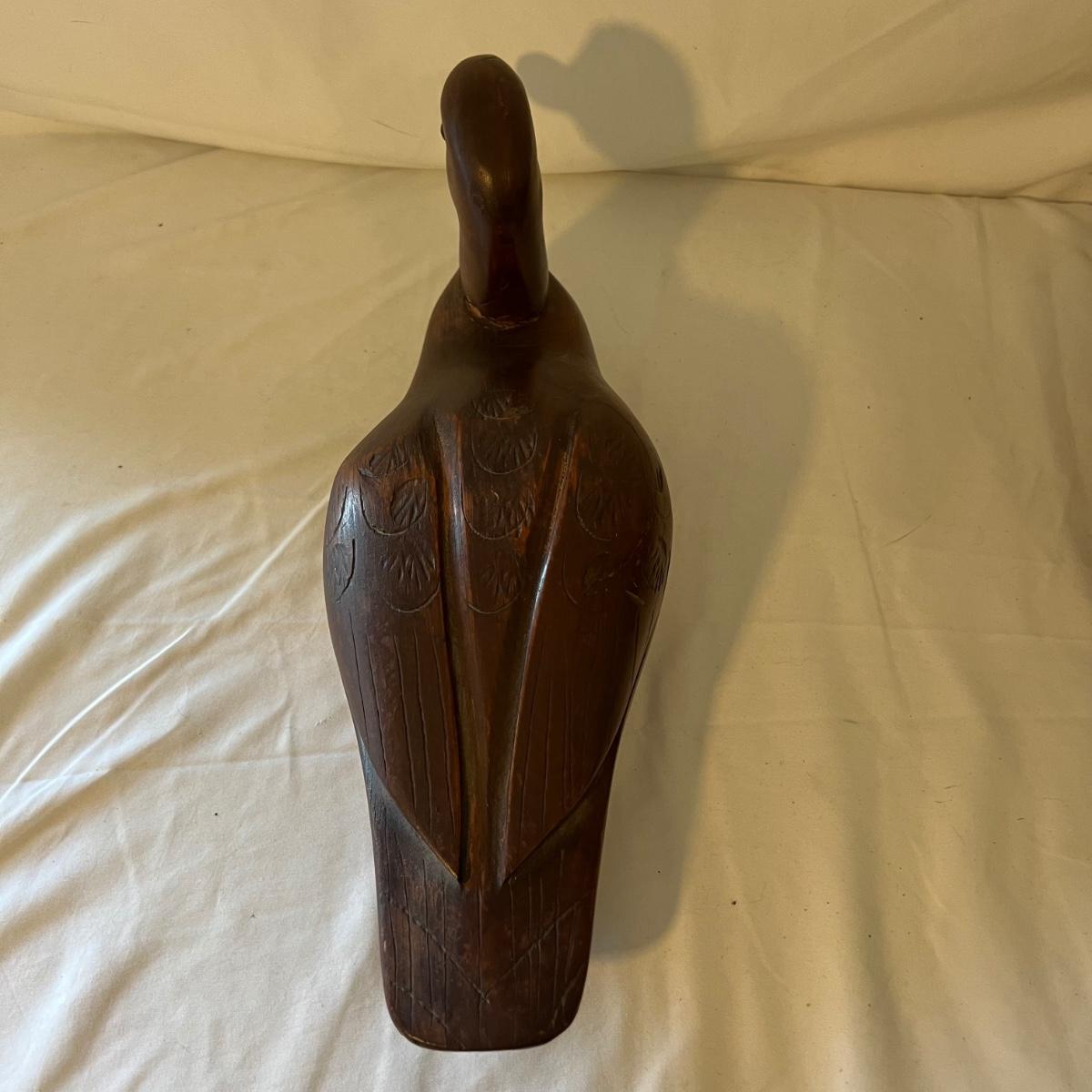 Seven carved wooden ducks plus a crane. Three larger decoys measure appropriately 15” x 4.5” x 6”H. The two medium ducks measure approximately 9.25” x 4” x 4.5”H. The two smaller ducks measure approximately 8” x 2.5” x 3”H and a small carved crane looking duck measures approximately 2”D x 6”H. One large duck has a split neck (see photo) no makers markings found on any of them. All have about the same staining and appear to be made by the same maker, possibly (except the crane).