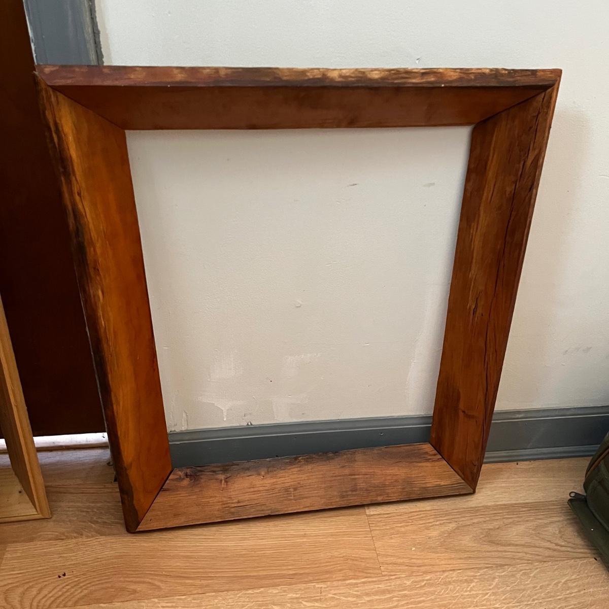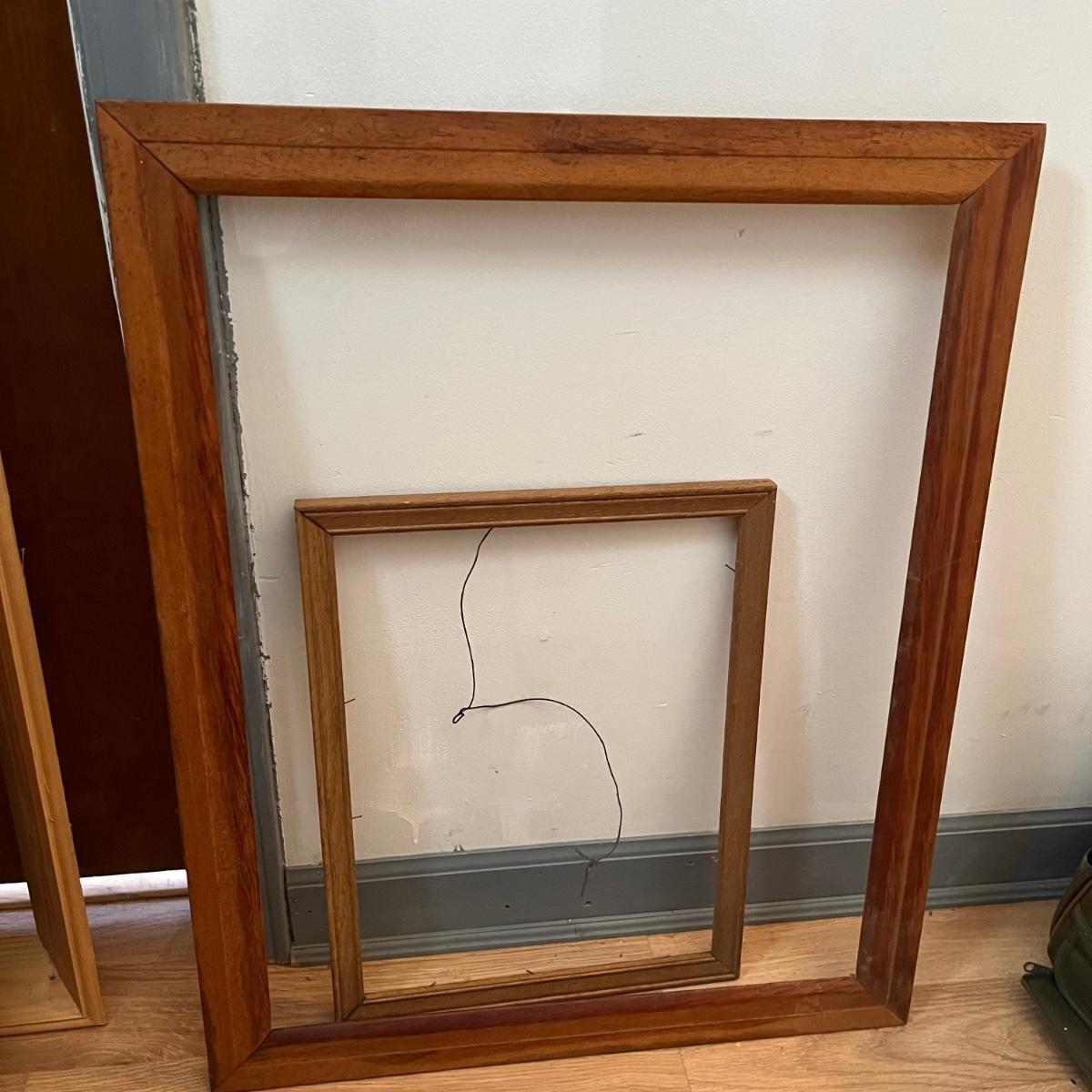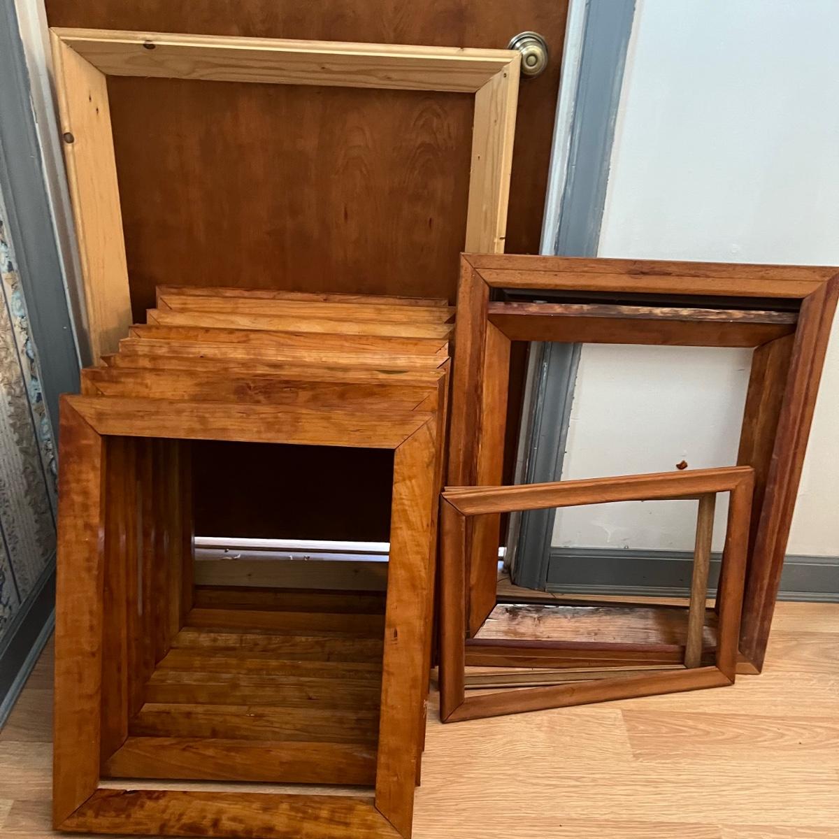 Lot includes eight matching wooden frames that measure 19” x 23” and six more wooden frames in a variety of sizes. Largest frame measures 25.5” x 37.5”.
