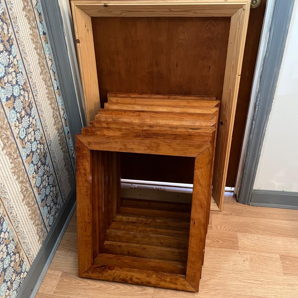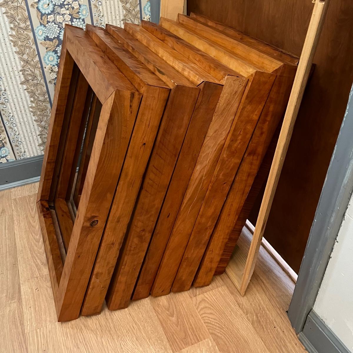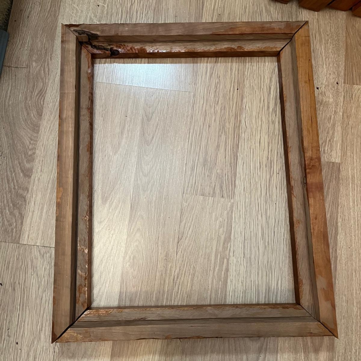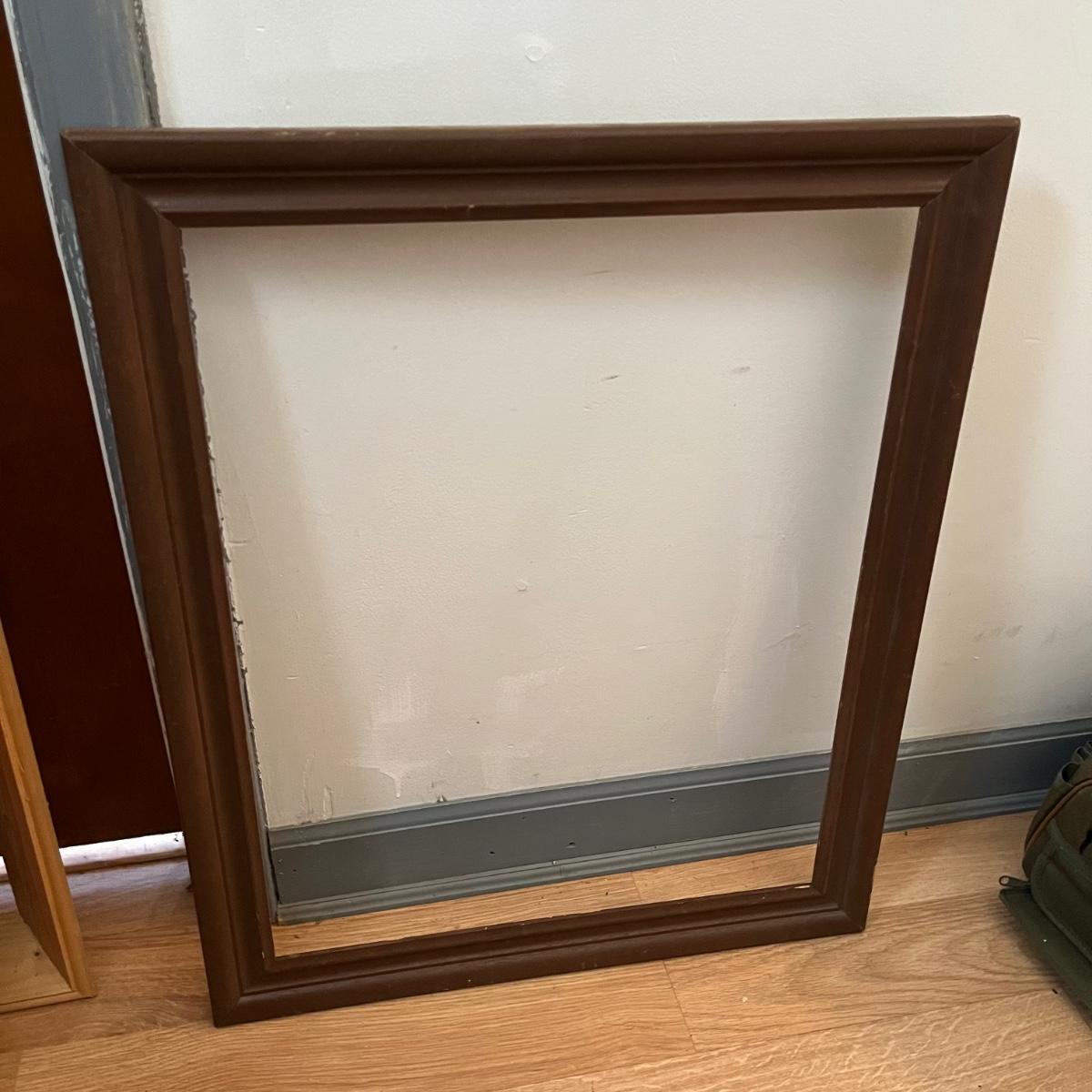 Lot includes eight matching wooden frames that measure 19” x 23” and six more wooden frames in a variety of sizes. Largest frame measures 25.5” x 37.5”.