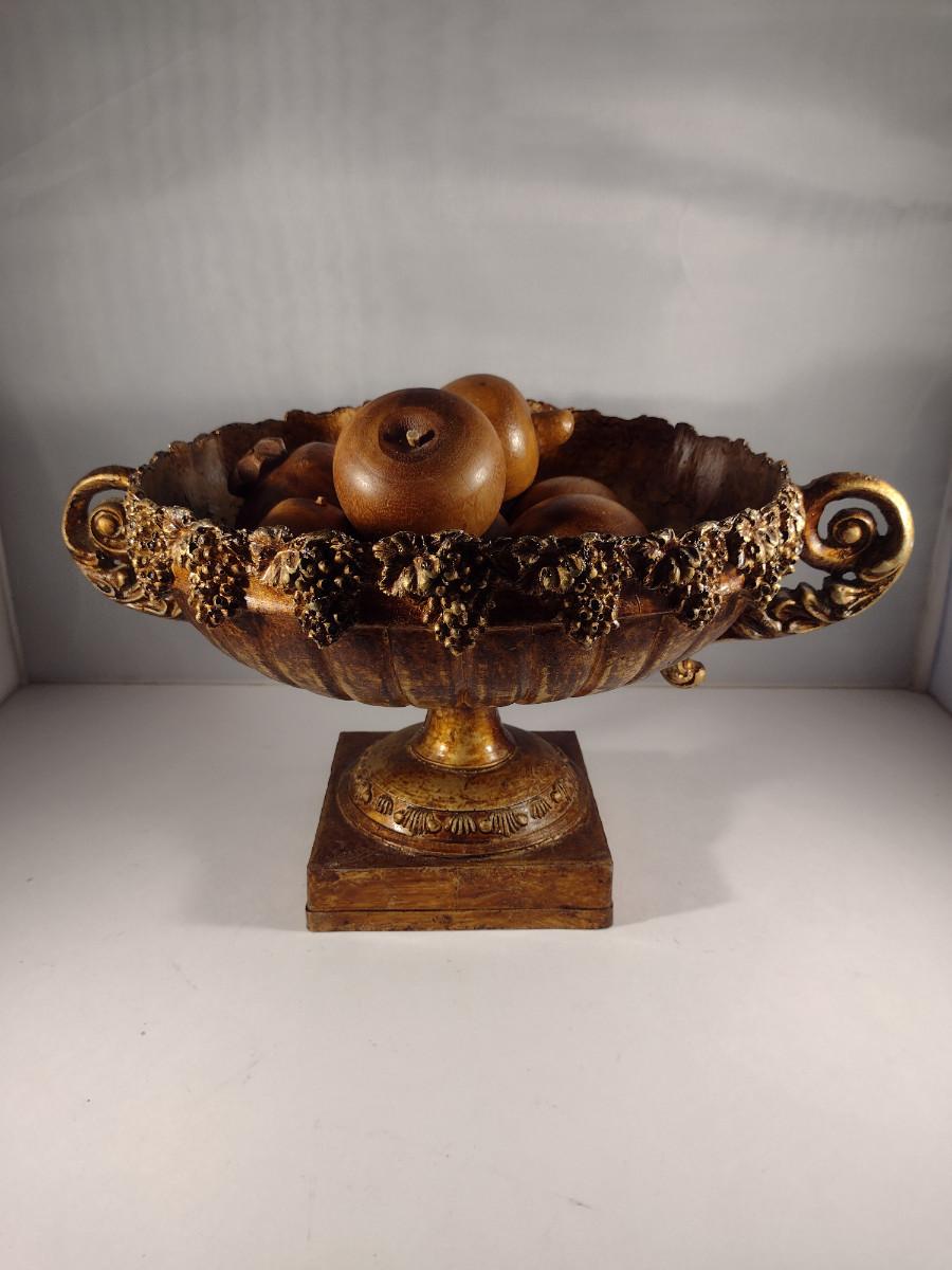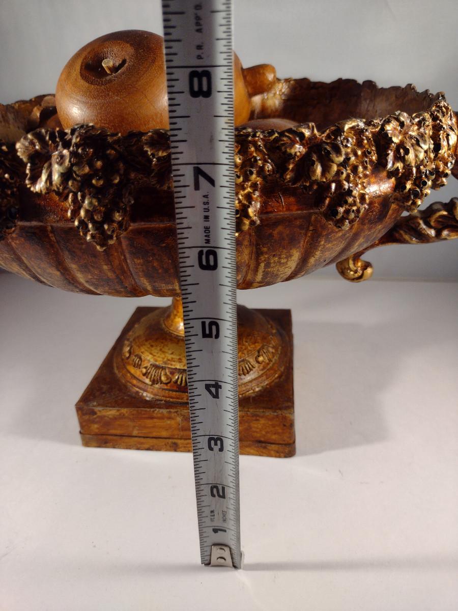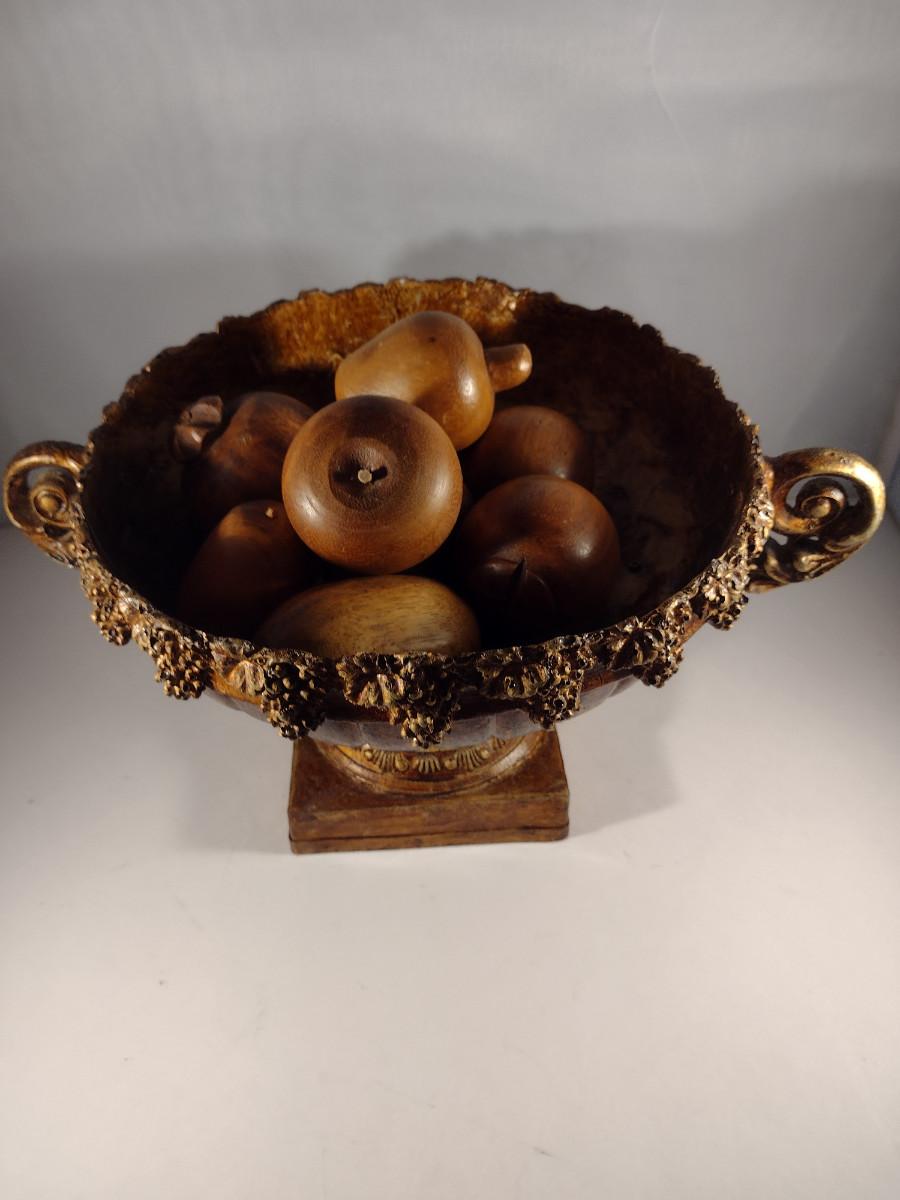 Collection of Wooden Fruit with Decorative Resin Pedestal Bowl. Please see all pictures- interior of bowl has a couple of exposed screws.