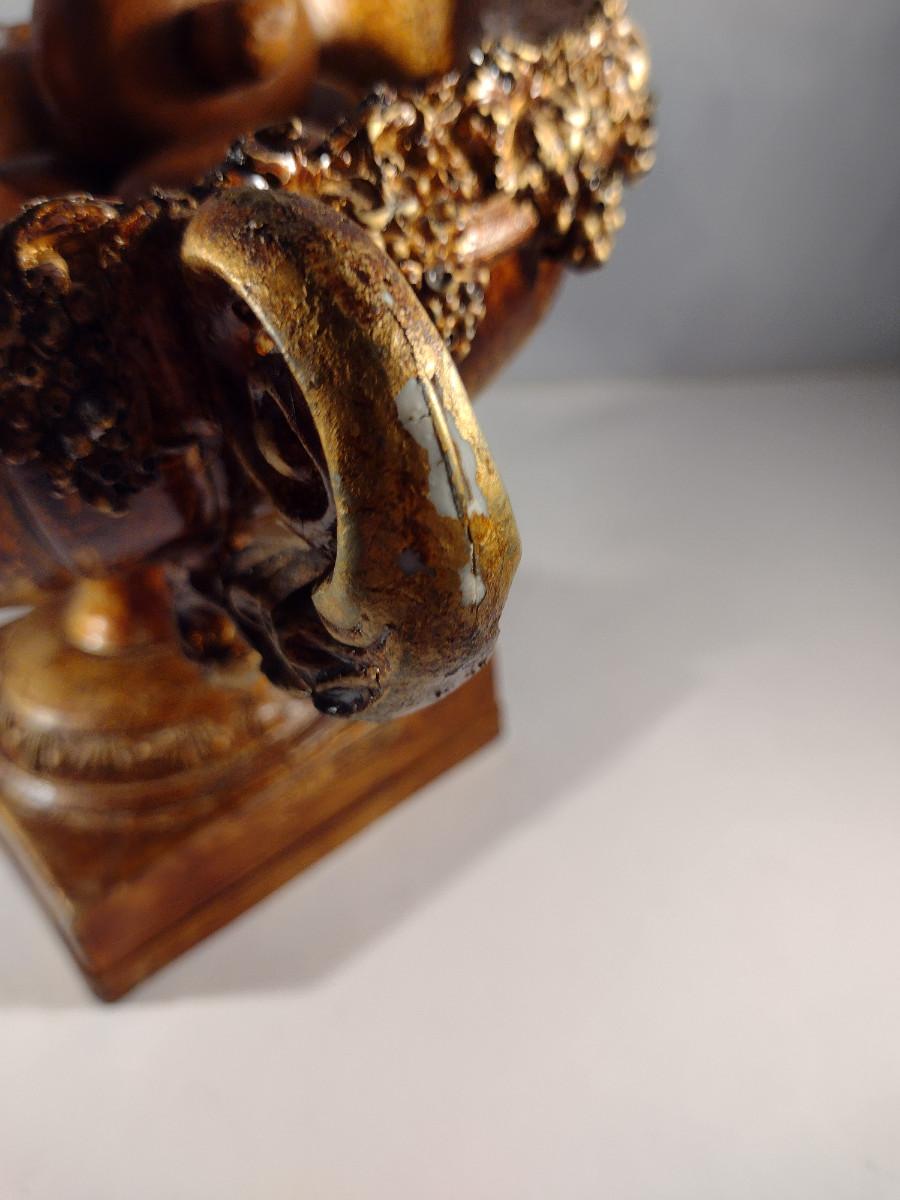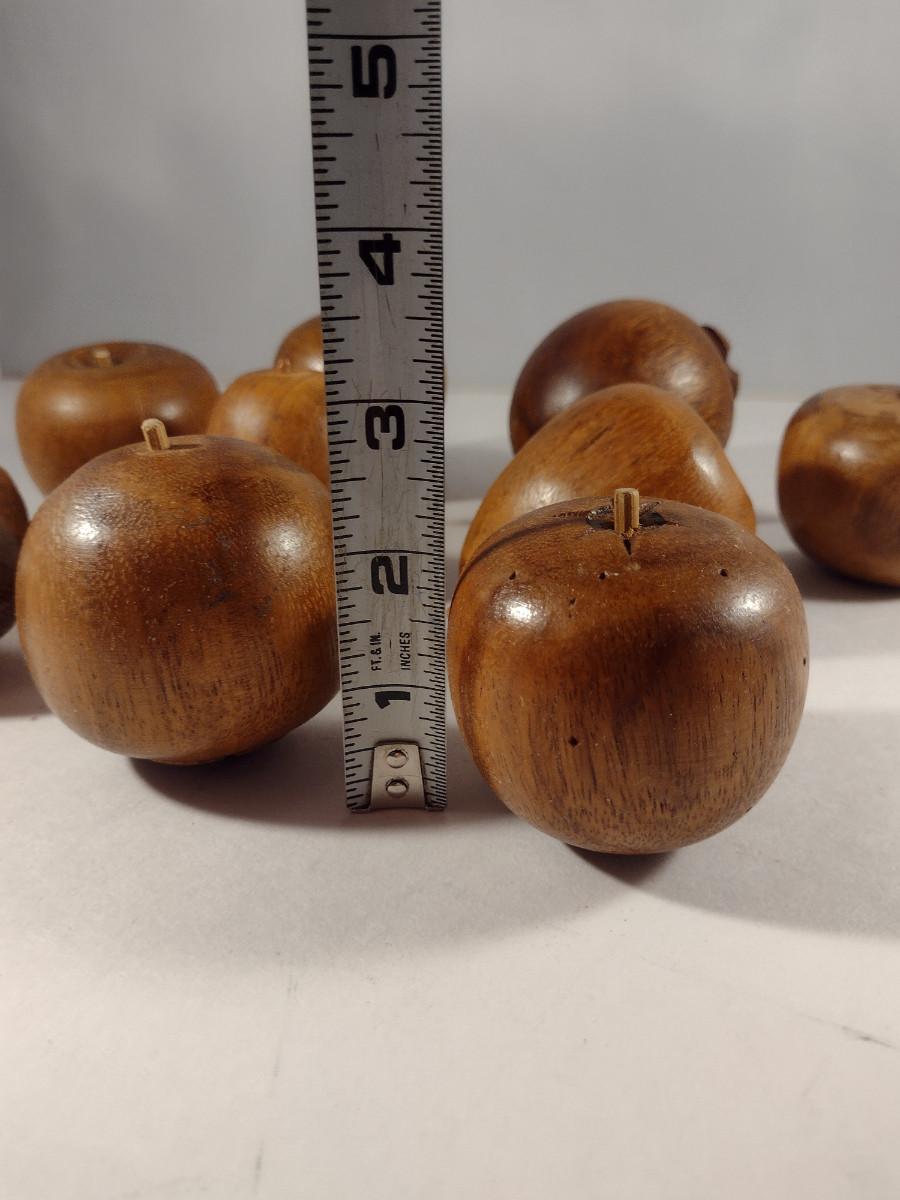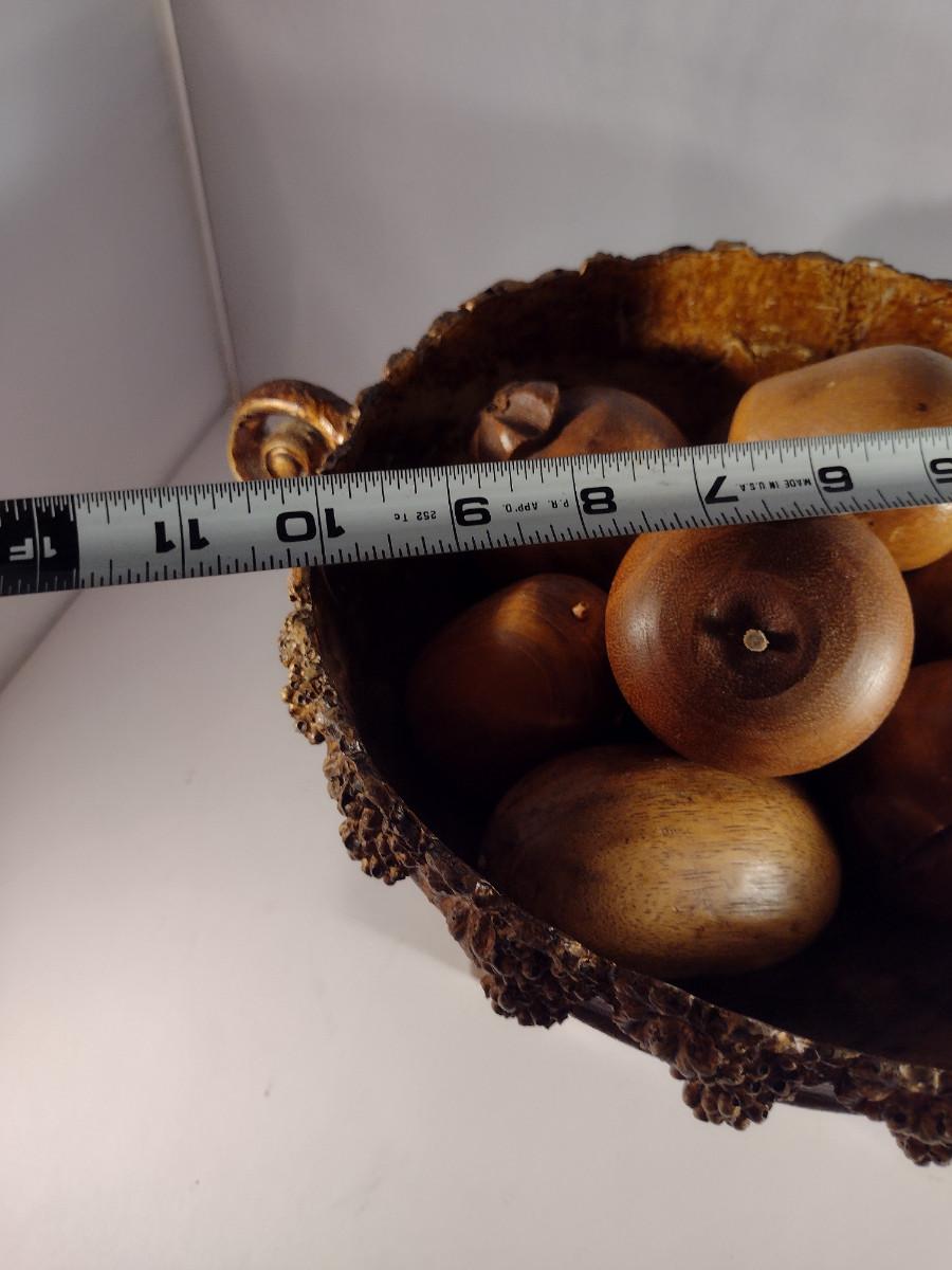 Collection of Wooden Fruit with Decorative Resin Pedestal Bowl. Please see all pictures- interior of bowl has a couple of exposed screws.