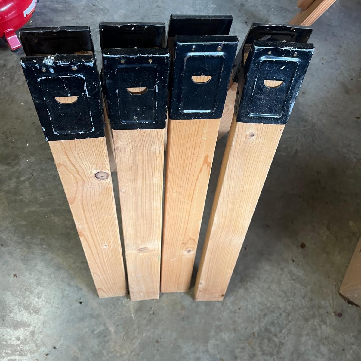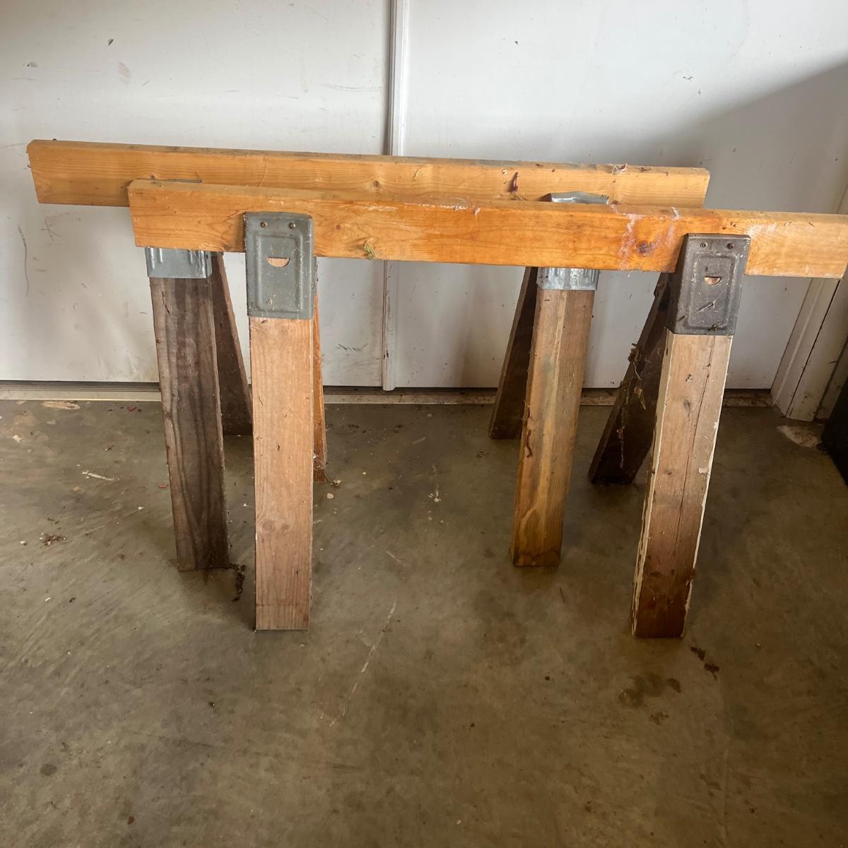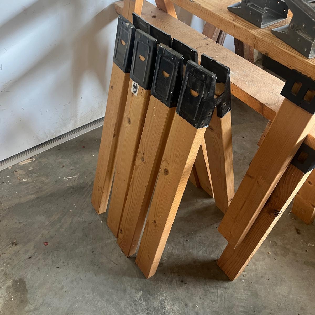 Lot includes four complete wooden sawhorses, four legs with brackets for sawhorses and two metal sawhorse brackets. Largest sawhorse measures 48” x 18” x 24”H. Also included are two plastic sawhorse brackets.