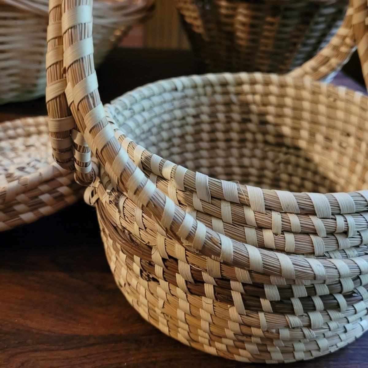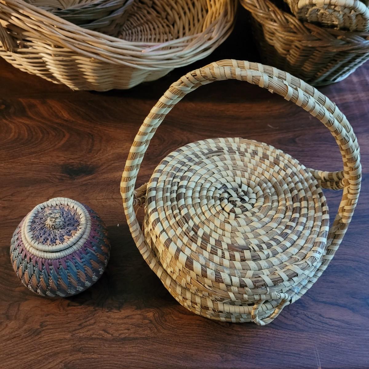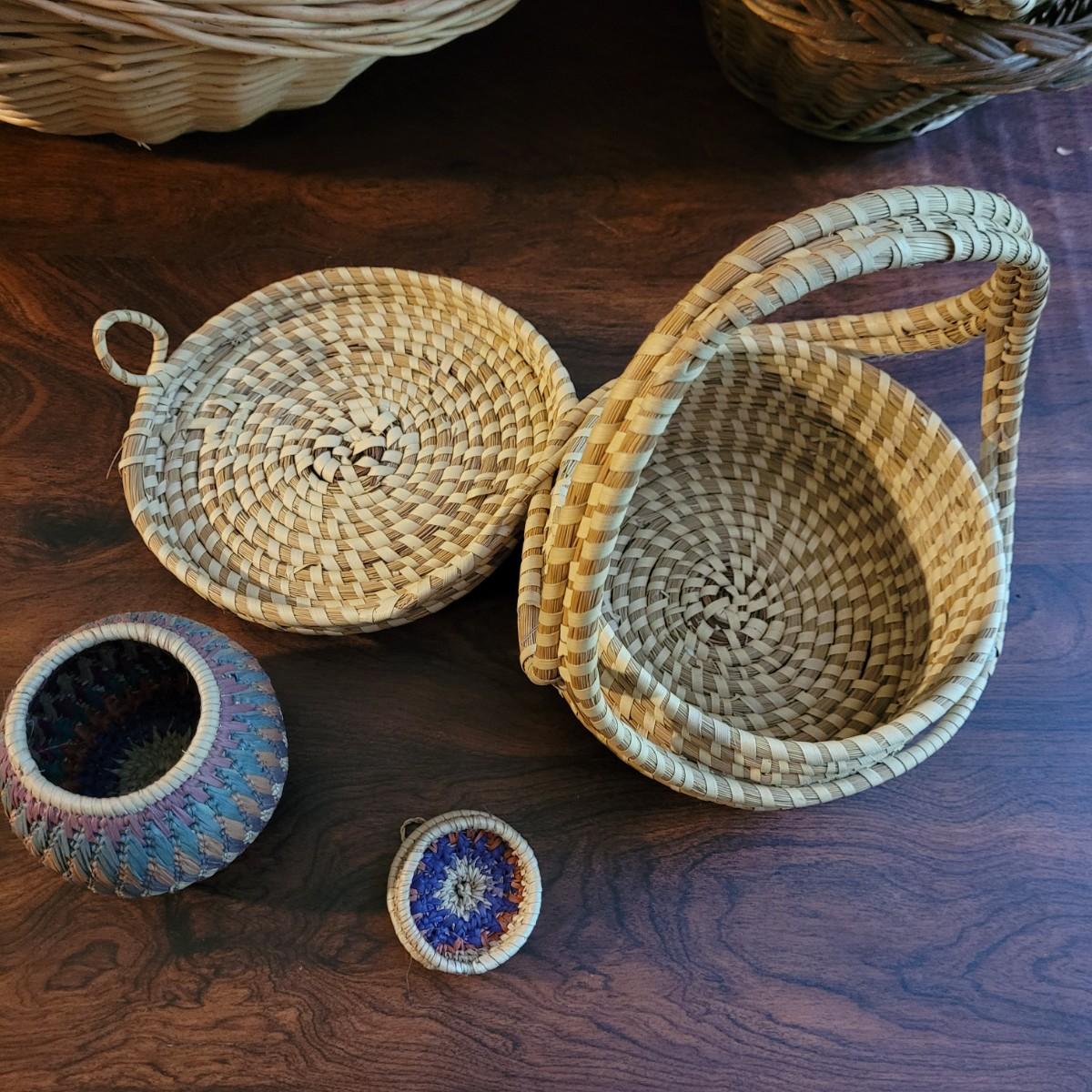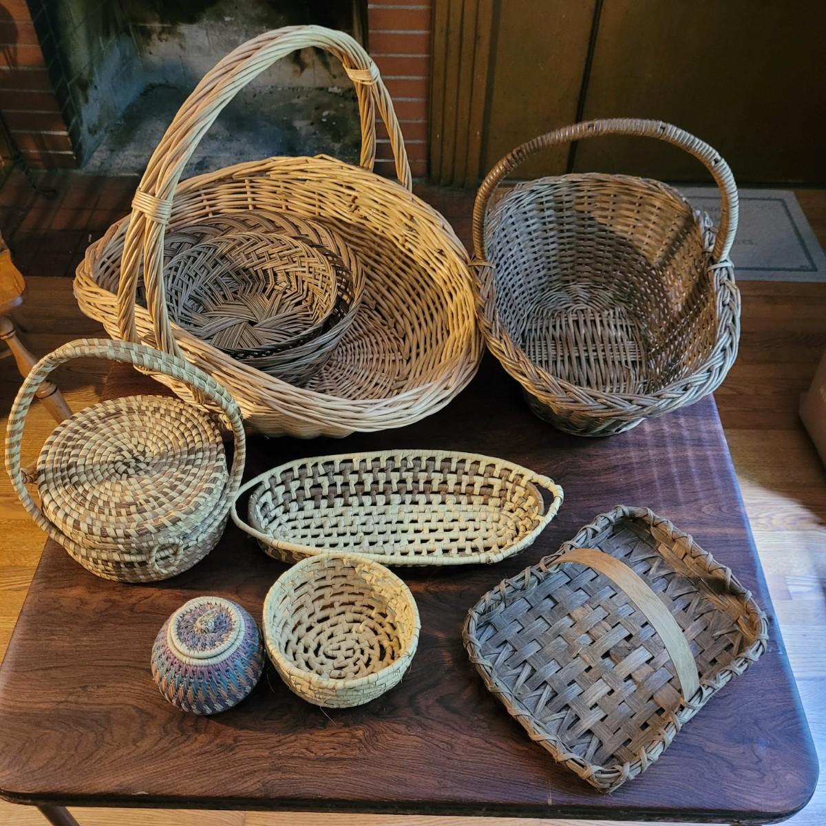 Collection of wide variety of woven baskets. In good condition with very few breaks in material (see photos for damaged areas). Basket with lid and handle appears to be from the well known palm grass baskets of Charleston, SC. Largest basket measures approximately 23.5"L x17"D x18"H. Shipping available.