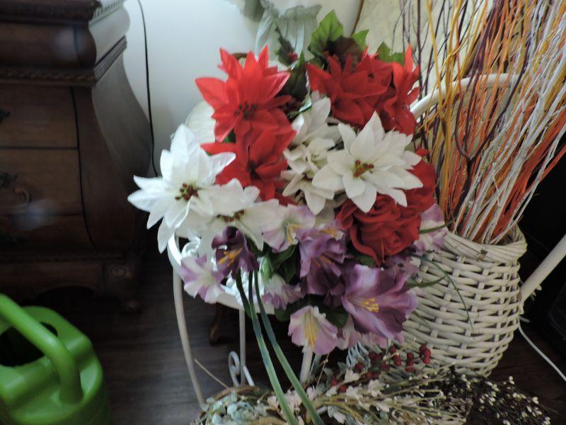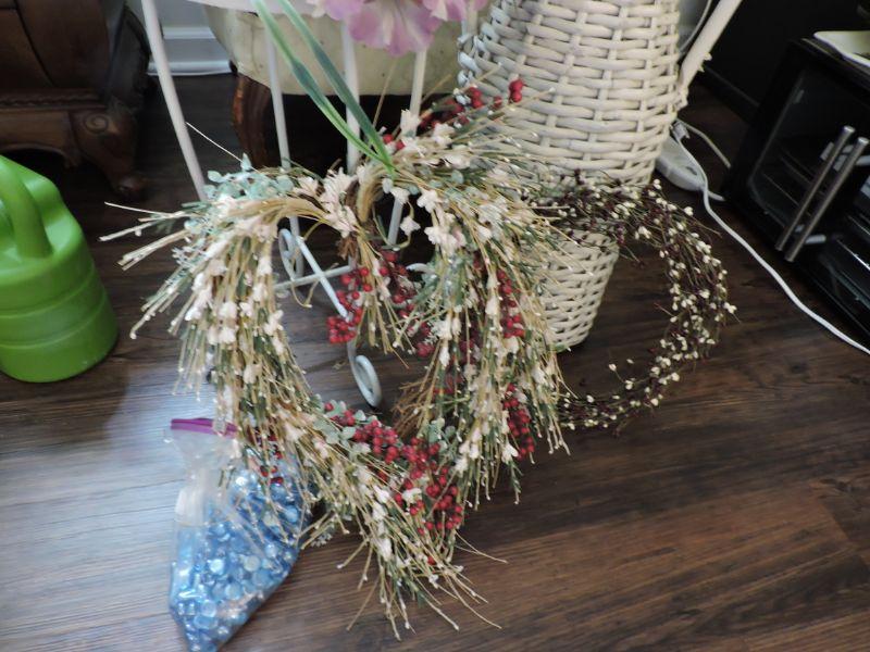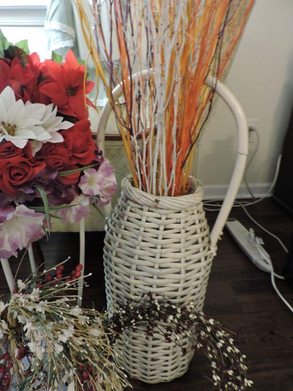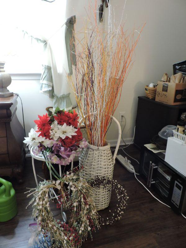 Collection of Wreathes, Silk Flowers, Plant Stand, and Decorative Basket **Please read Terms and Conditions before placing a bid. Pick up is Thursday, August 15, 2019 from 4pm to 7pm or Sunday, August 18 from 11am-2pm in Mullica Hill. All sales are final. All sales are as is, where is. Please review all photos. Any props included in photos are not included in listing. All measurements are approximate.