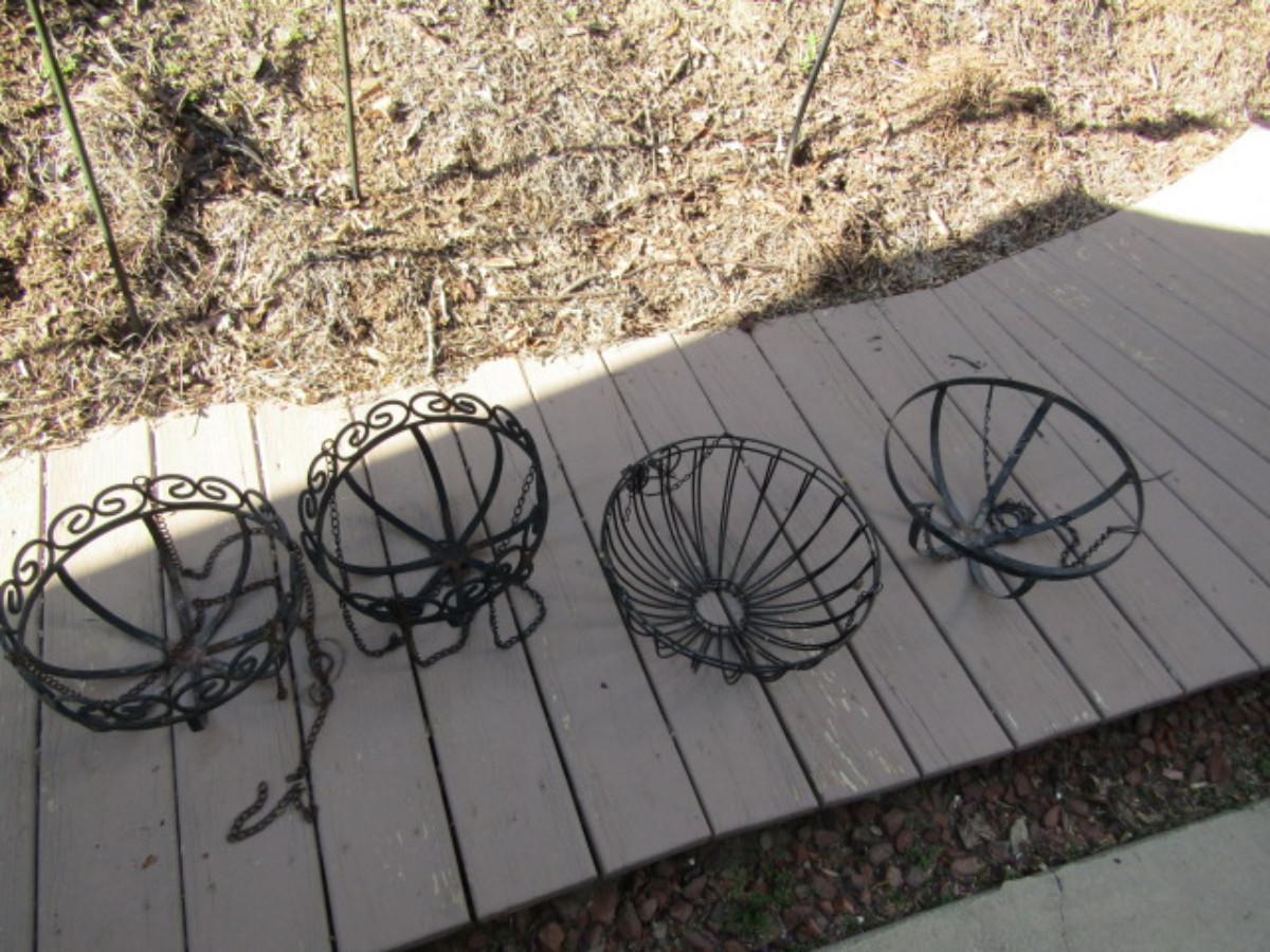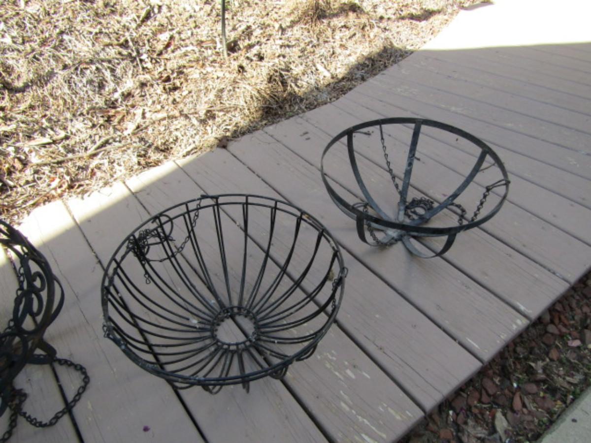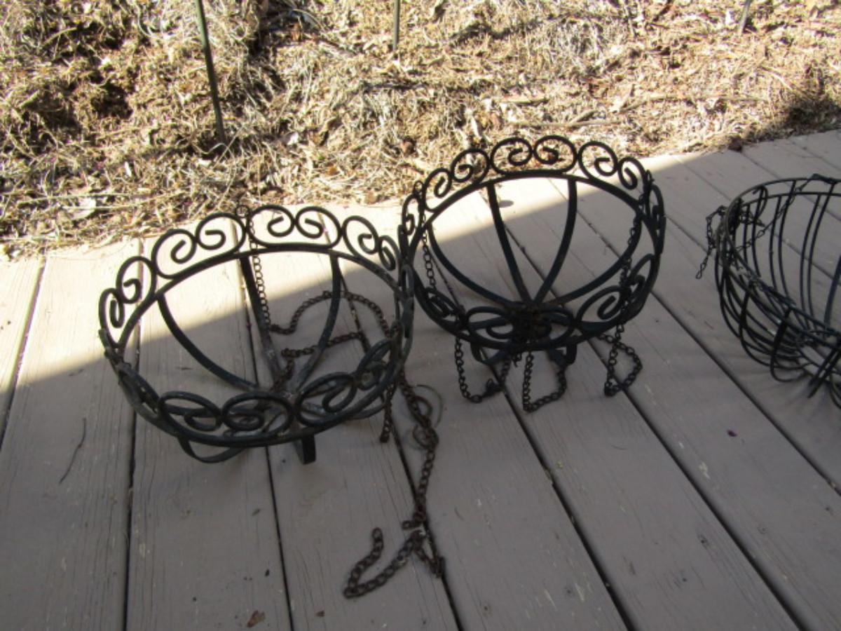 Collection of Wrought Metal Hanging and Table Top Planters. Chains need to be repaired or replaced.