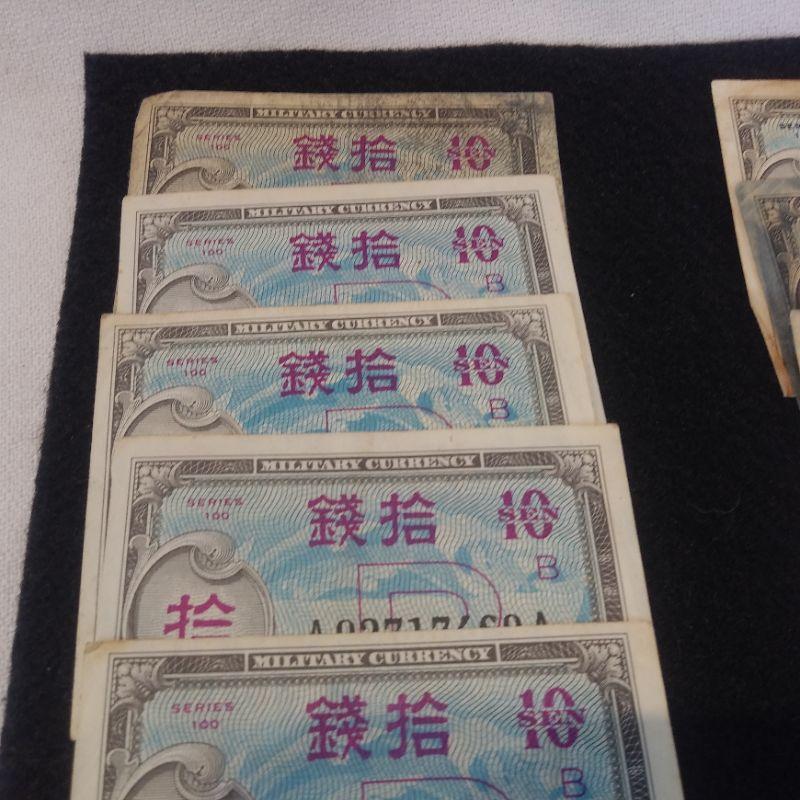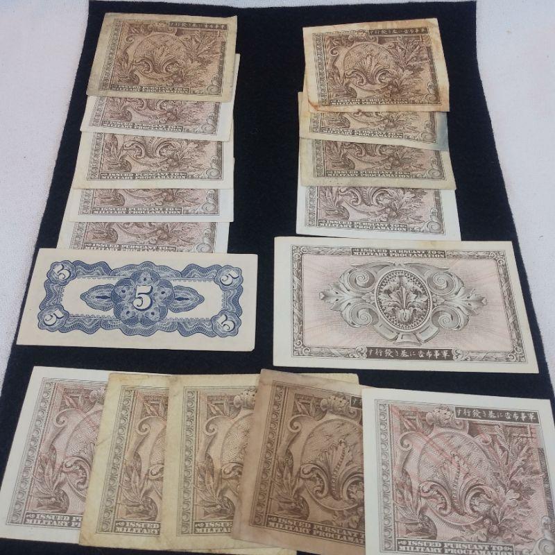 This offering includes: five - 10 Sens, four - 50 Sens, five - 1 Yens, one - 5 Yens and one - 5 Centavos. The paper sizes are 3, 4 & 4 1/2-inches long. Some are very worn and others look fresh. Collection of 16 paper monies in this lot. Reserve/Starting Bid is $10.