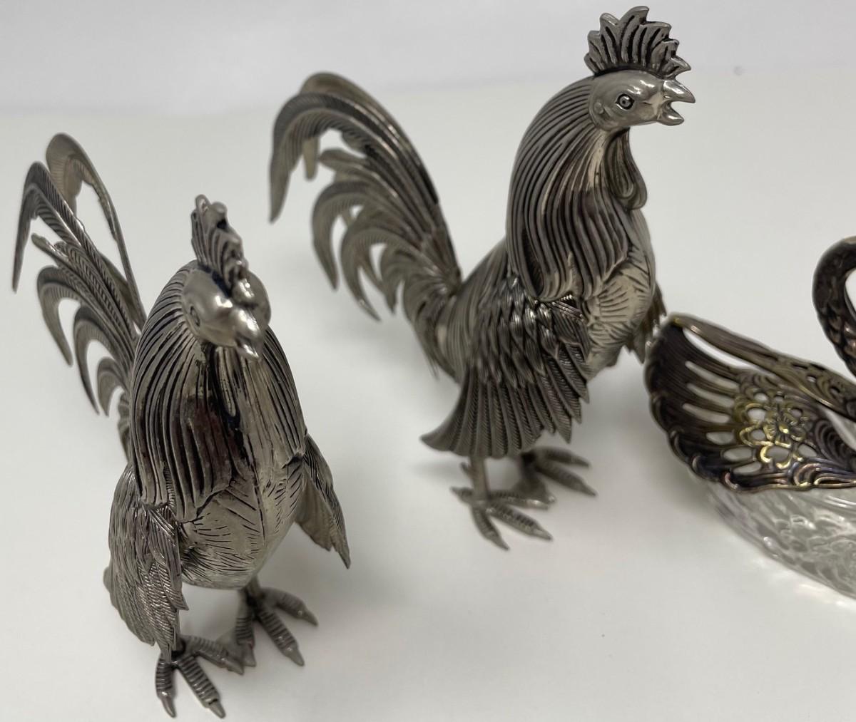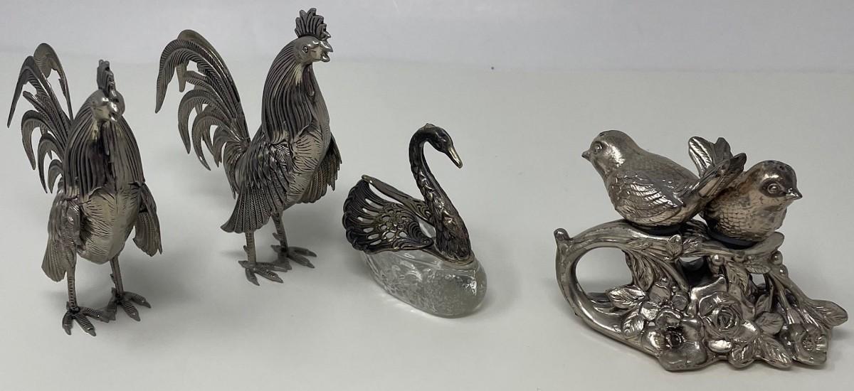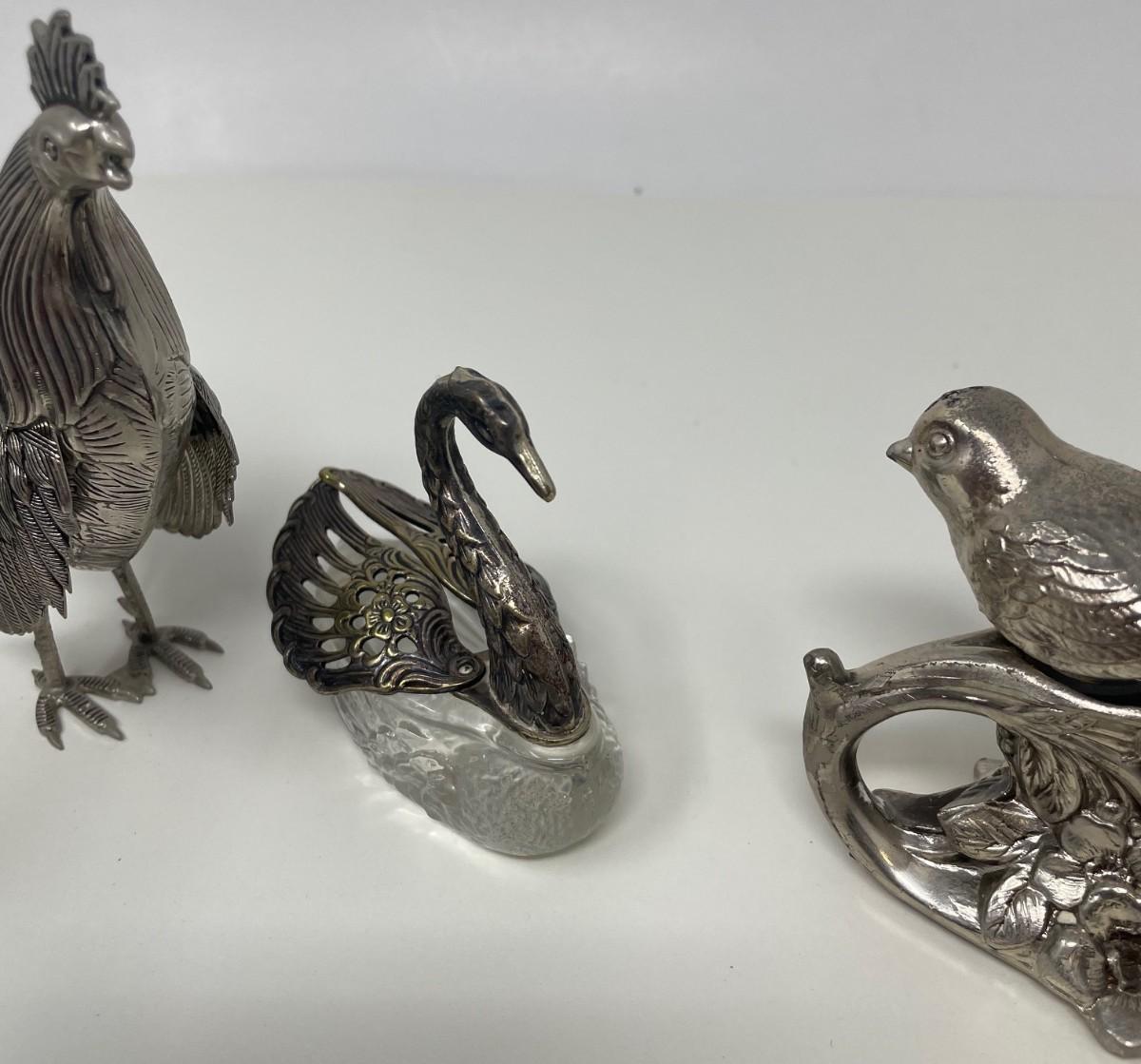 Collection Pair Silverplated Rooster, Swan, and Two Birds Stopper